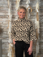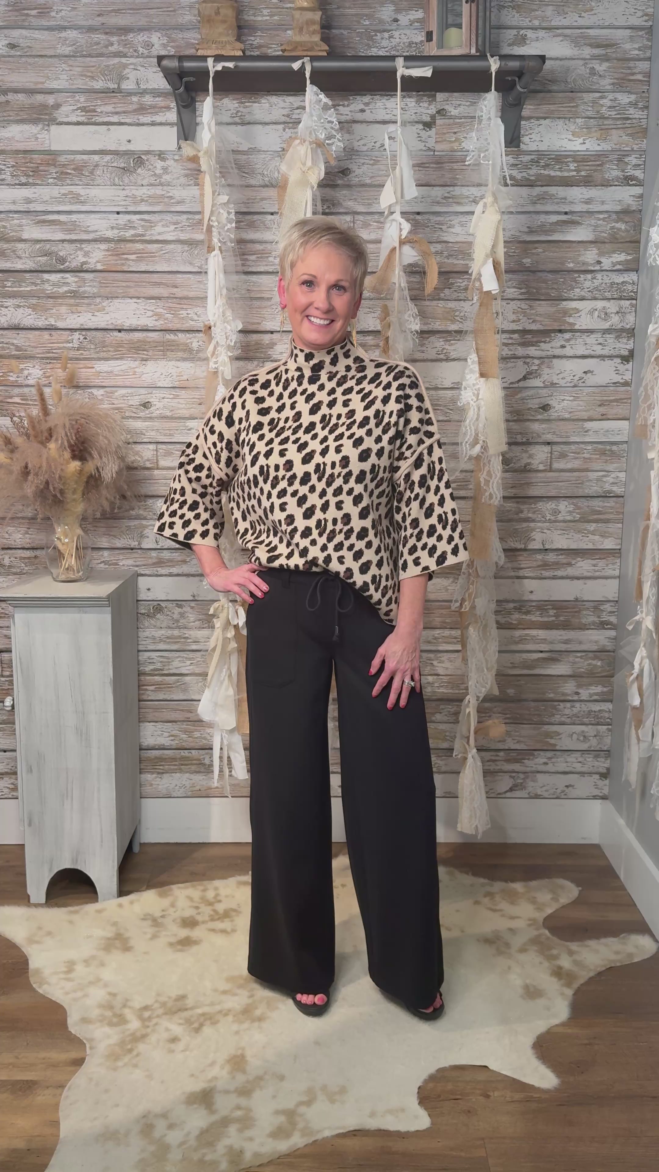 Fierce meets sophisticated in the Untamed Luxe Mock Neck Sweater. With its bold leopard print and chic mock neckline, this relaxed silhouette strikes the perfect balance of wild energy and elevated style. The wide sleeves and easy drape make it as comfortable as it is eye-catching—ideal for pairing with sleek black denim, leather pants, or even a skirt when you’re ready to unleash your inner style predator.