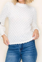 A beautiful option for layering or wearing solo, this mock neck textured top blends elegance with everyday versatility.