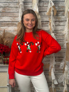Bring on the festive cheer 🎄✨ This cozy red sweater features playful sequin candy cane detailing across the front for the perfect touch of holiday sparkle. Designed with a classic crew neckline and a relaxed, easy fit, it’s soft, comfortable, and ideal for all-day wear. Style it with white denim for a crisp winter look or dress it down with your favorite jeans for casual holiday gatherings. Perfect for Christmas parties, family photos, or spreading cheer wherever you go.