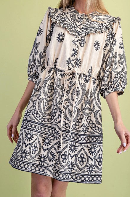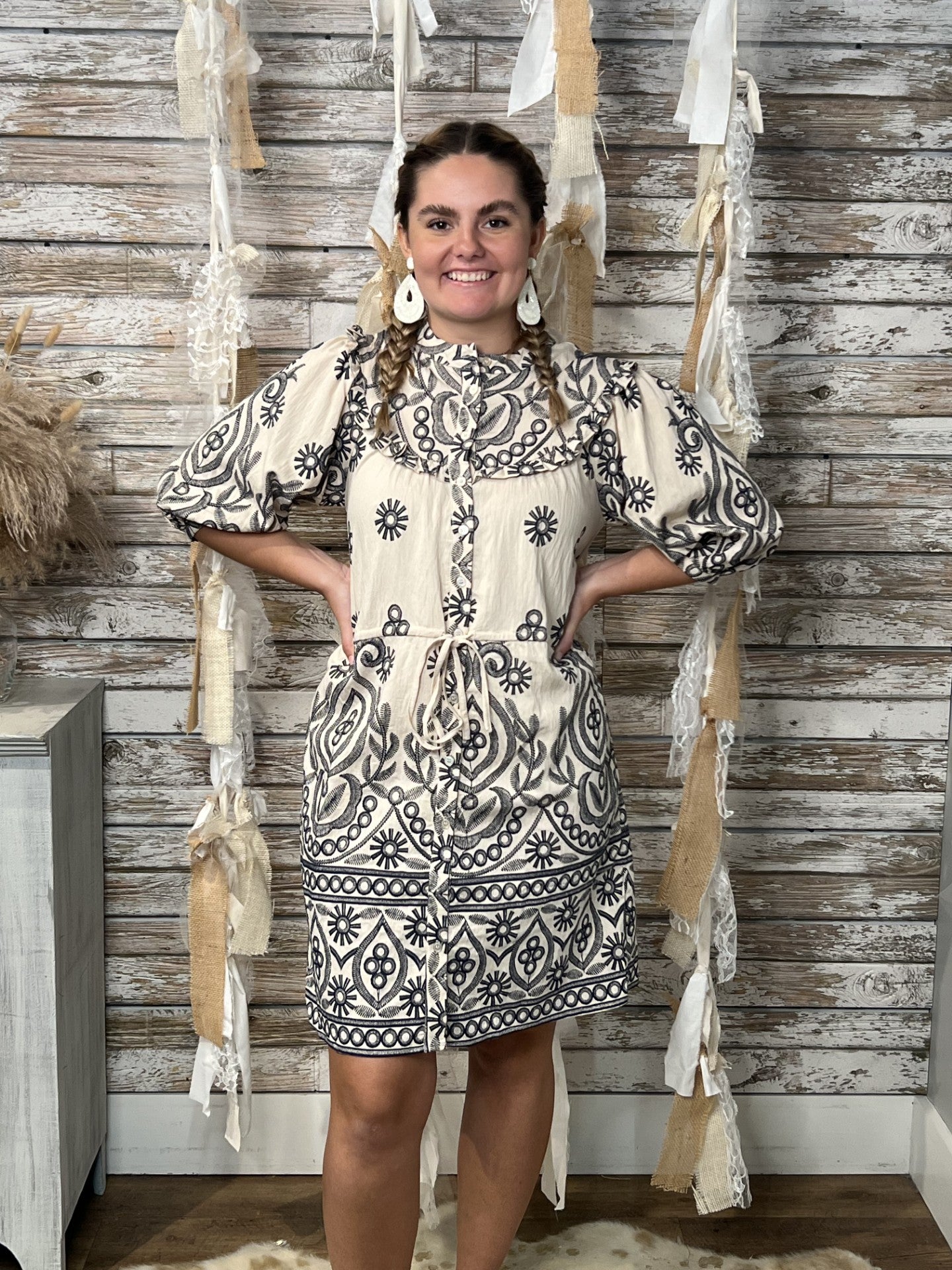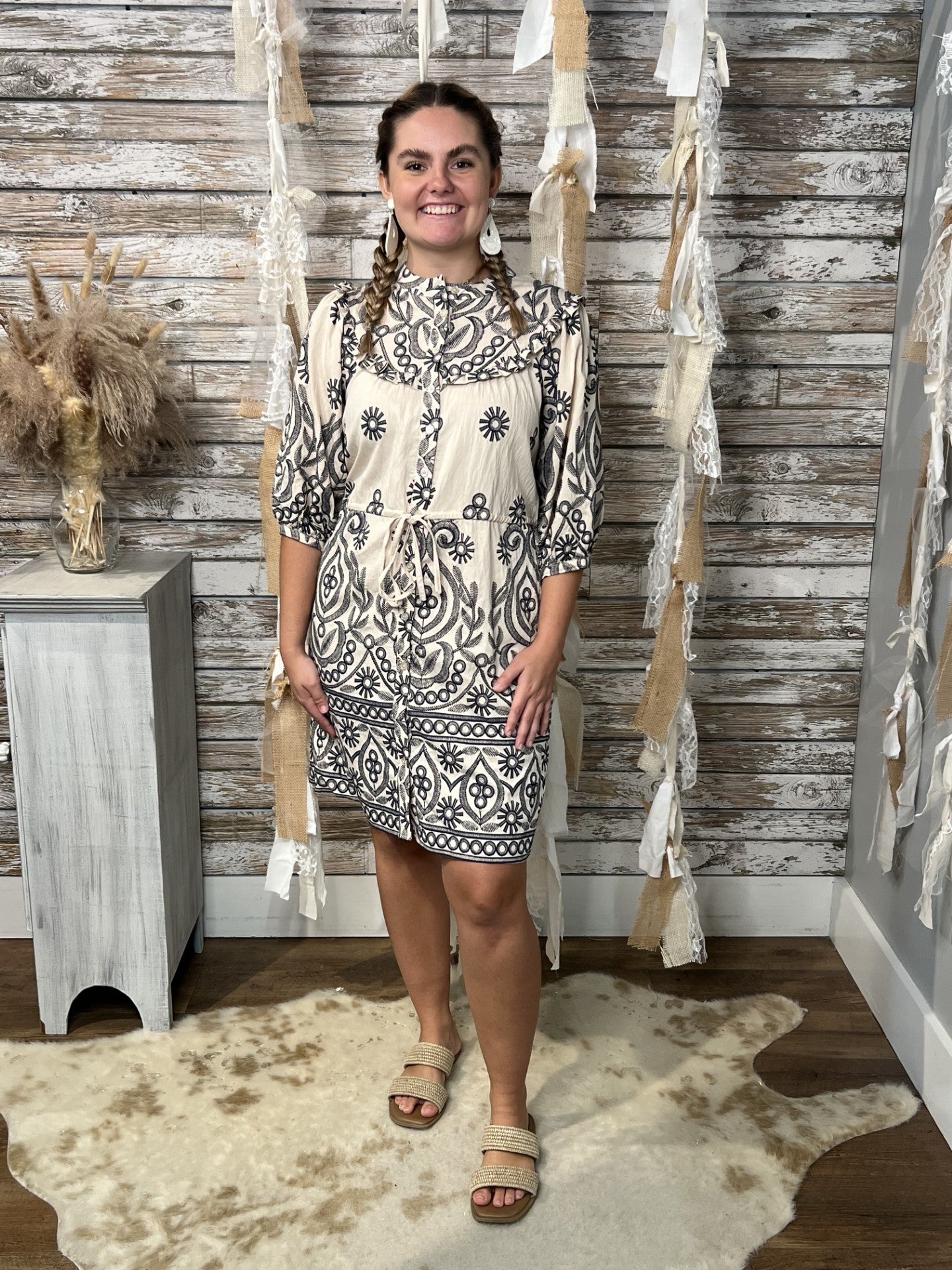 Feminine meets folk-inspired charm in the Midnight Meadow Dress. Featuring an intricate textured print in timeless black and cream, this button-down dress is detailed with soft ruffles along the neckline and a flattering tie waist for a touch of shape. Balloon sleeves add a romantic silhouette, while the flowy fit keeps it comfortable and chic. Perfect for a day-to-night transition, it’s a piece that makes a statement with ease.