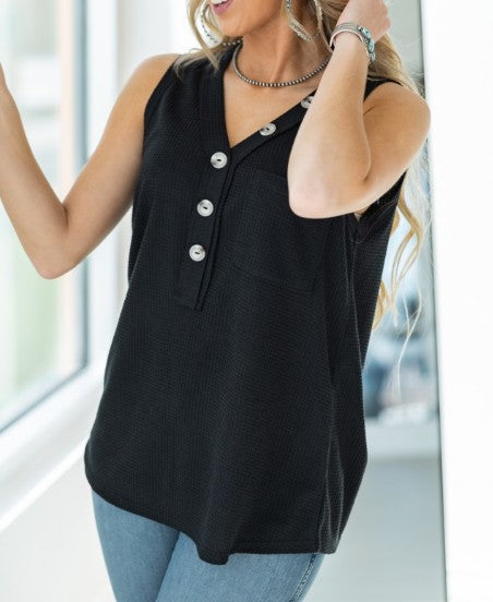 A fun twist on a classic! The Button Up Babe is your go-to sleeveless top with all the right details—waffle knit texture, cute button-down front, and playful front pockets for a touch of charm. Made with a soft, stretchy blend that's never sheer, it's comfy enough to lounge in but cute enough to wear out. Style it your way—tucked, tied, or layered up!
