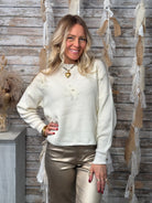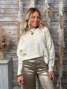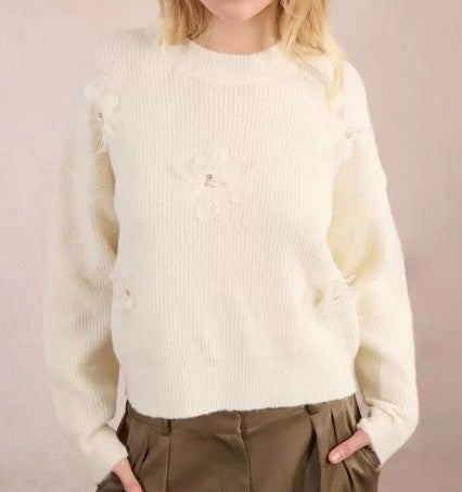 Soft, cozy, and beautifully refined — the Bloom Luxe Sweater brings a touch of romance to your everyday style. Crafted in a plush knit, this ivory pullover is adorned with delicate floral appliqués accented by subtle embellishments for just the right amount of sparkle. Effortlessly chic with trousers or dressed down with denim, it’s the sweater that turns comfort into elegance.