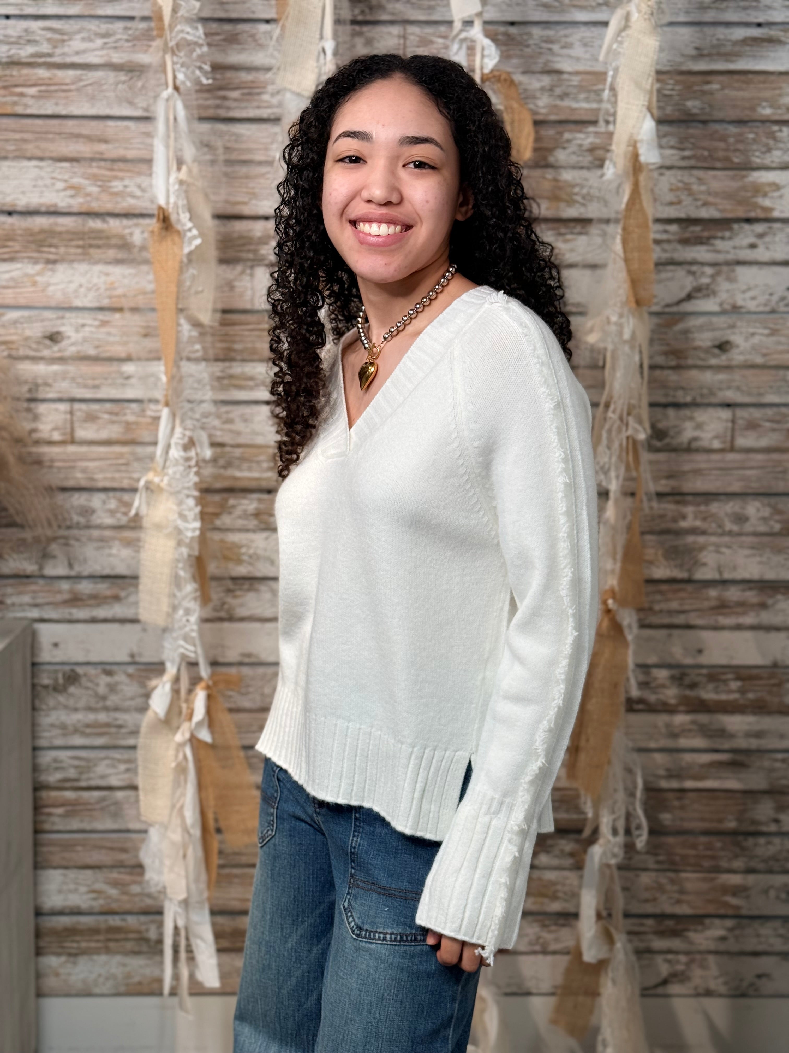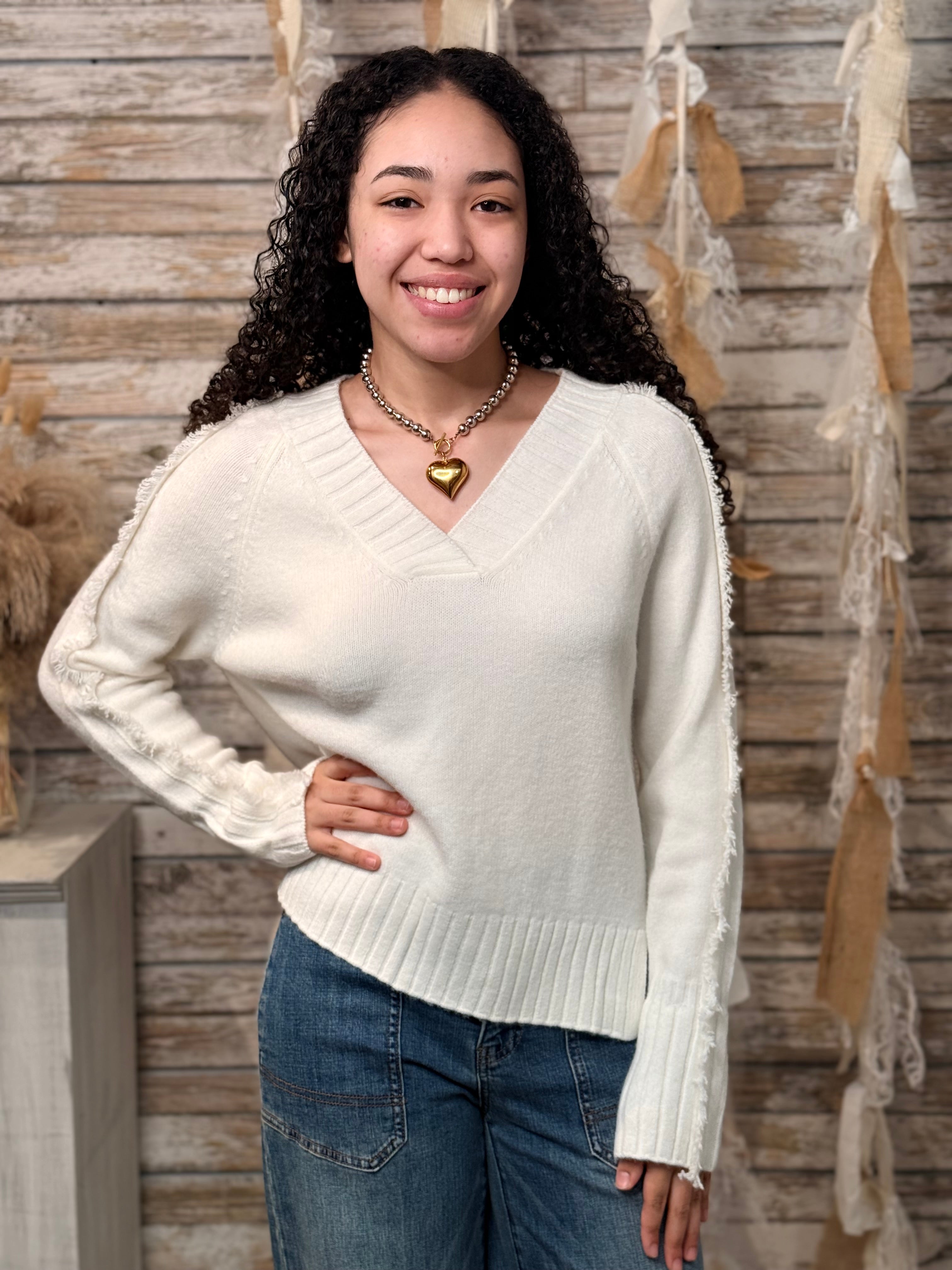 Cozy gets a bold update in the Frost Fringe V-Neck Sweater. This statement knit, now in a crisp winter white, brings texture and movement to your cold-weather wardrobe with tonal fringe detailing that trails down the sleeves for just the right amount of edge. A deep V-neckline, dropped shoulders, and a relaxed fit make it effortlessly flattering and endlessly comfortable.