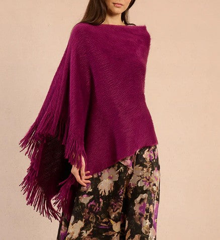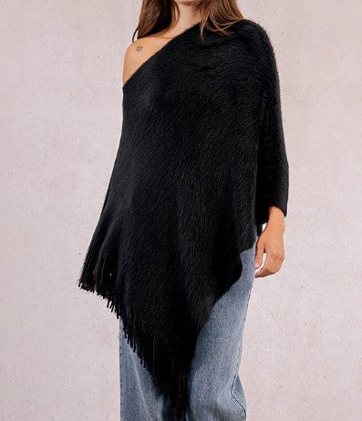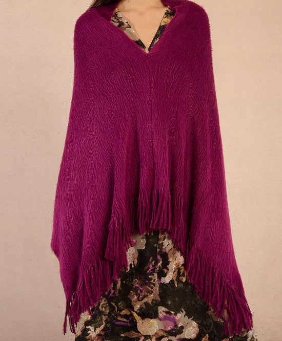 Wrap yourself in rich, radiant comfort with our Luxe Fringe Poncho — a one-size wonder in a deep magenta hue that turns cozy into chic. Soft to the touch and effortlessly draped, it features a flattering wide V-neck, asymmetrical hem, and playful fringe that moves with every step. The perfect pop of color to elevate jeans, dresses, or sleek trousers — a must-have layer for fall soirées and fireside evenings.