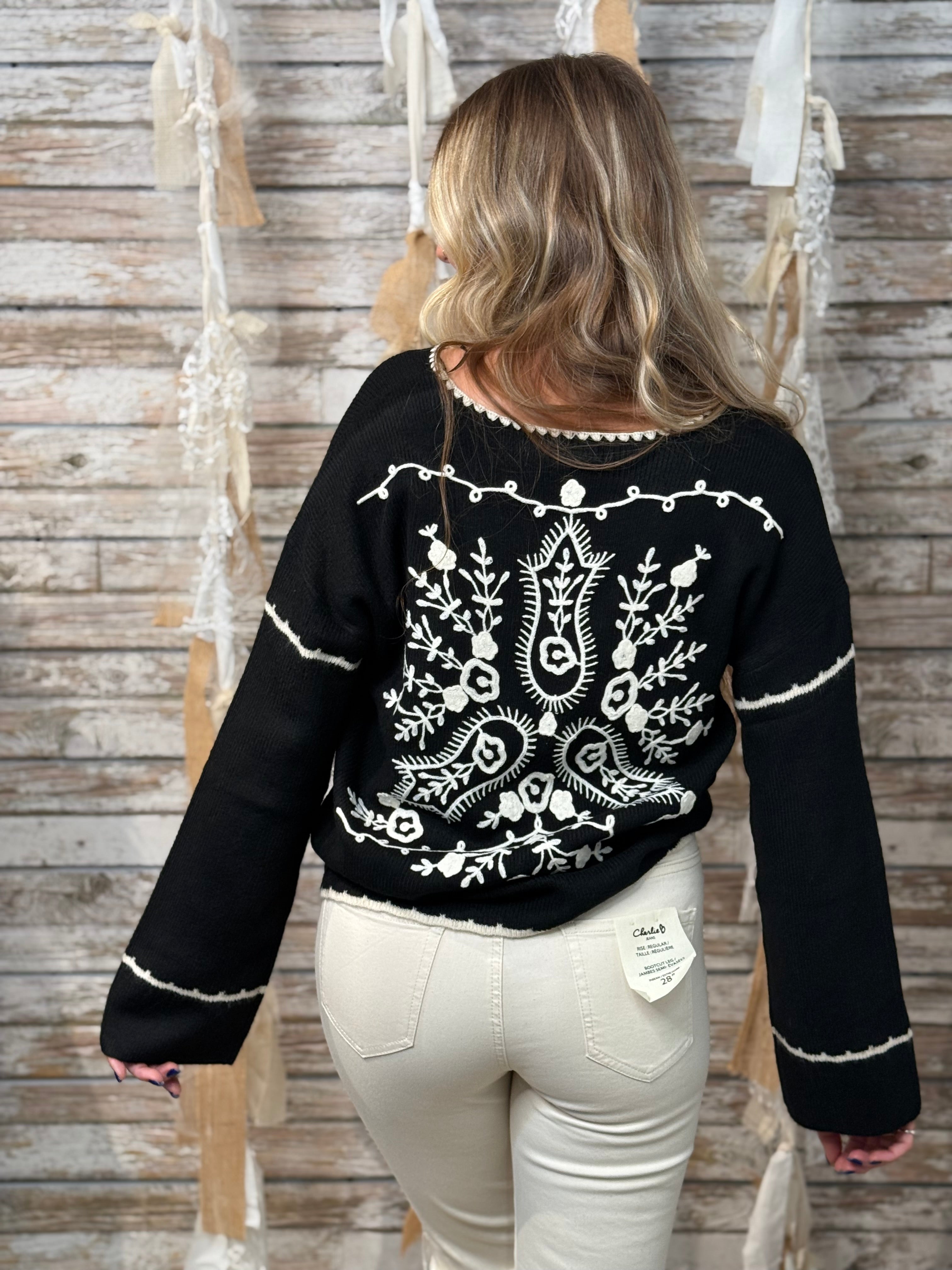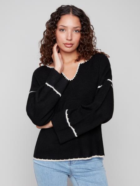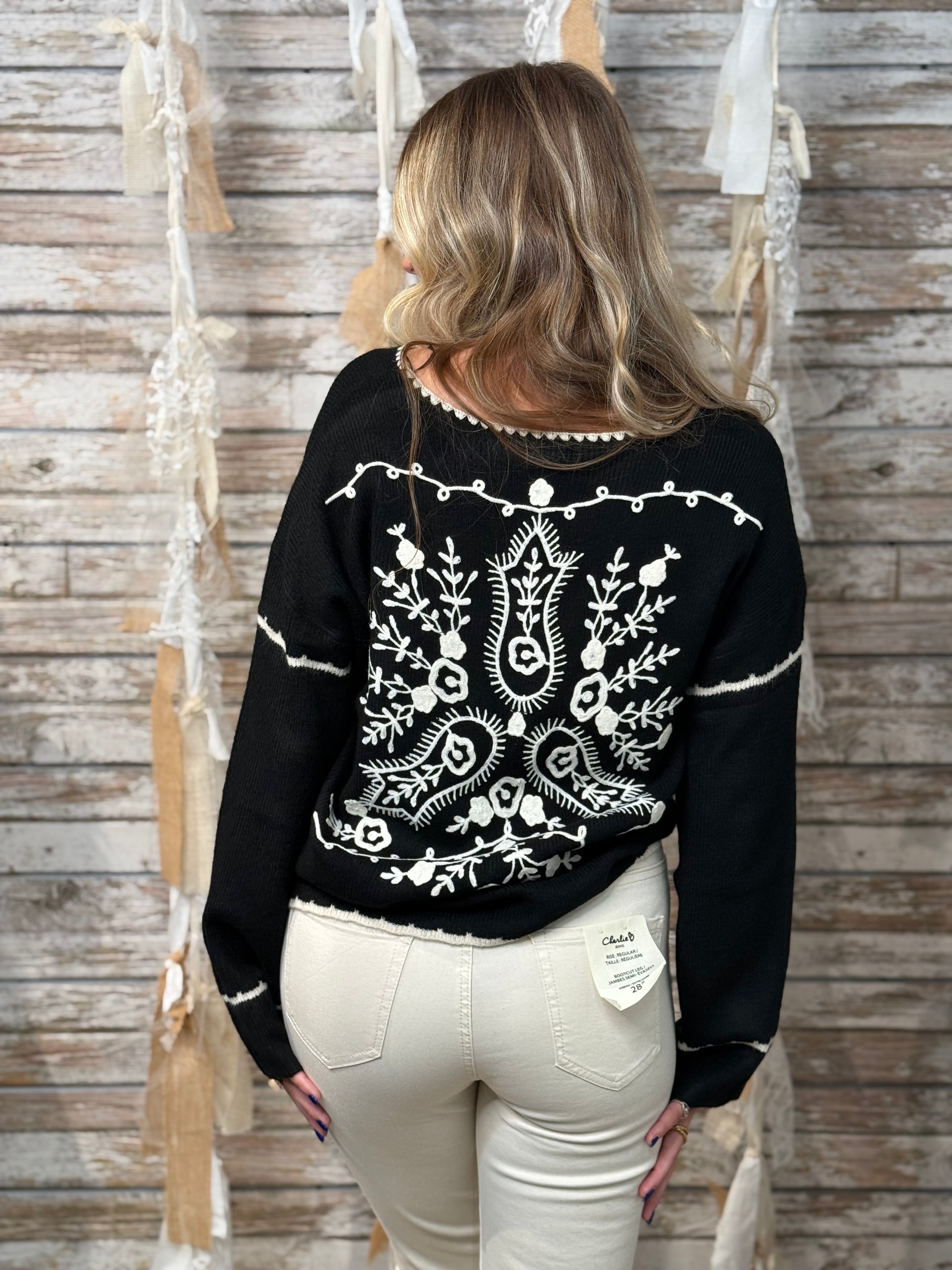 The Midnight Edge Sweater blends cozy texture with modern detail. Featuring a ribbed knit design and a flattering V-neck with a subtle notch, it’s finished with contrasting soutache trim that adds a crisp pop against the black. Relaxed sleeves and an easy fit make it a versatile piece—perfect with denim for casual days or dressed up with statement jewelry for an evening edge.