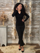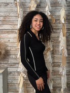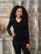 Elevate your everyday with this sleek ribbed knit, designed with a modern collared V-neckline and subtle racing-stripe details down the sleeves. Fitted but stretchy, it’s the perfect balance of sporty and chic — pair it with denim for weekend cool or layer it under a jacket for a polished finish.