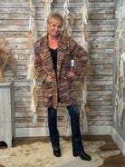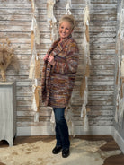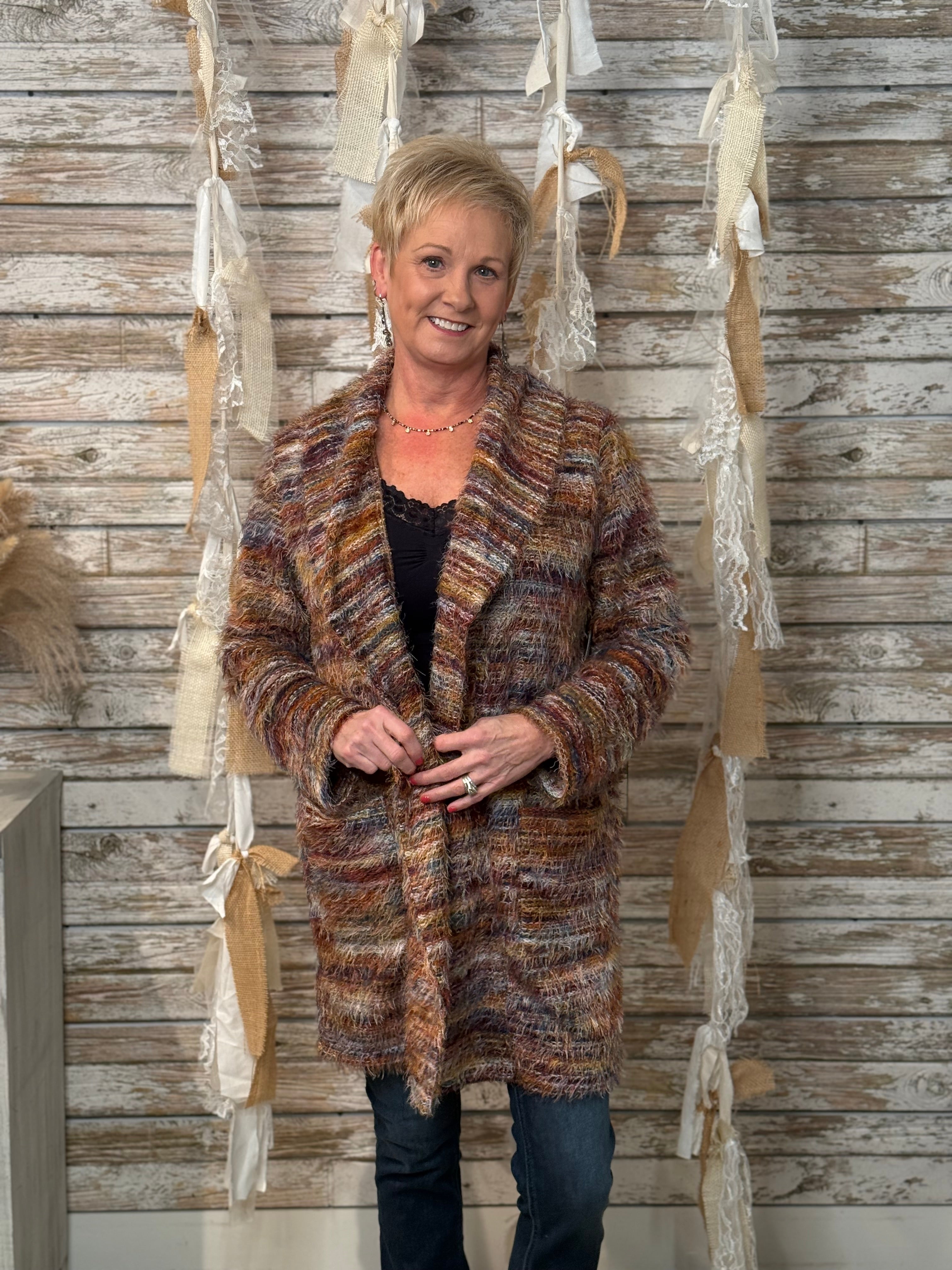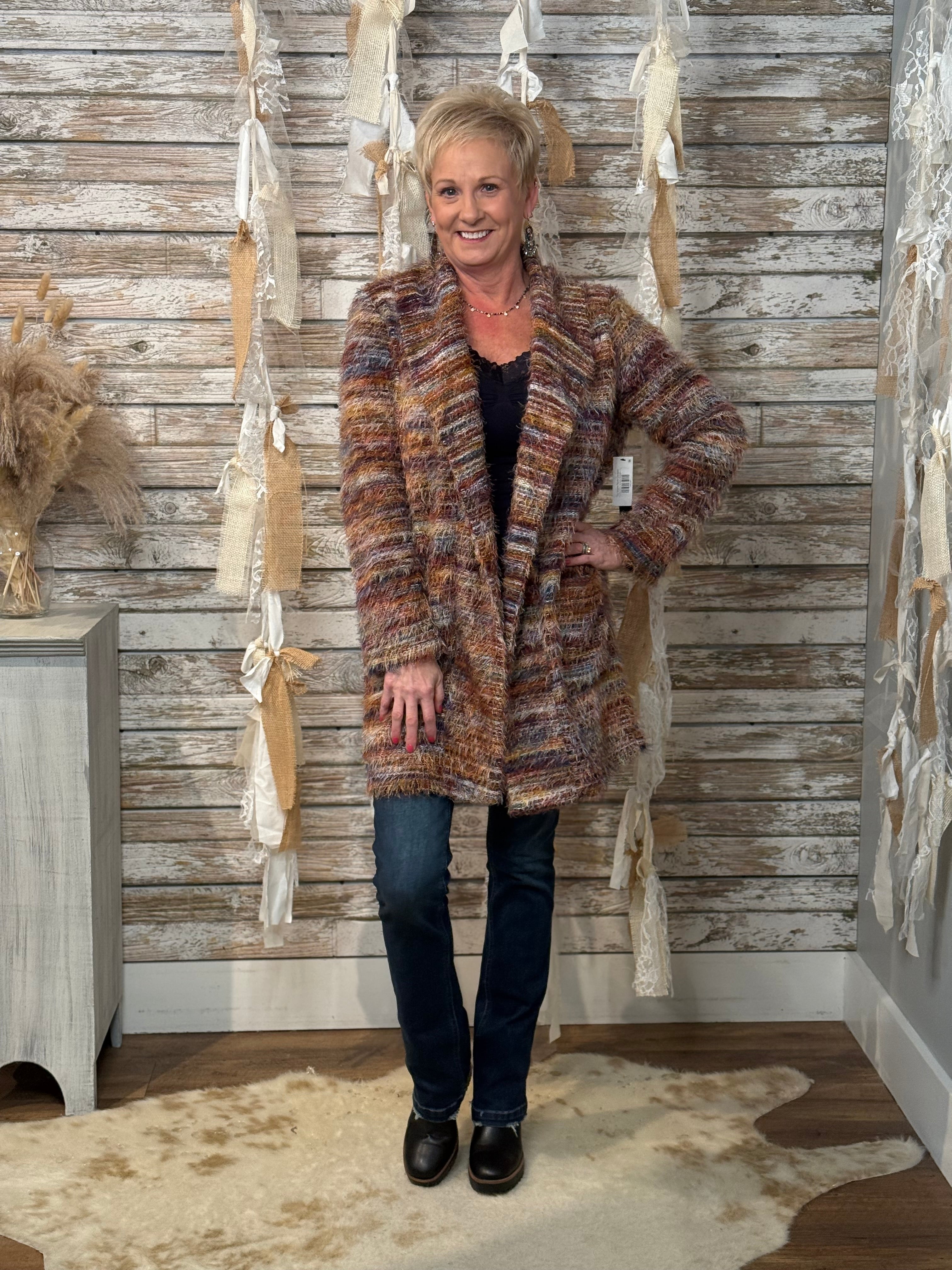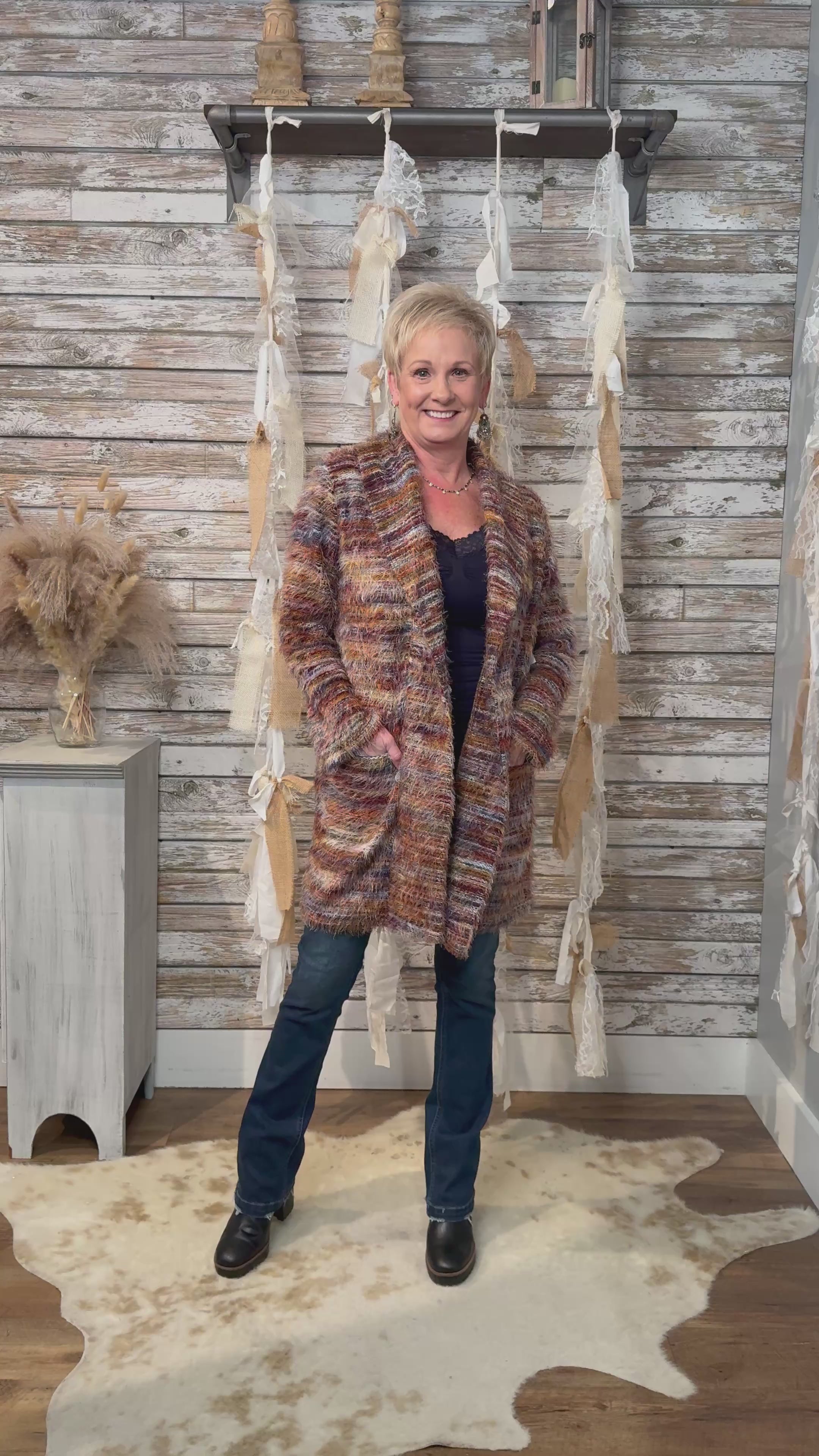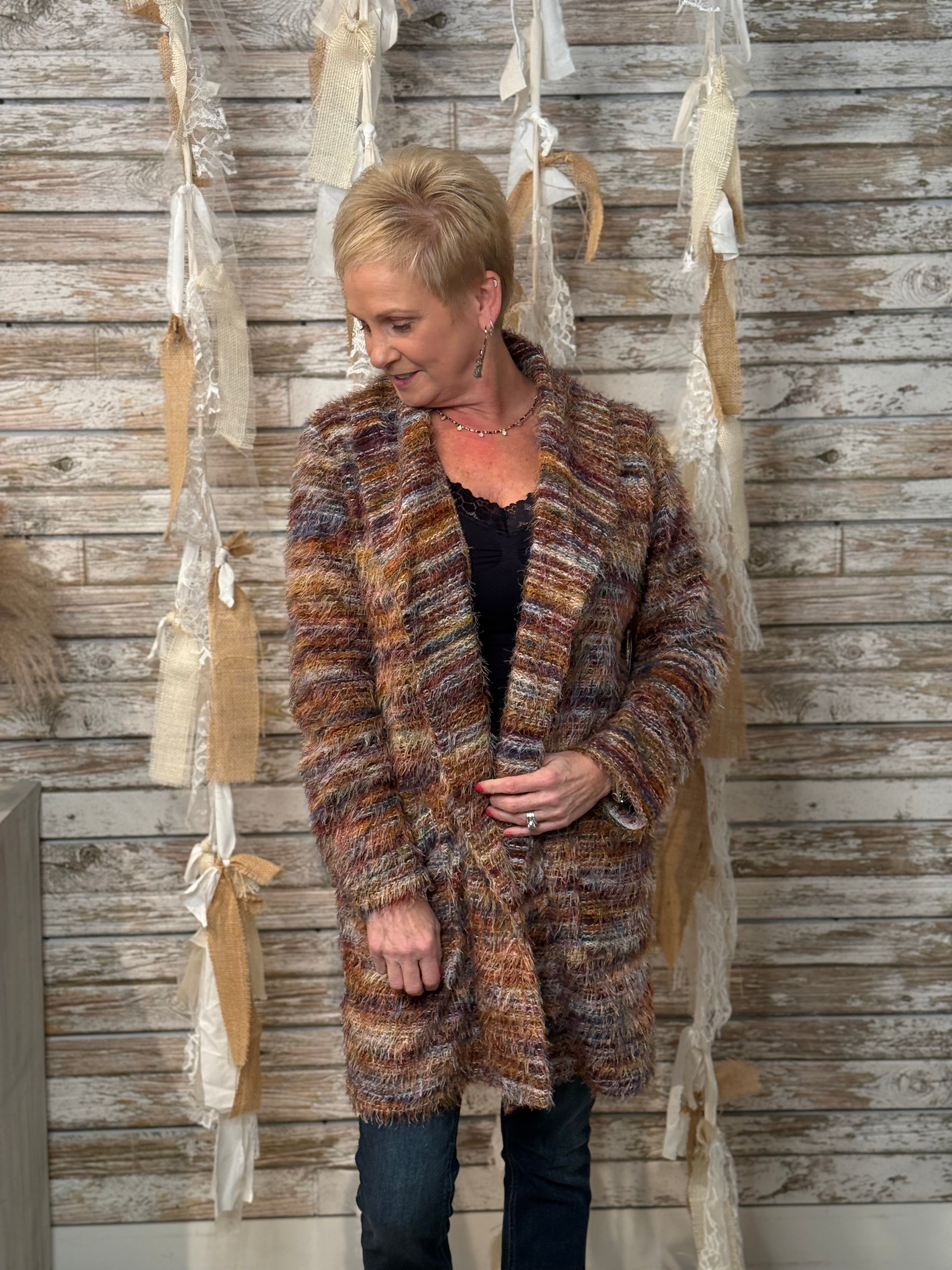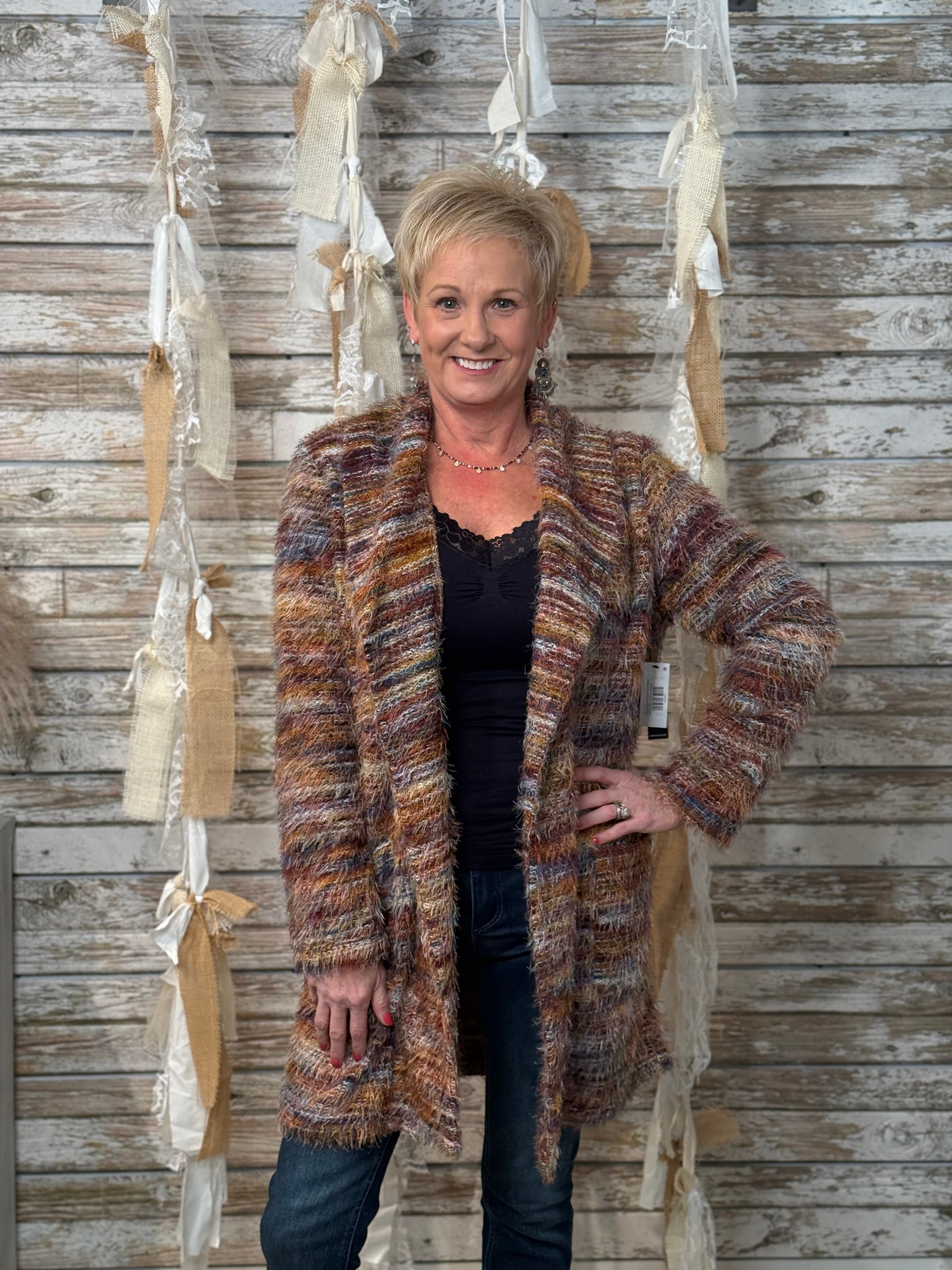 Cozy meets captivating in The Autumn Muse Cardigan. This long-sleeve open-front beauty features a rich tapestry of multicolored yarns with a soft, eyelash texture that feels like fall wrapped around you. The relaxed silhouette drapes effortlessly for a flattering, easy fit — perfect for layering over everything from denim to dress pants. A statement in texture and tone, it’s your go-to piece for adding warmth, comfort, and color to any look.