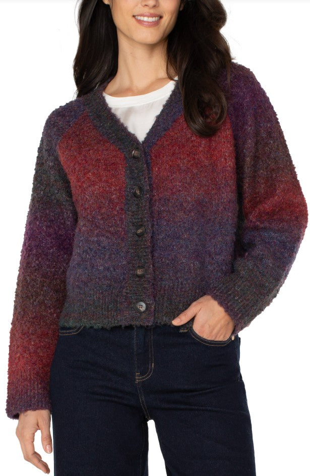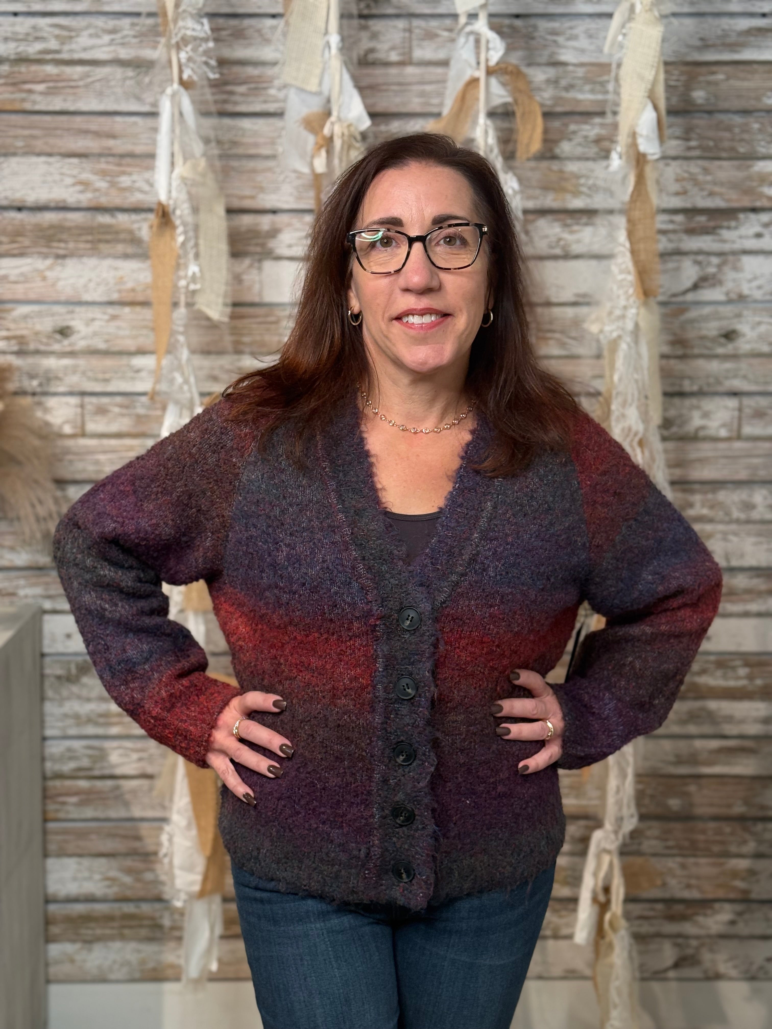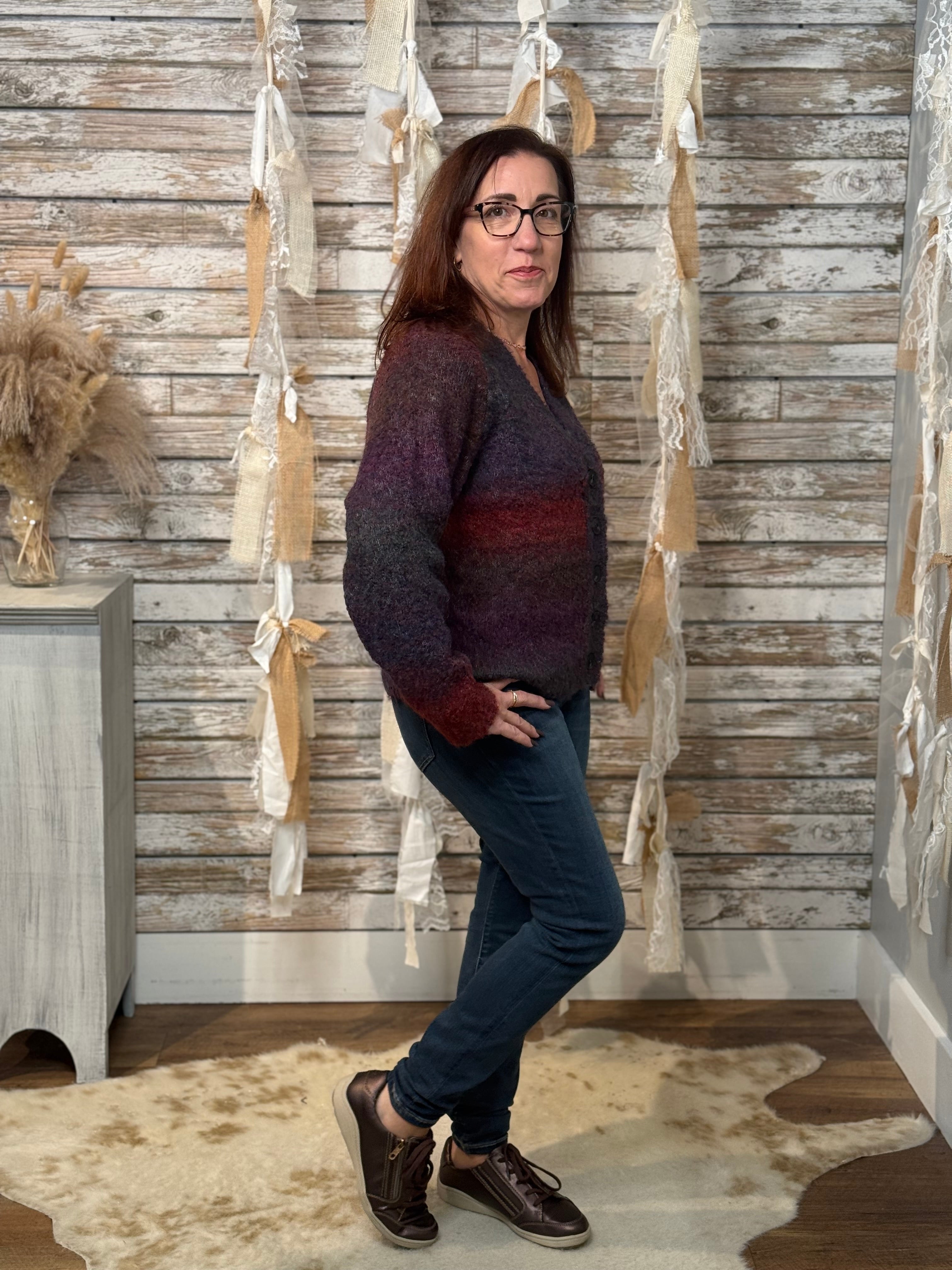 Wrap yourself in cozy color with The Ember Haze Cardigan. This soft, textured button-up features a dreamy ombré blend of deep plum, cranberry, and ember tones that shift beautifully with the light. Designed with raglan sleeves and a relaxed fit, it’s the perfect mix of comfort and charm. Layer it over a tee or turtleneck for that effortlessly cool, artsy vibe that works from coffee runs to cozy nights in.
