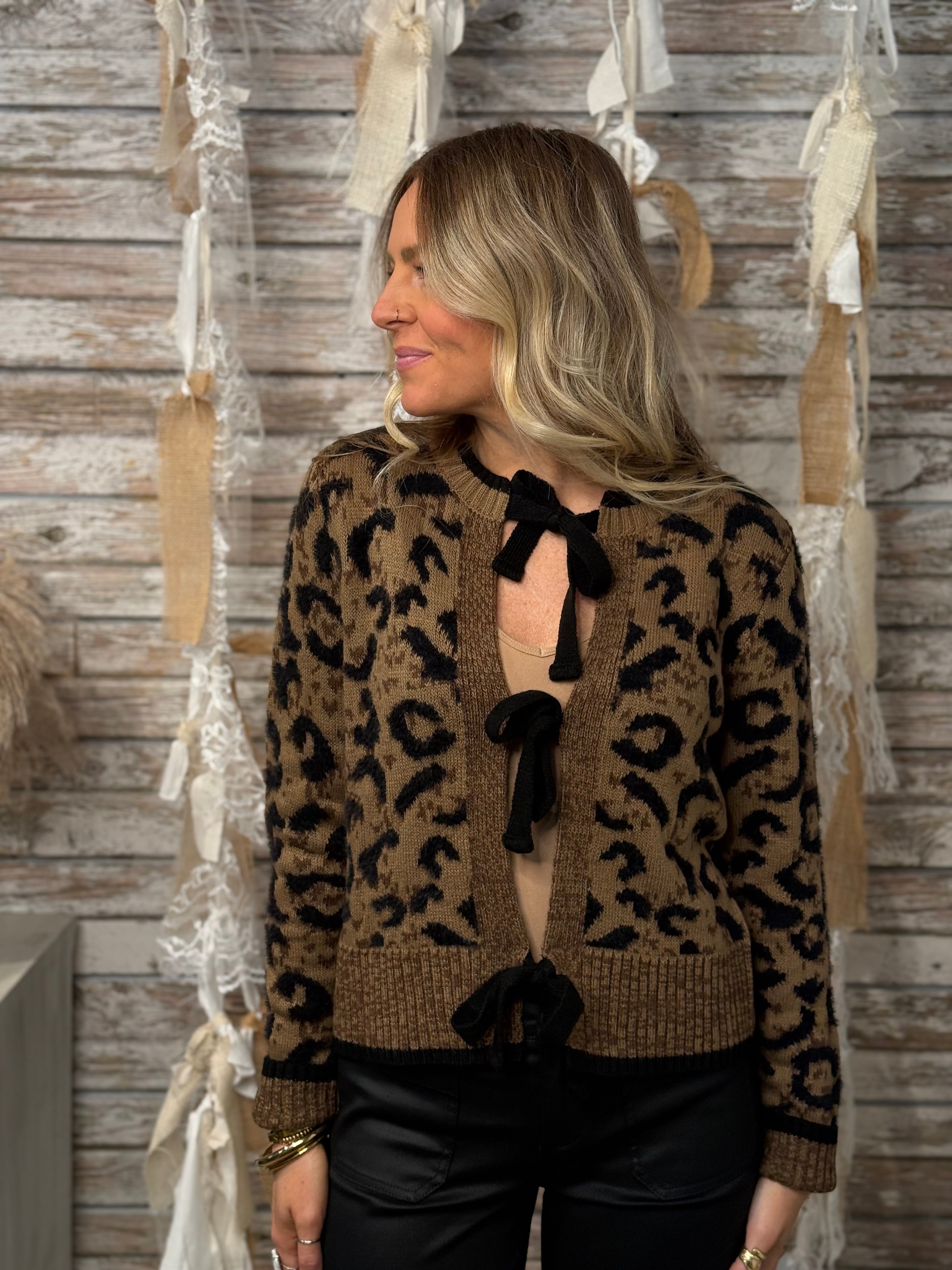 Add a touch of fierce femininity with the Wild Charm Bow Cardigan. This cozy jacquard knit features a bold leopard print and playful bow-tie front closures that strike the perfect balance between sweet and sassy. With its cropped length and contrast trim, it’s a statement piece that elevates your favorite denim or adds edge to a sleek skirt. Flirty, fearless, and unapologetically chic.