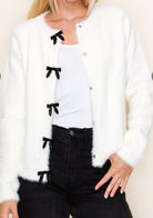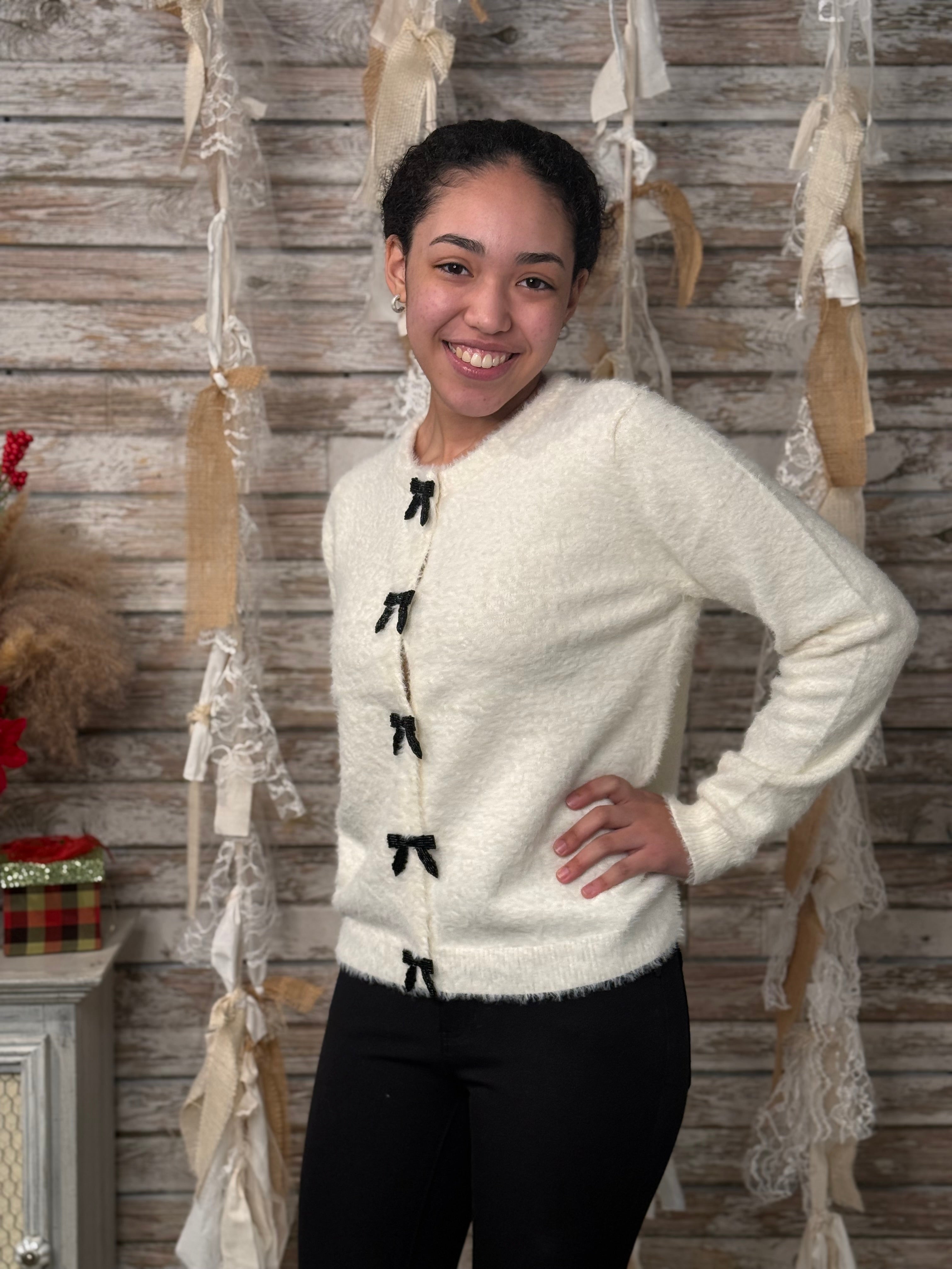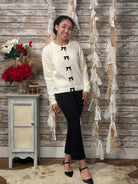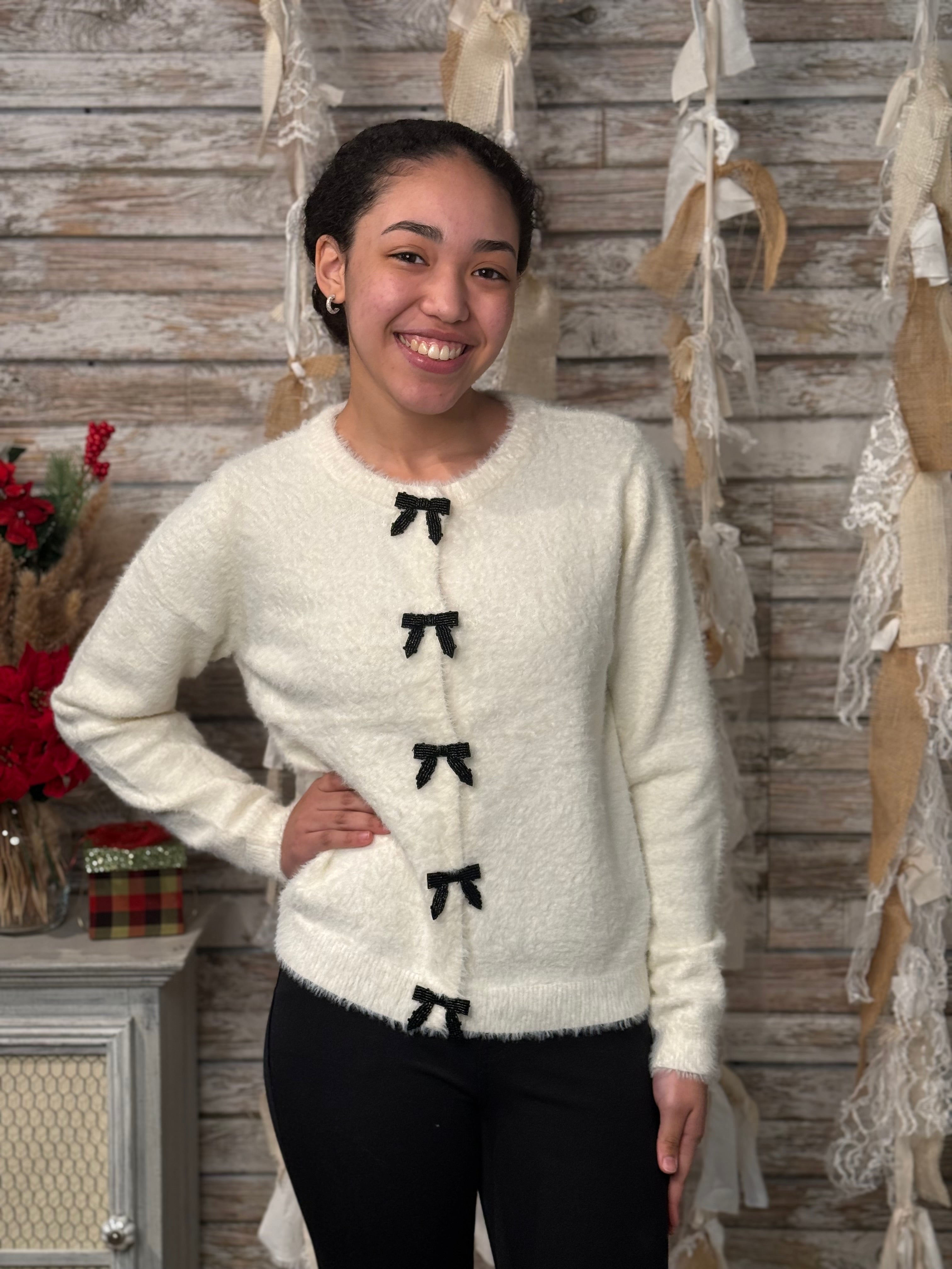The elegant bow trim creates eye-catching detail along the front, while the plush knit fabric makes this cardigan warm, comfortable, and perfect for layering. Wear it buttoned up for a polished, elevated look or open over your favorite tops for a stylish, effortless vibe.