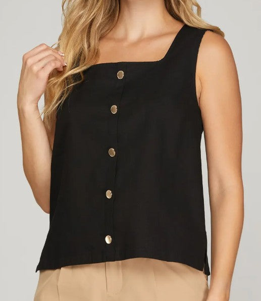 A timeless essential for every wardrobe, this black button-front sleeveless tank offers effortless style with a polished finish. Designed with a flattering square neckline and a relaxed, easy fit, this lightweight top features gold-tone buttons down the front for a chic, elevated look. Perfect for layering or wearing on its own, it pairs beautifully with trousers, denim, skirts, or shorts for workdays, weekends, or nights out.