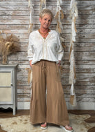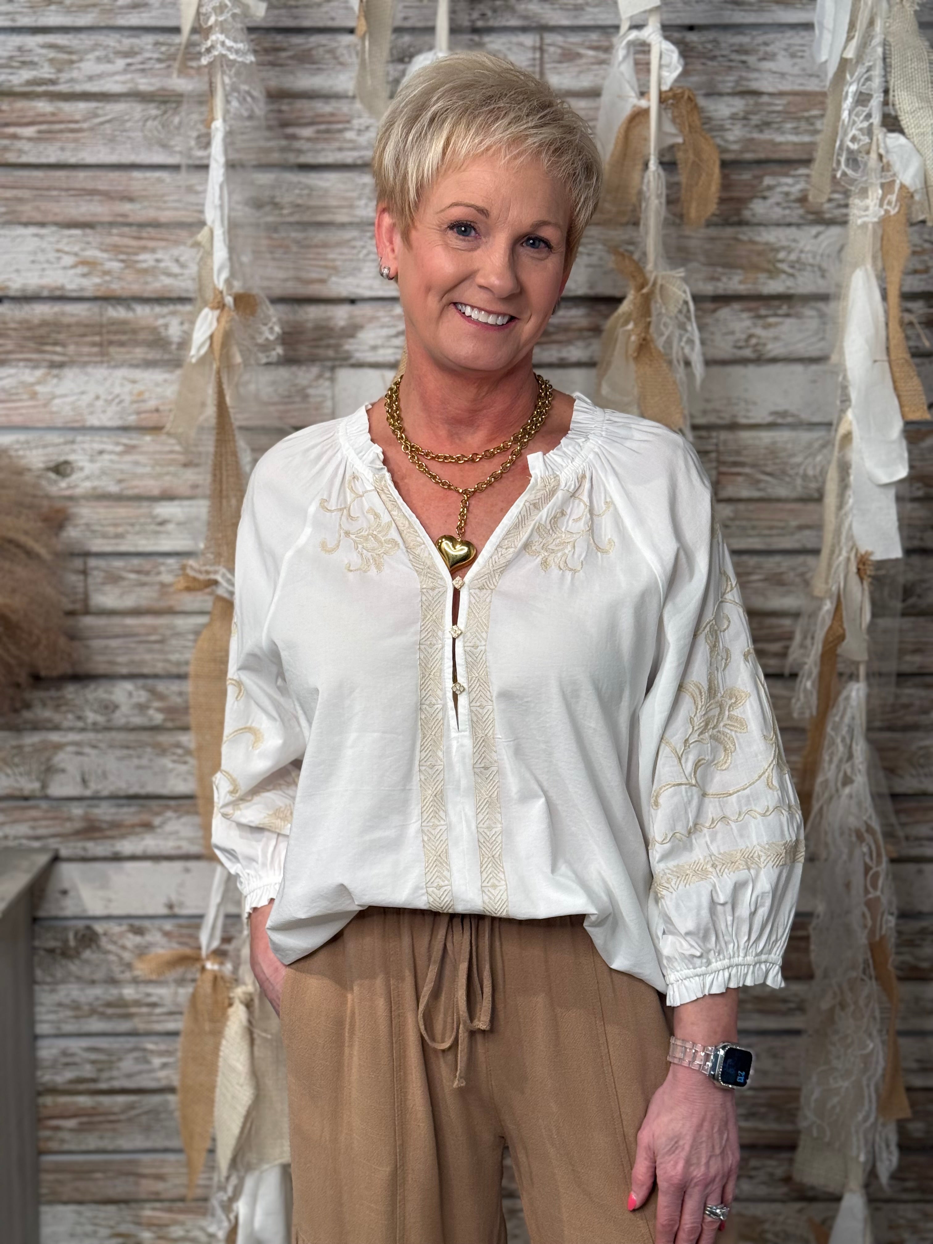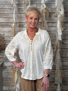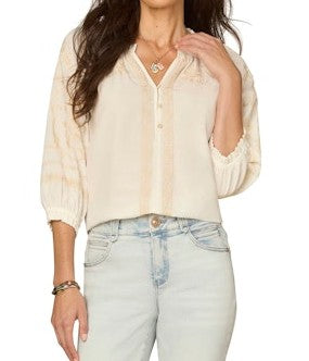 This mixed media top blends delicate details with everyday ease. Designed with 3/4-length blouson sleeves and a soft ruffle-edge neckline, it features a half placket front and beautiful embroidered accents for a touch of artisanal charm. The lightweight fabric drapes effortlessly, making it perfect for pairing with denim, trousers, or skirts for an elevated casual look.