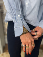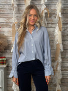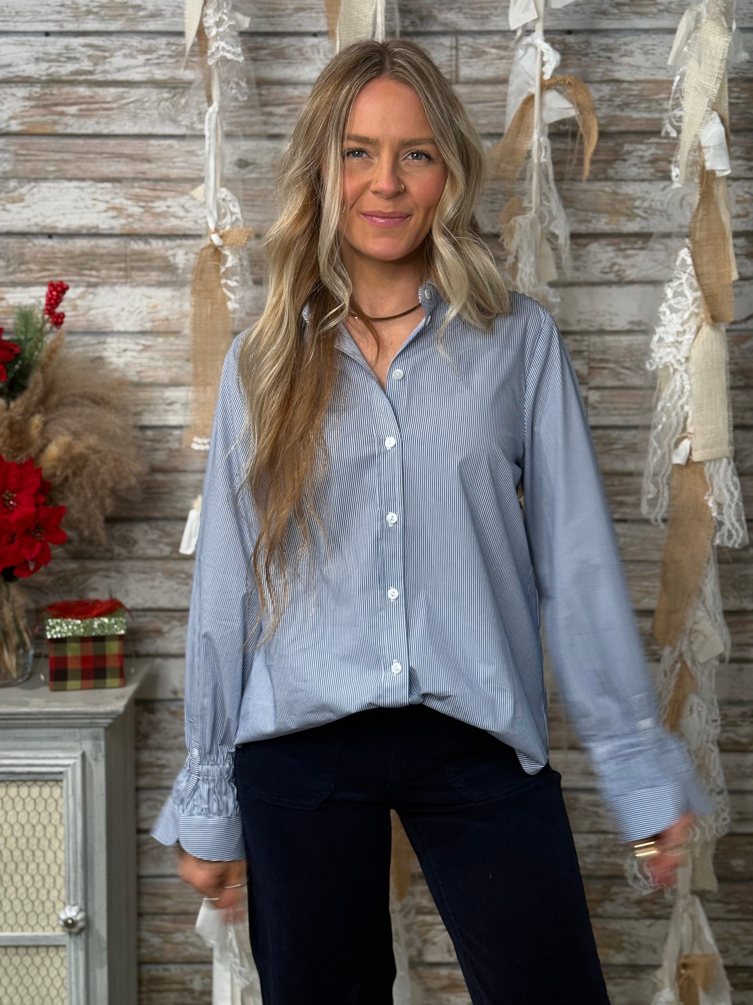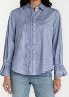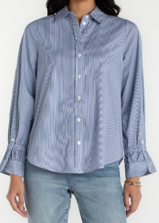The crisp button-front design and subtle blue-and-white stripe pattern give it a timeless, tailored appearance while still keeping things comfortable and easy to wear. Pair it with jeans, trousers, or skirts for endless outfit options.