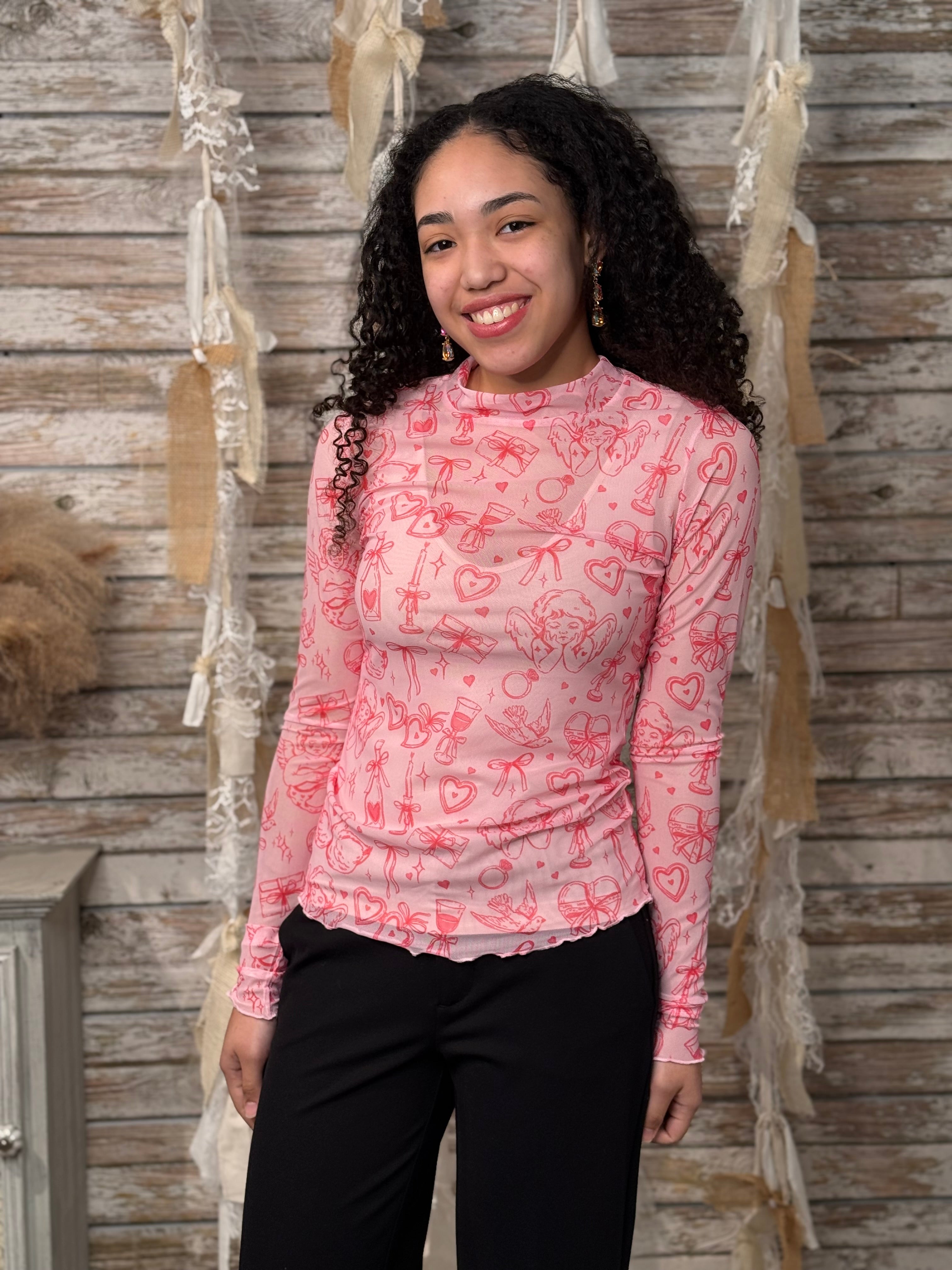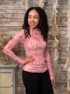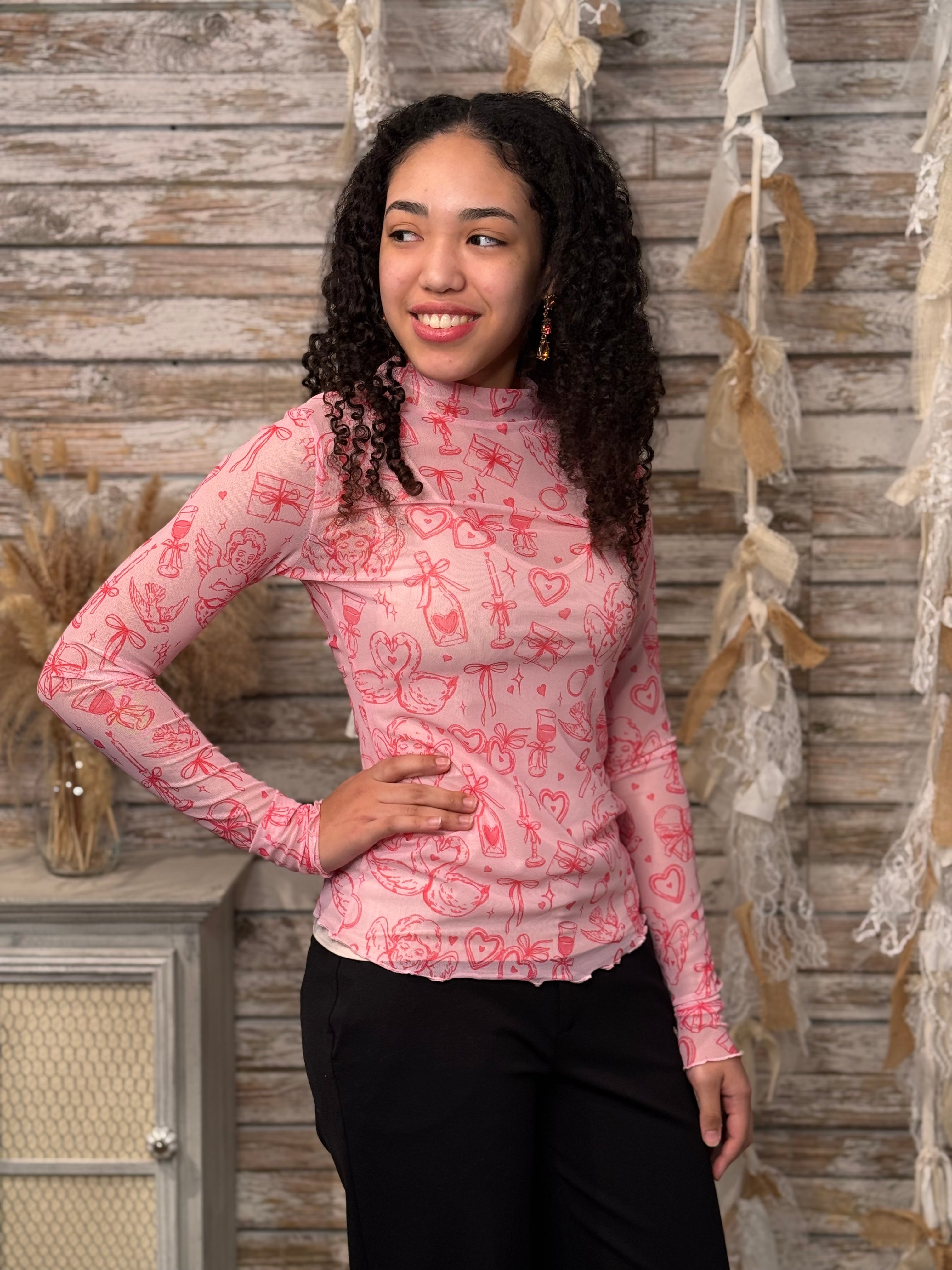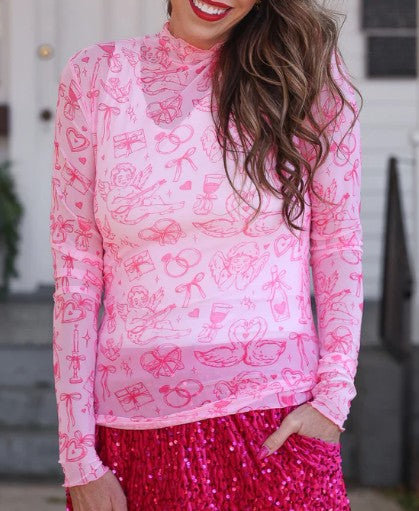 Add a fun, feminine touch to your wardrobe with this Pink Icon Print Mesh Long Sleeve Top. Featuring a lightweight, semi-sheer mesh fabric with an allover whimsical icon print, this fitted top is perfect for layering or making a statement on its own. The soft stretch fabric offers a comfortable, flattering fit, while the mock neckline and long sleeves create a sleek silhouette.