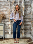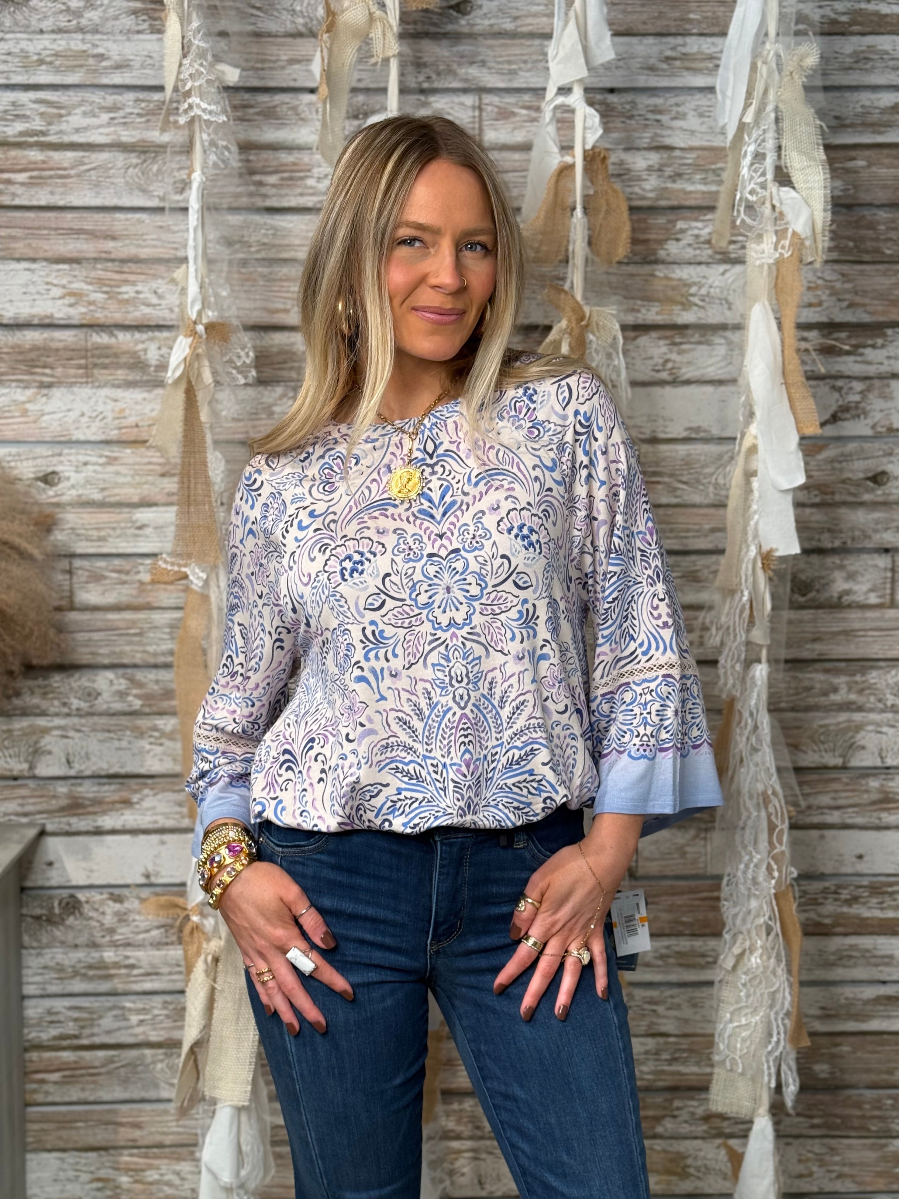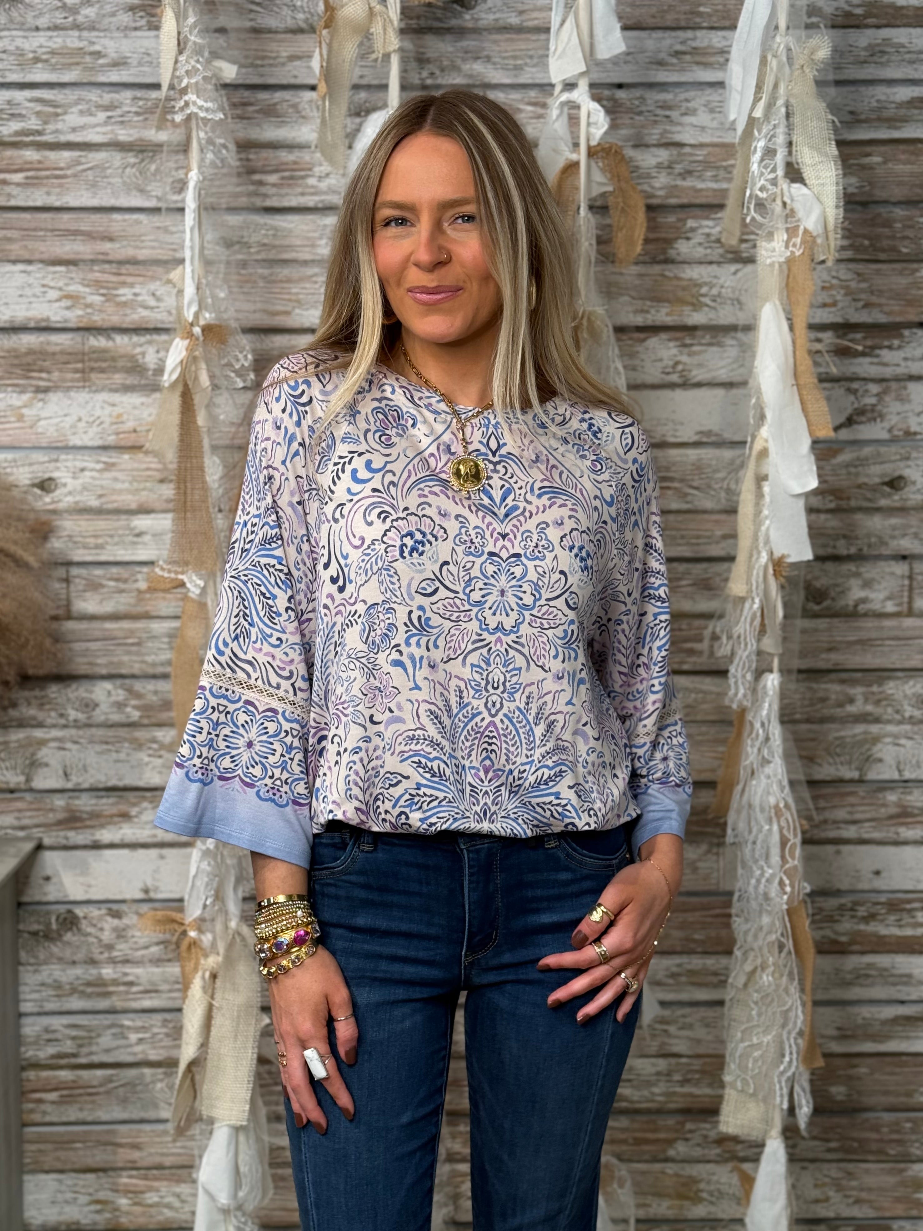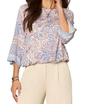 This printed boat neck top brings effortless elegance to your everyday look. Designed with relaxed 3/4-length kimono sleeves and a soft bubble hem, it creates a flattering blouson silhouette without clinging. The airy fit and lightweight fabric make it perfect for warm days, while the beautiful allover print adds a touch of personality. Easy to dress up with trousers or keep casual with denim, this top works from office hours to after-hours.