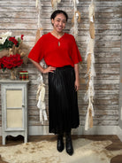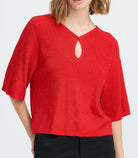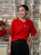 The soft, textured knit fabric gives it a refined finish, ensuring it pairs beautifully with denim, trousers, or skirts. If you’re searching for a red knit top, keyhole neckline blouse, or elbow sleeve sweater knit, this piece delivers versatile style for every season.