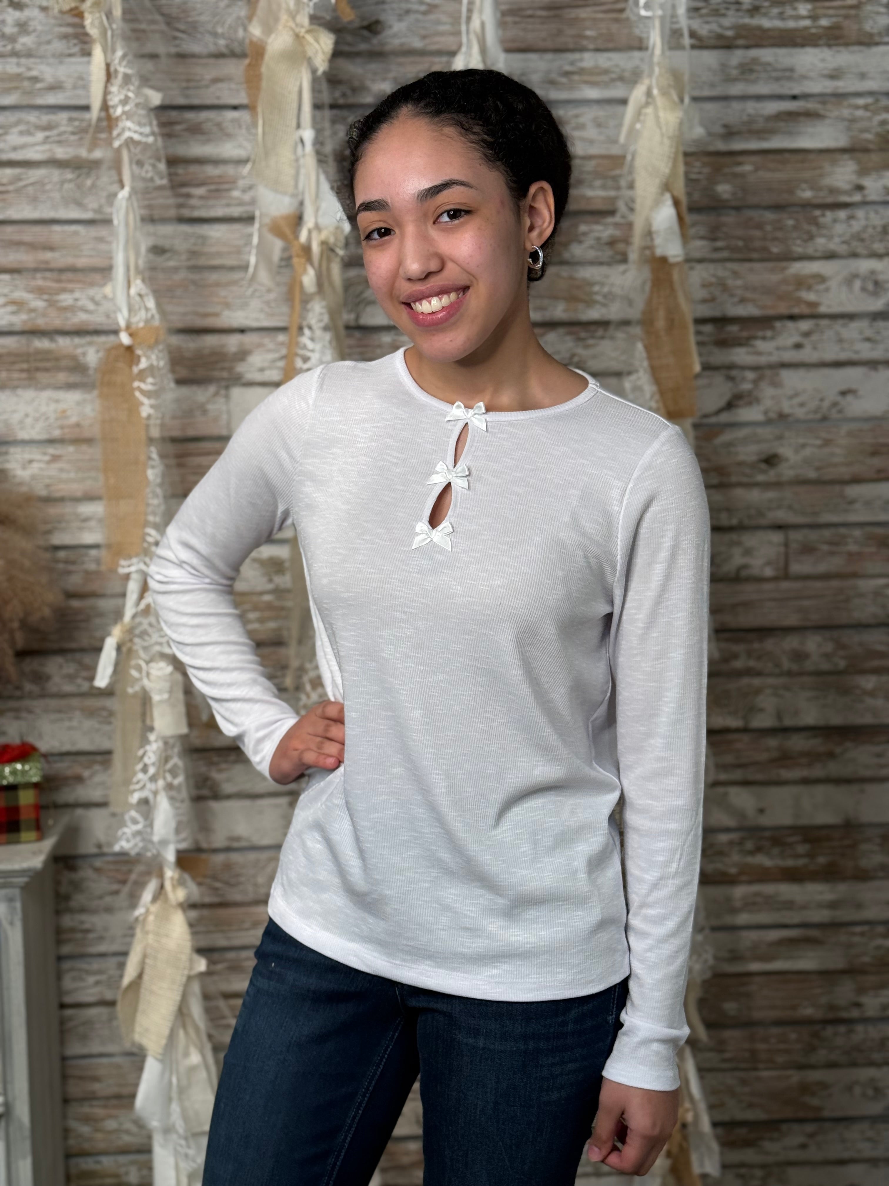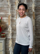 This women’s keyhole neck top adds a polished twist to a classic long sleeve tee. Made from a soft slub knit fabric, it offers lightweight comfort with a subtly textured look. The neckline features three keyhole cutouts accented with satin tape, giving the top a touch of elegance while keeping it easy for everyday wear.