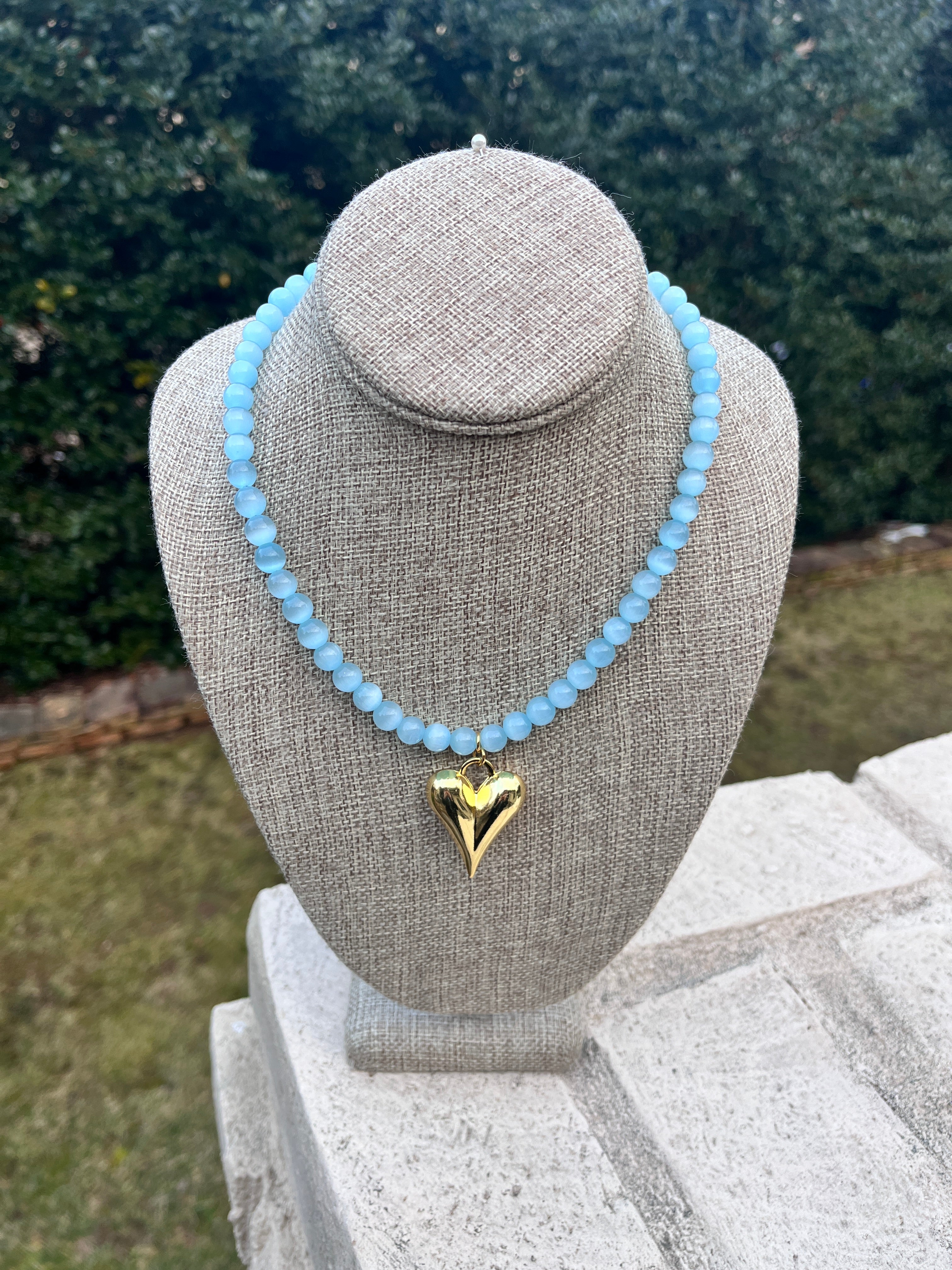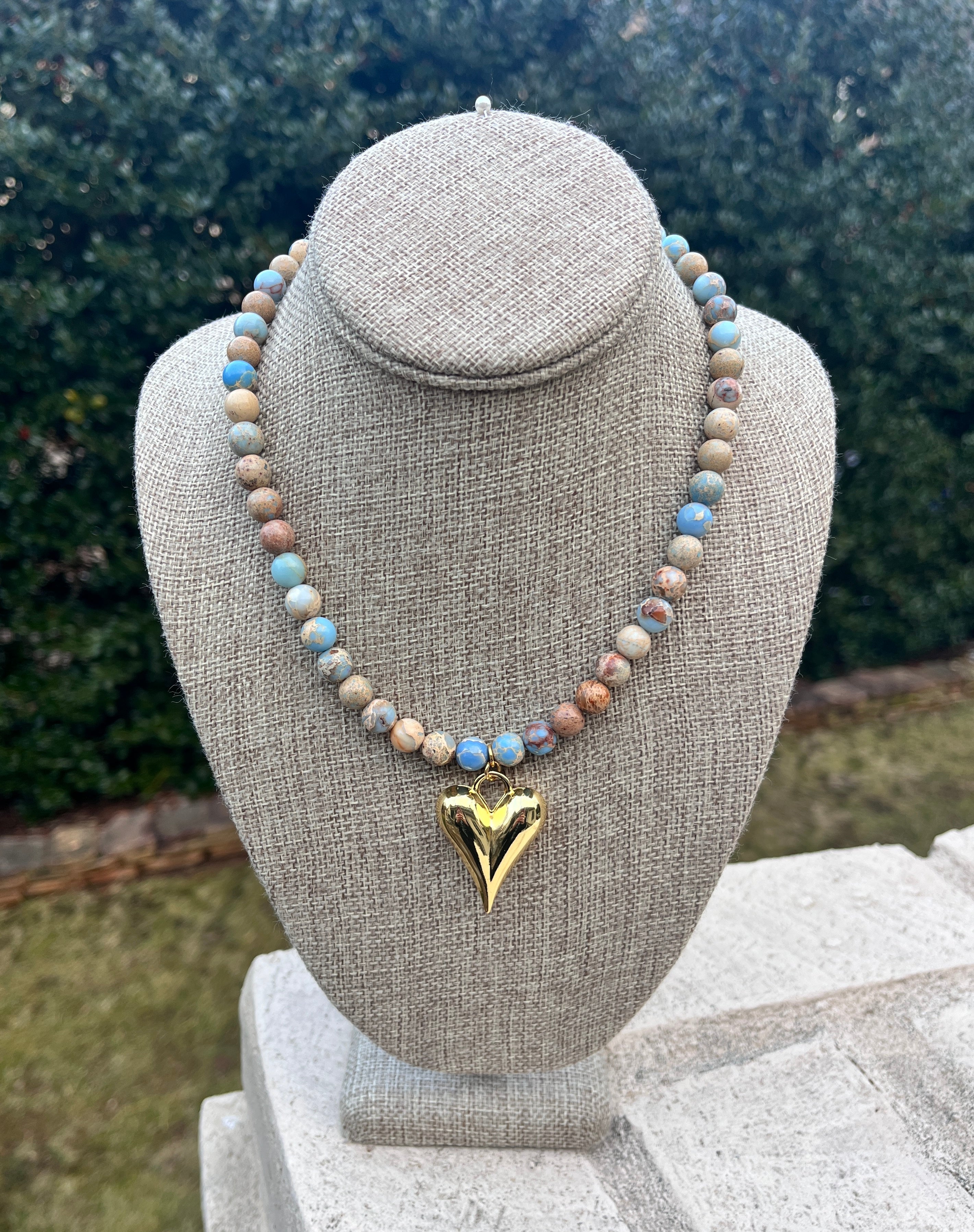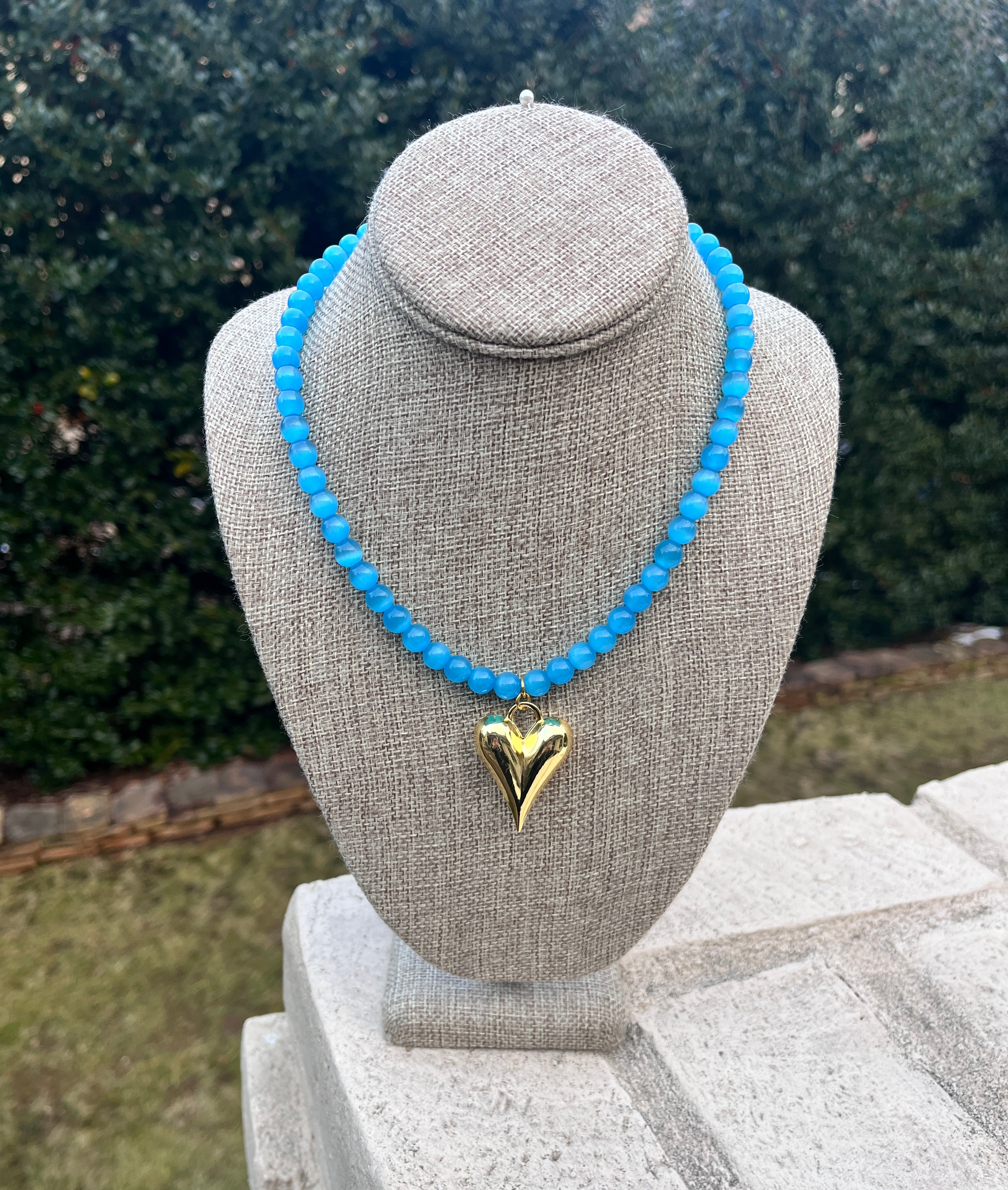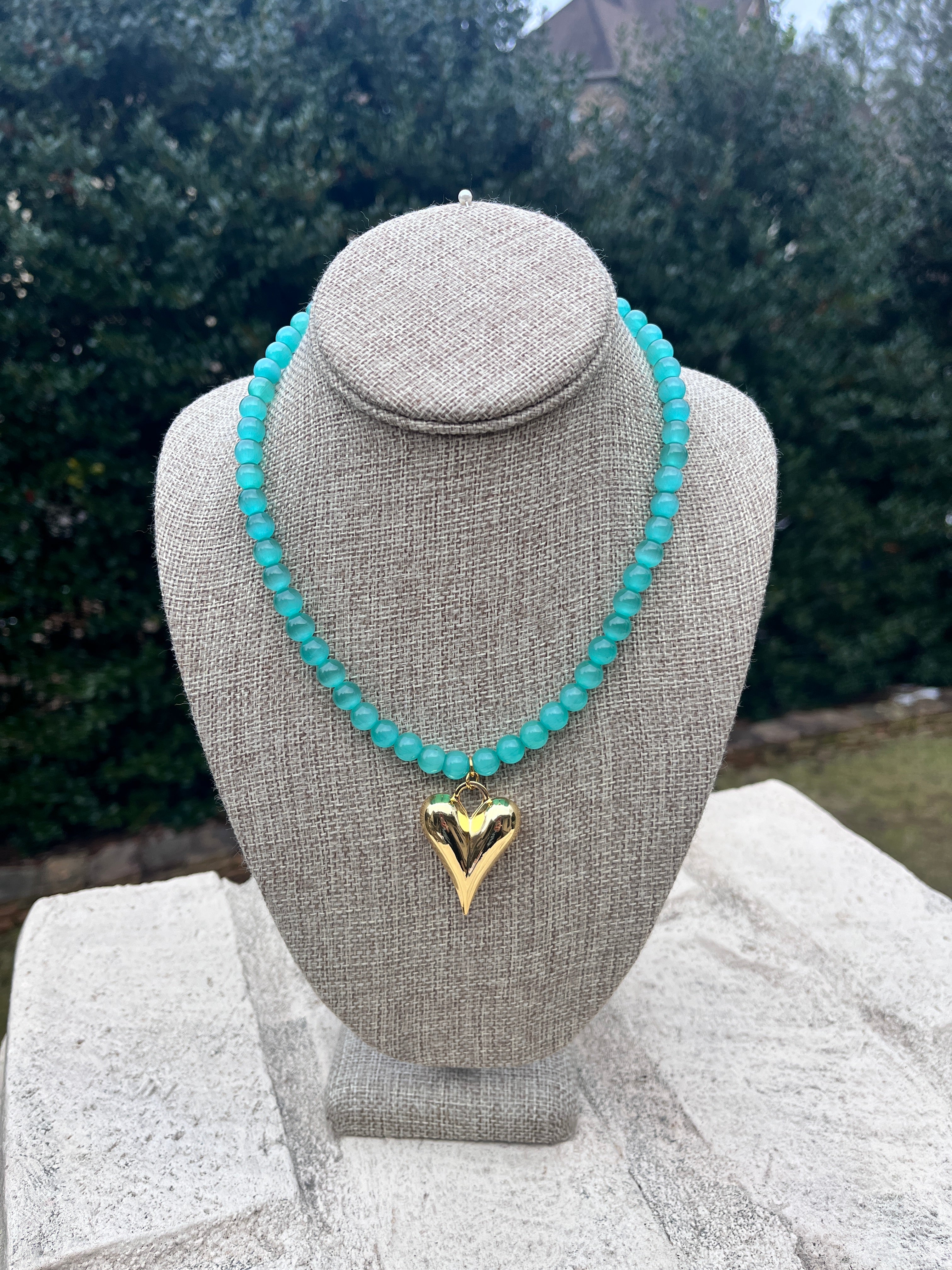 Sweet, bold, and effortlessly stylish, this 8mm gemstone beaded necklace is finished with a polished gold puff heart pendant for a modern statement. The smooth round beads add rich color and texture, while the dimensional heart charm creates a standout focal point that feels both playful and chic. Perfect for elevating everyday outfits or adding personality to a simple top or dress, this piece blends feminine charm with eye-catching style. A beautiful boutique favorite that makes a thoughtful gift or a fun addition to your jewelry collection.