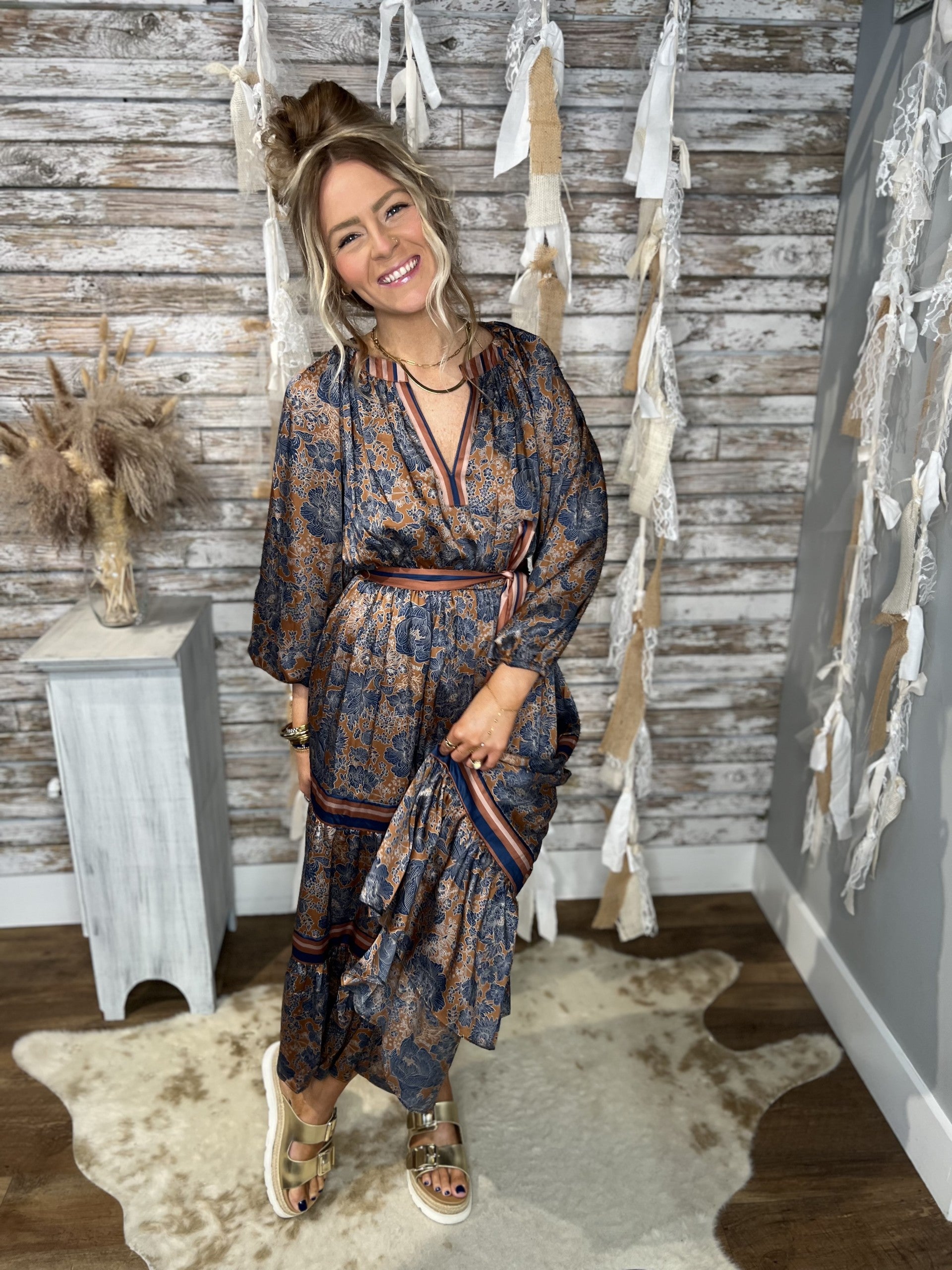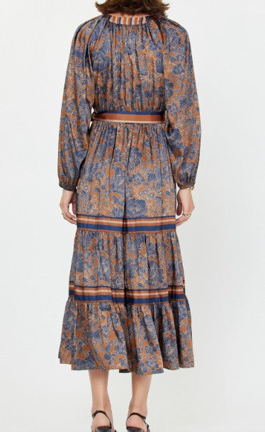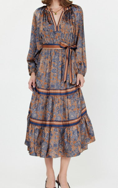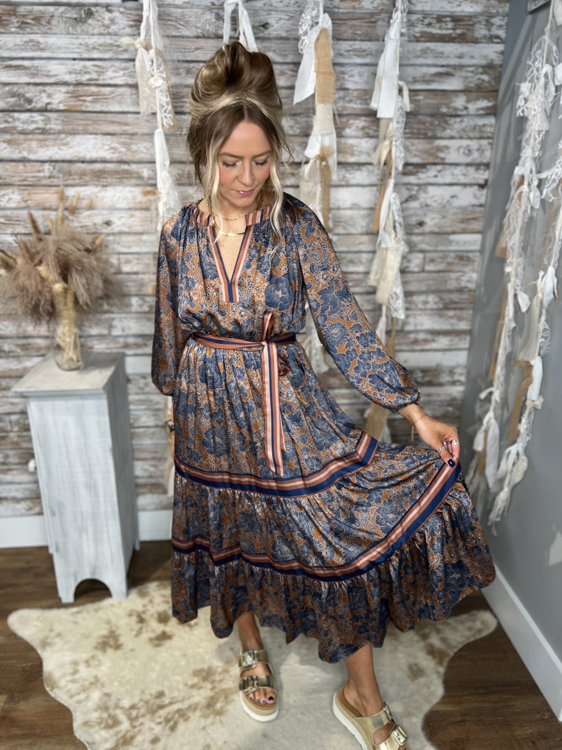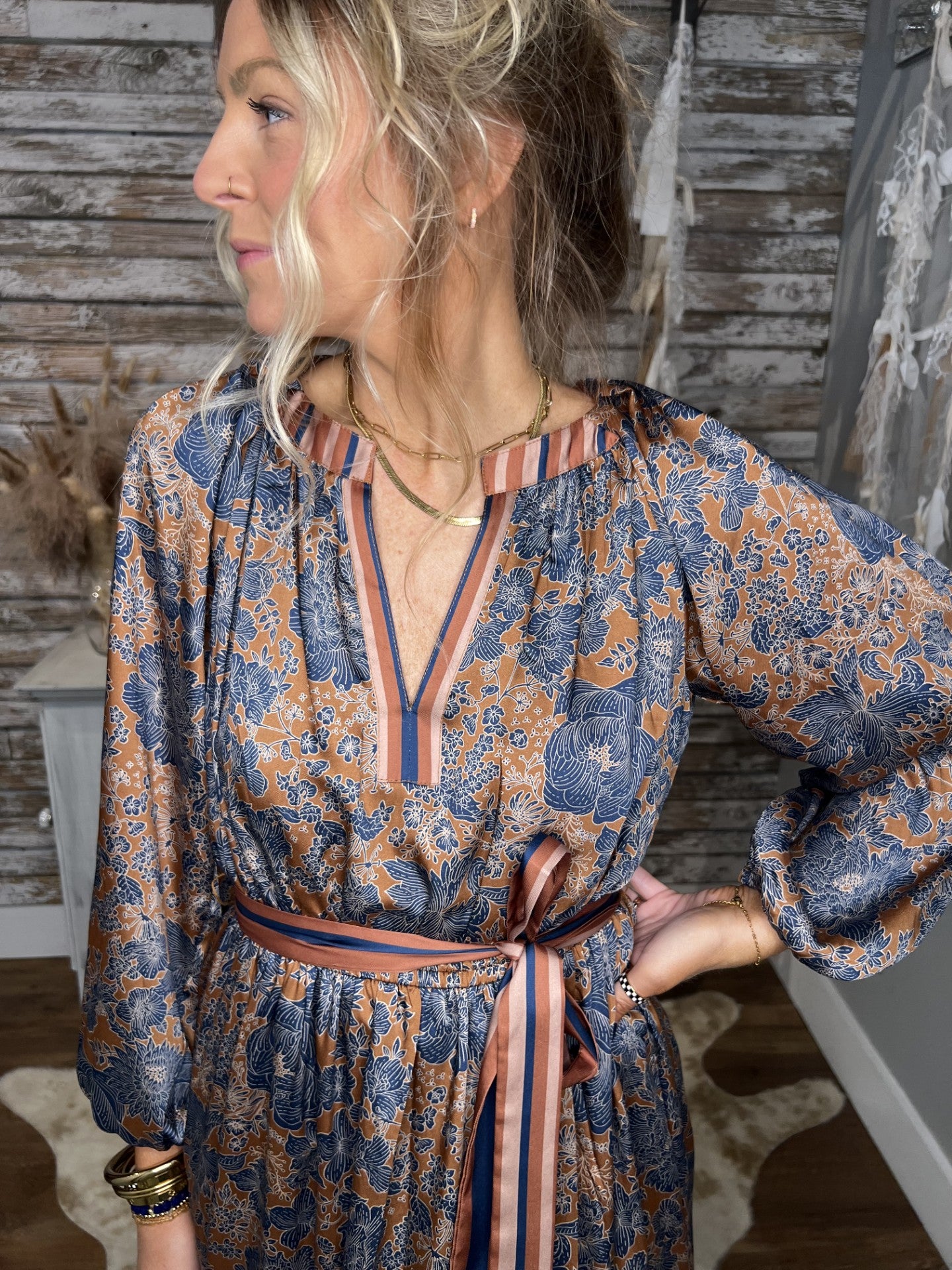 Flow with effortless grace in the Autumn Sonata Dress. Featuring a vintage-inspired floral motif framed by contrast border stripes, this dress is the perfect harmony of elegance and ease. The split neckline with soft gathers, blouson sleeves, and elasticated waist create a flattering silhouette, while the tiered skirt adds gentle movement and volume. Finished with a sash tie, it’s a dreamy midi that transitions seamlessly from brunch to evening glow.