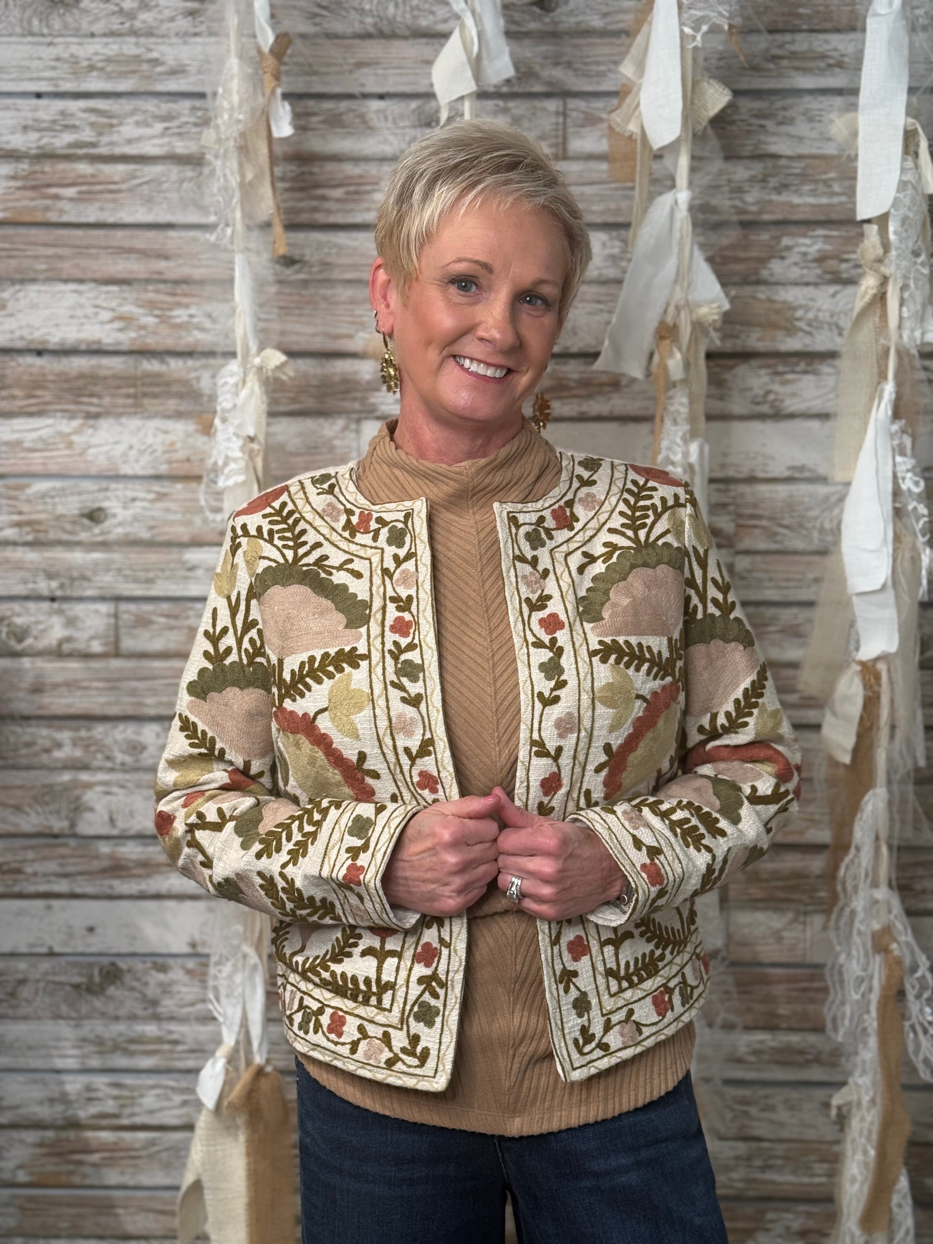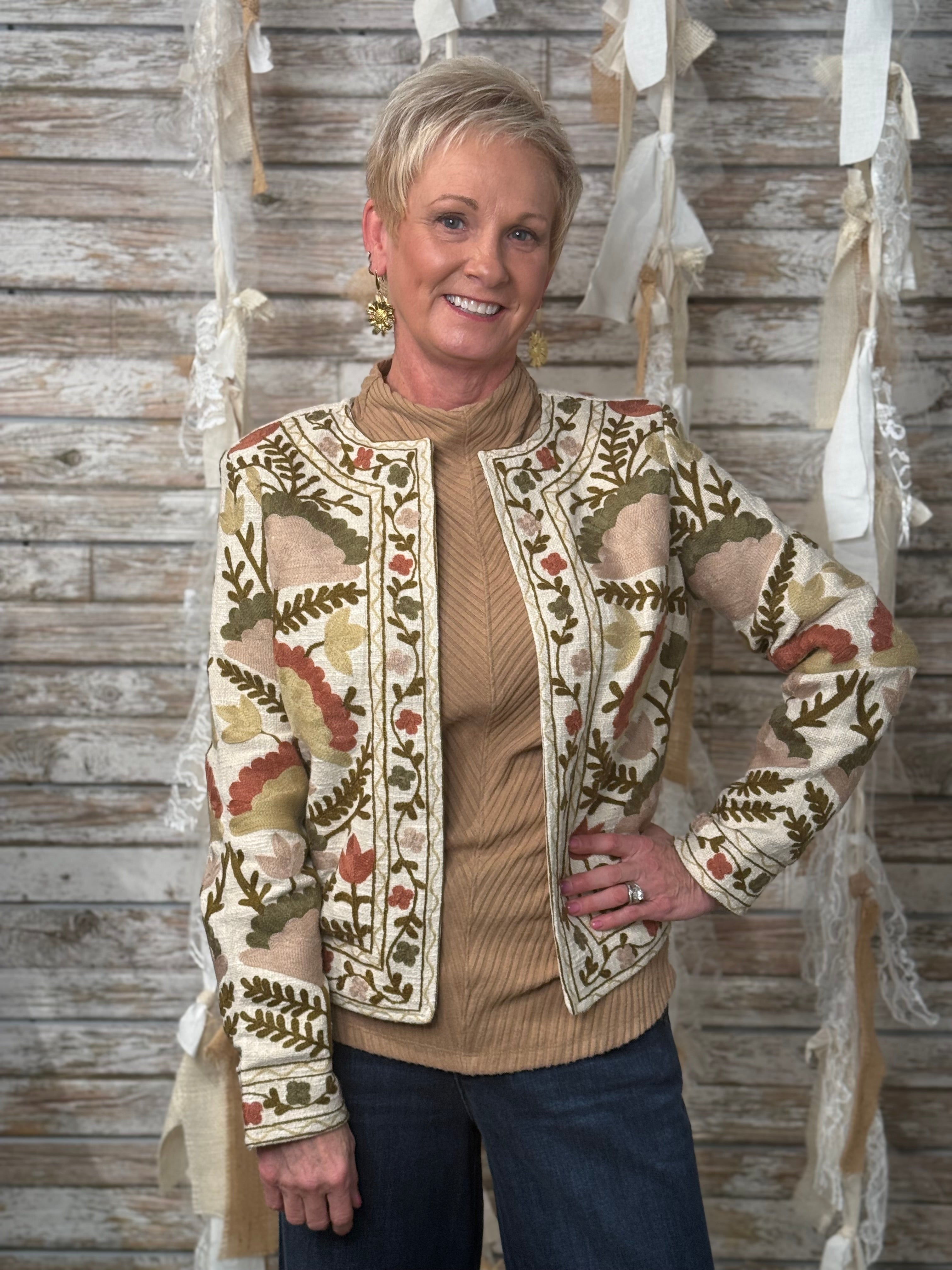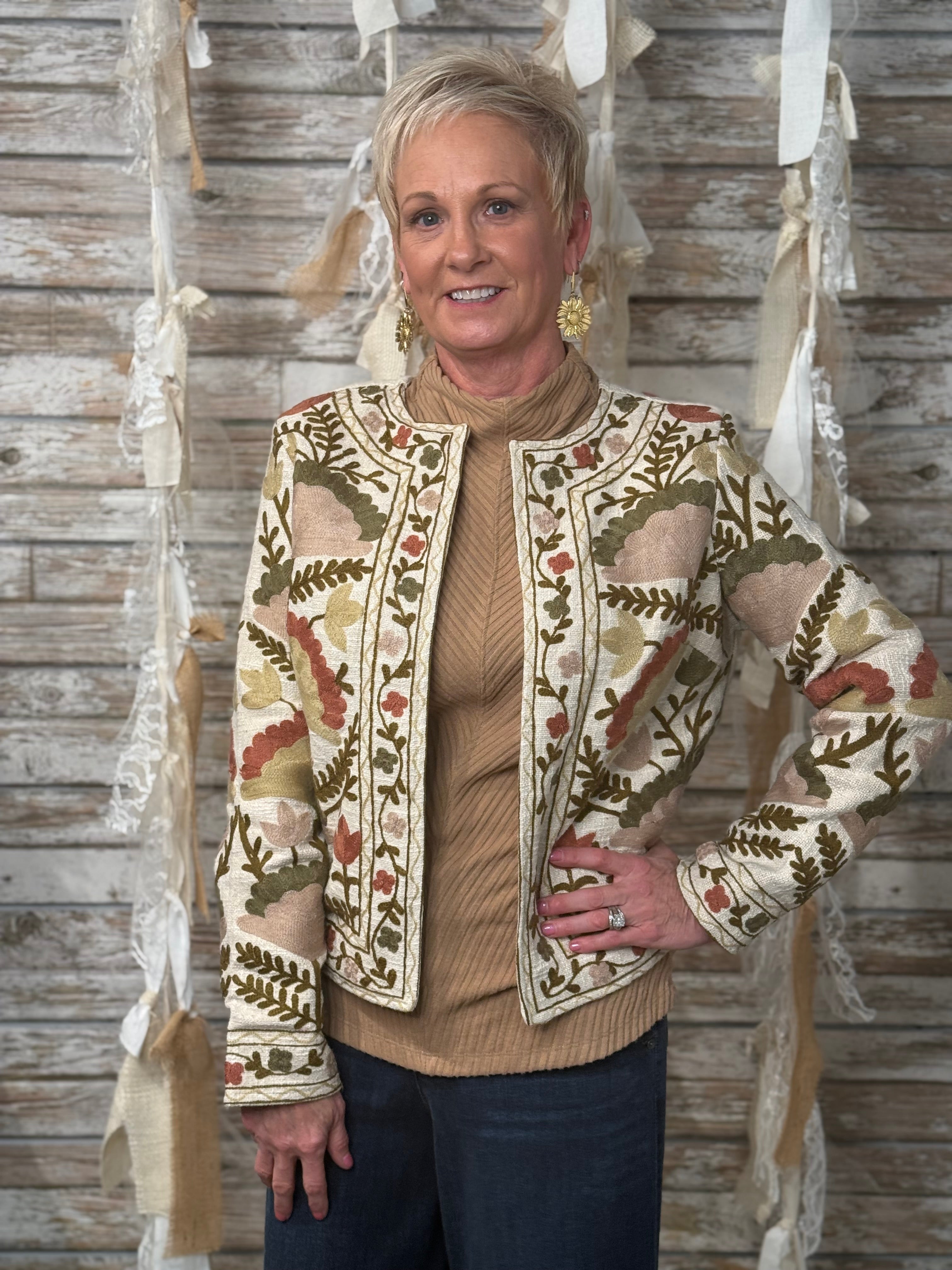 The Autumn Tapestry Jacket weaves rich, earthy tones into a stunning edge-to-edge embroidered design on soft cotton basketweave. Its intricate leaf-and-vine pattern and open-front silhouette bring artisanal charm and effortless elegance to any outfit, making it a statement layer for every season.