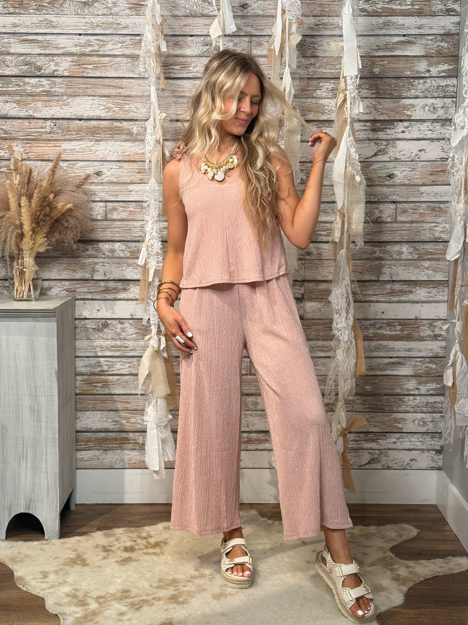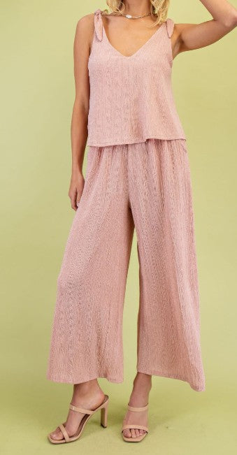 Effortless charm meets dreamy comfort in the Blush Mirage Jumpsuit. This set-illusion one-piece is designed to look like a perfectly paired two-piece outfit, with a flowy, textured wide-leg pant and a relaxed-fit V-neck cami top. The sweet shoulder tie details add a playful, adjustable touch, making it as versatile as it is chic. Perfect for brunch dates, beach strolls, or summer soirées — slip it on and step into your own little mirage of style.