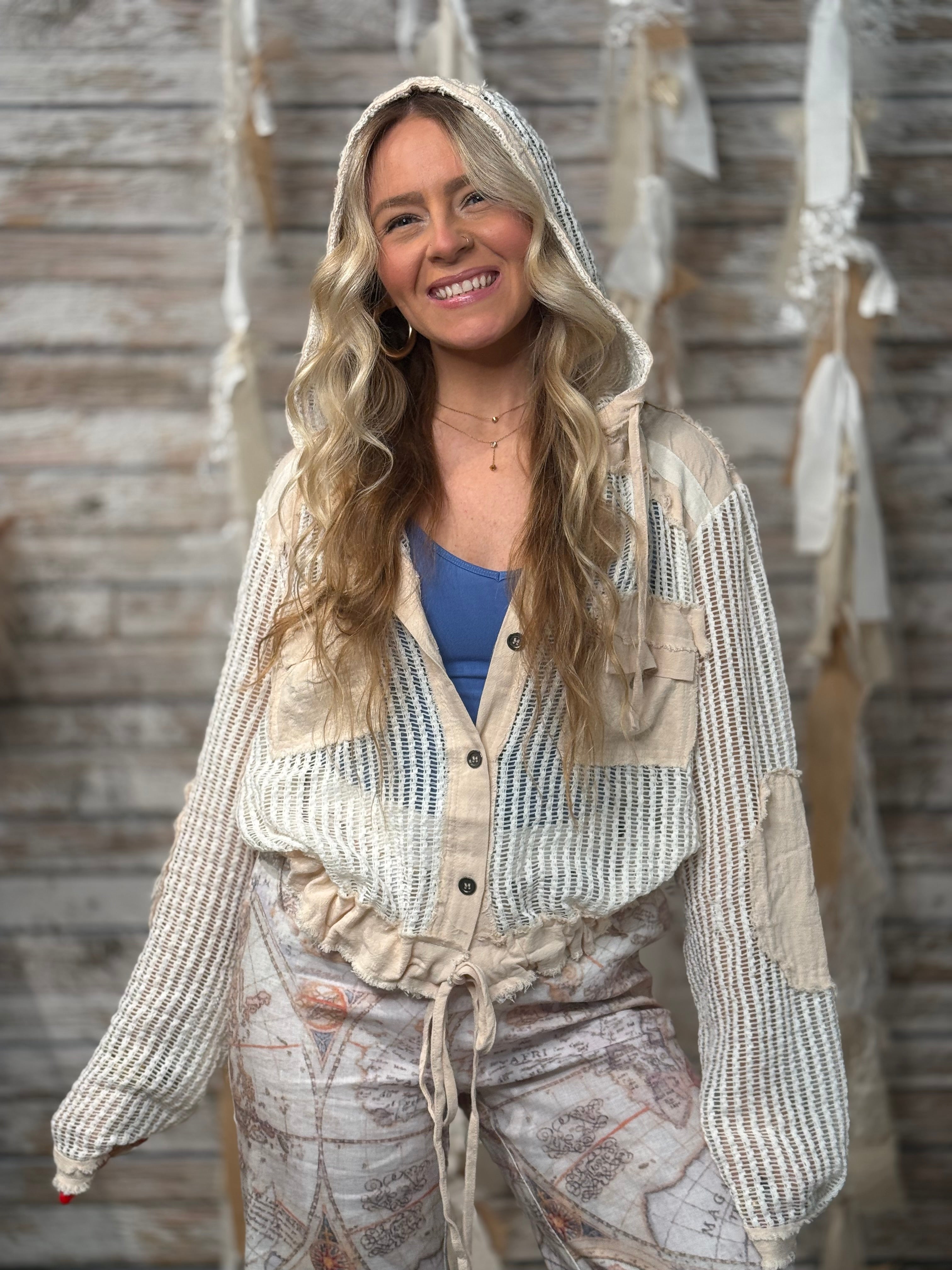 Light, airy, and effortlessly cool — the Breezy Edge Textured Mesh Hoodie is designed to make a statement. Crafted in a semi-sheer textured woven fabric, it features a button-down front, frayed edges for a lived-in vibe, dual chest pockets, and soft elbow patches. The relaxed fit and hooded detail add casual charm, perfect for layering over your favorite tanks and dresses.