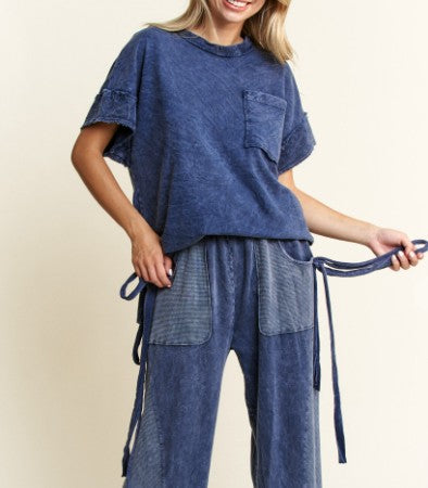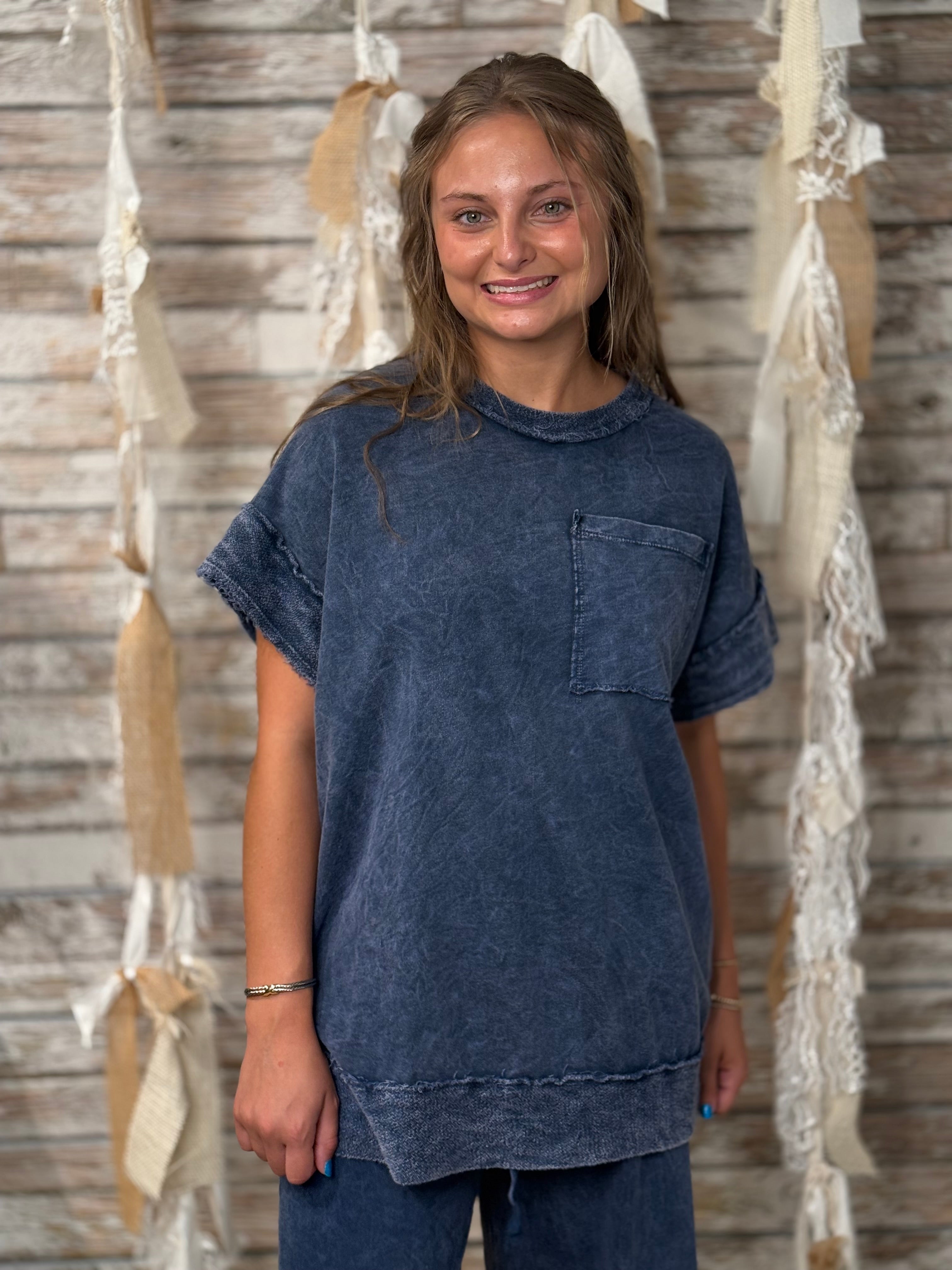 Keep it casual with the Coastal Fade Pocket Tee! This relaxed-fit top features a soft mineral wash finish, cap sleeves with frayed accents, and a front chest pocket for that perfectly undone vibe. The breathable fabric and easy silhouette make it your go-to for lounging, errands, or pairing with wide-leg pants for a laid-back, lived-in look with edge.