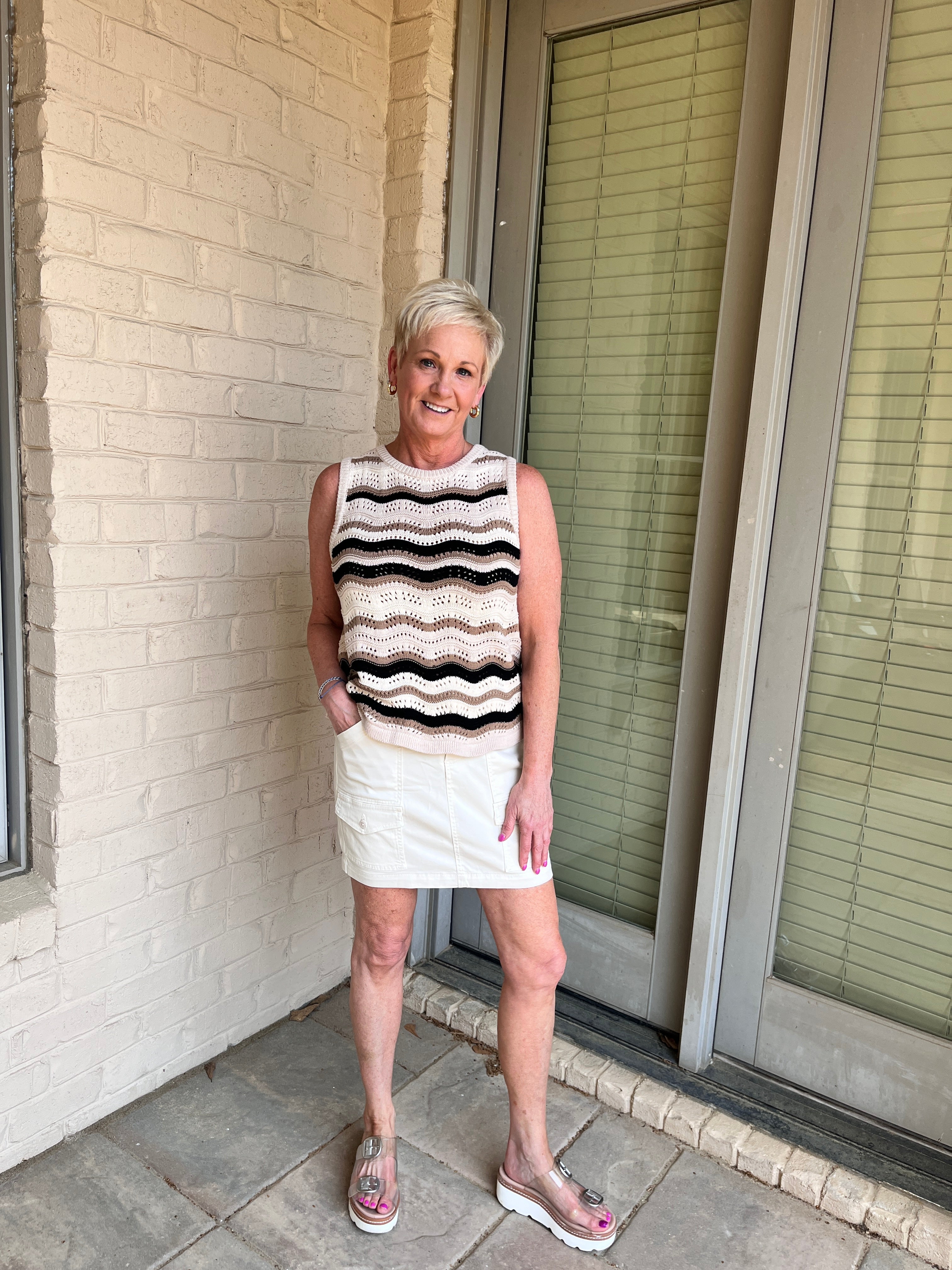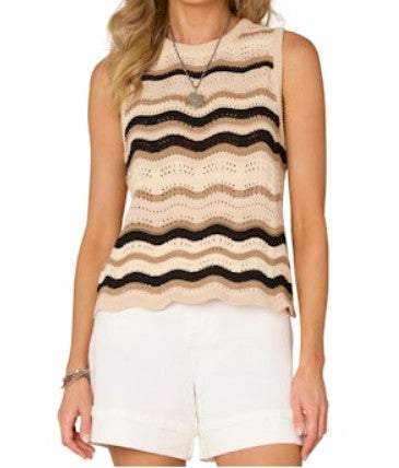 Embrace laid-back charm with the Coastal Wave Tank — a sleeveless sweater knit with soft, wavy stripe stitching in classic neutral tones. Featuring a round neckline and breezy silhouette, this top is perfect for sunny strolls, weekend getaways, or adding a touch of texture to your summer wardrobe.