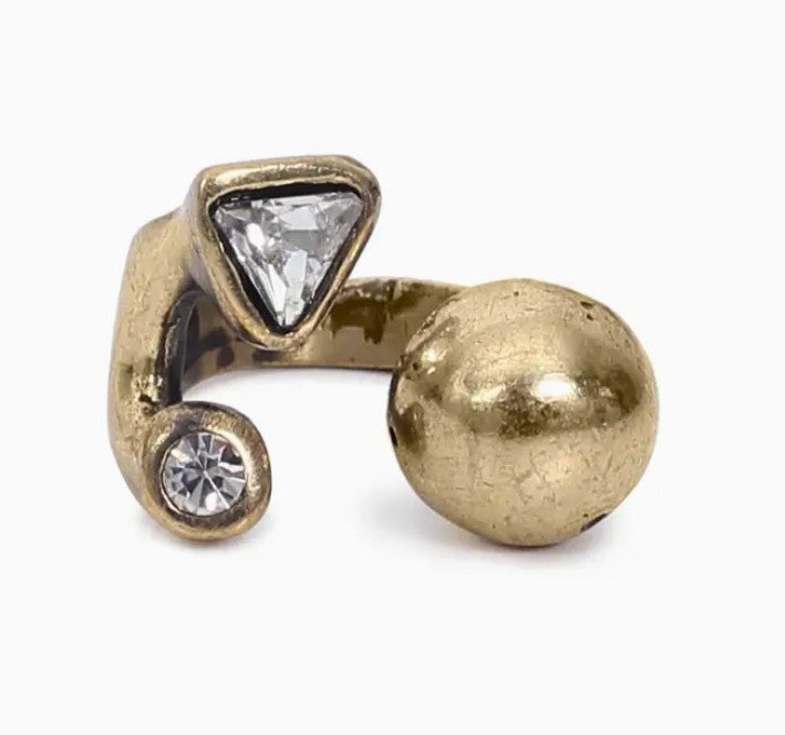Eclectic and bold, the Cosmic Alchemy Ring fuses geometry and glamour in a striking antique gold finish. With a triangle-cut crystal, round accent stone, and a sculptural metallic orb, this open-band design feels like wearable art. A conversation piece that channels both vintage vibes and futuristic flair.