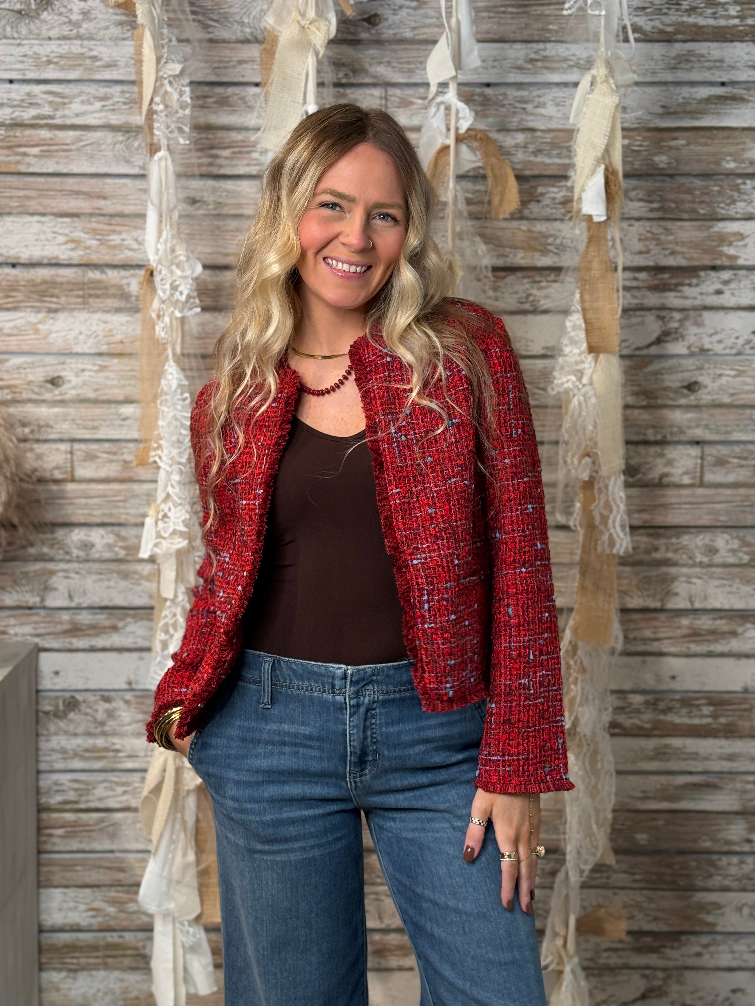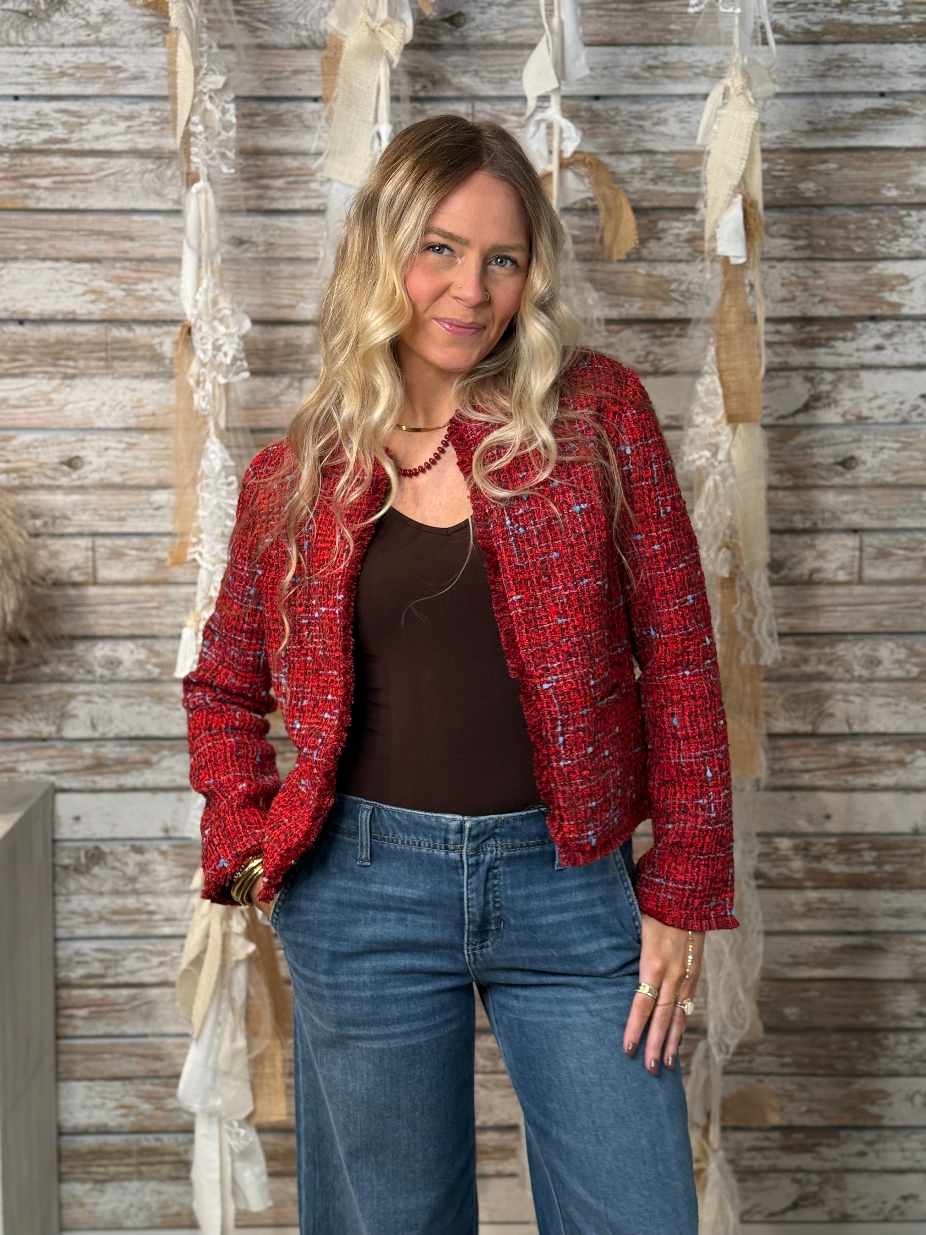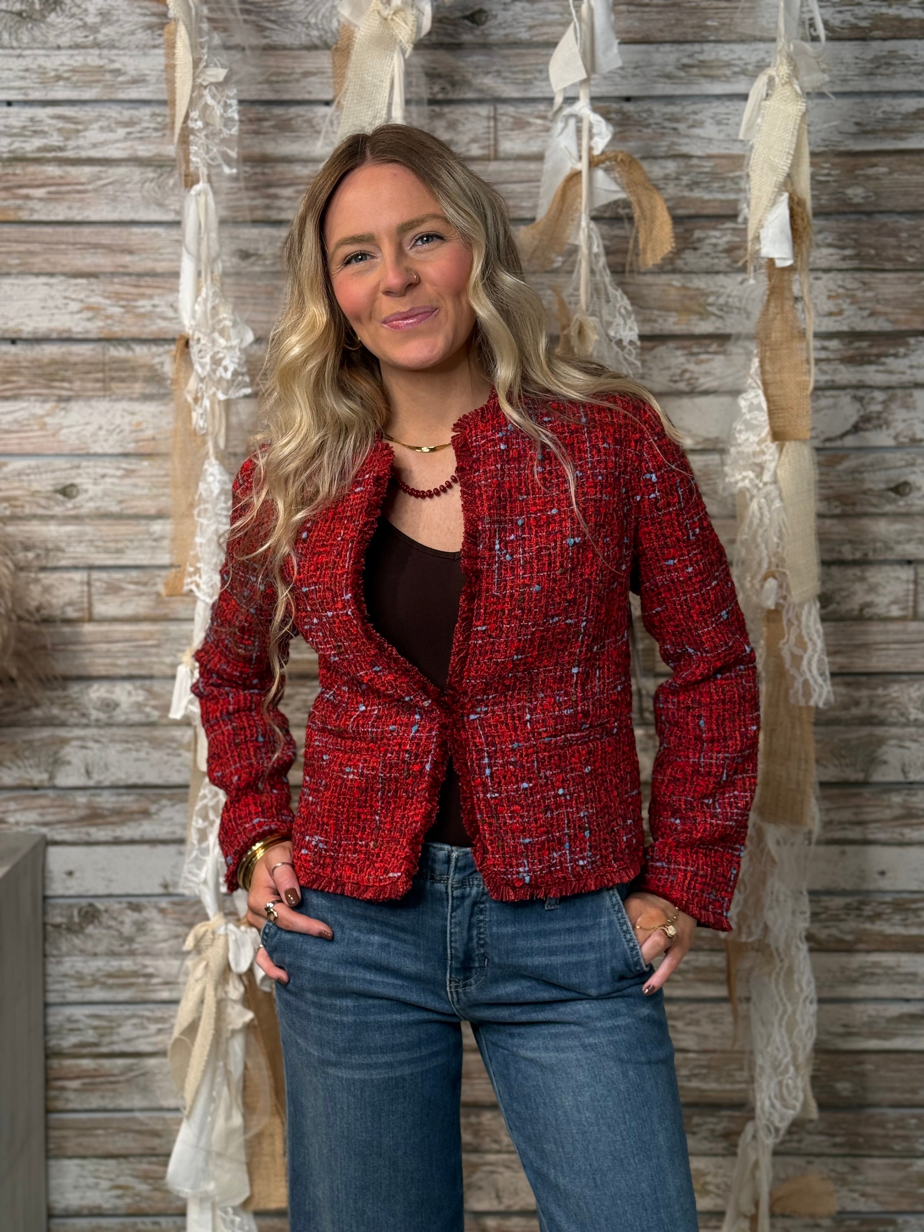 Bring instant sophistication to your look with this striking red tweed jacket. Featuring rich texture with subtle hints of blue and black woven throughout, its timeless silhouette makes it easy to dress up or down. Layer over denim for a chic casual vibe or pair with tailored trousers for a polished finish.