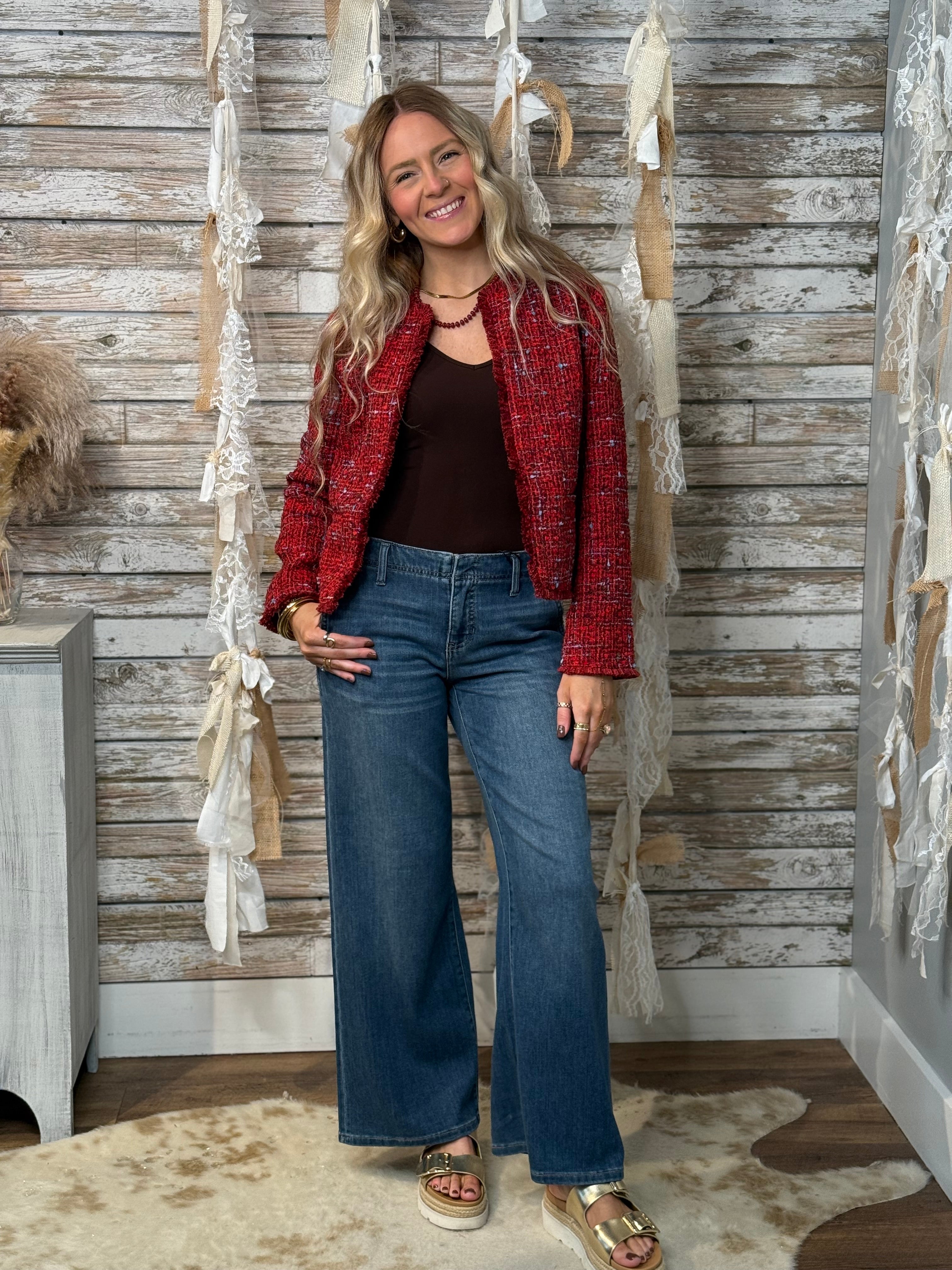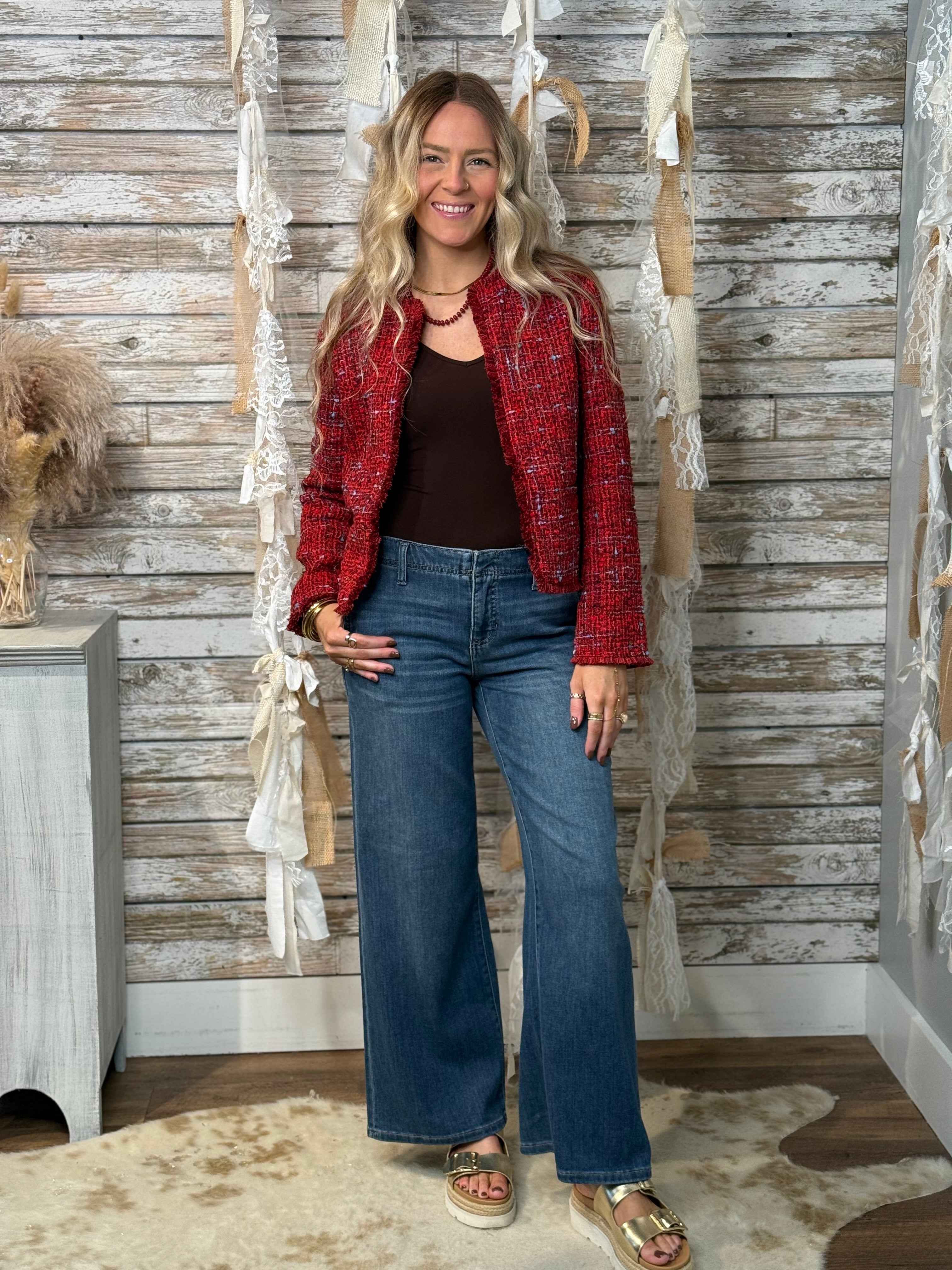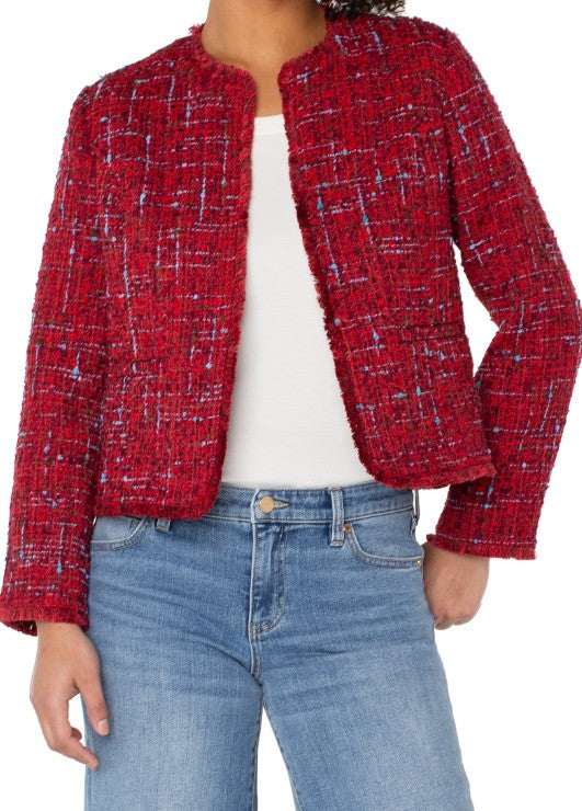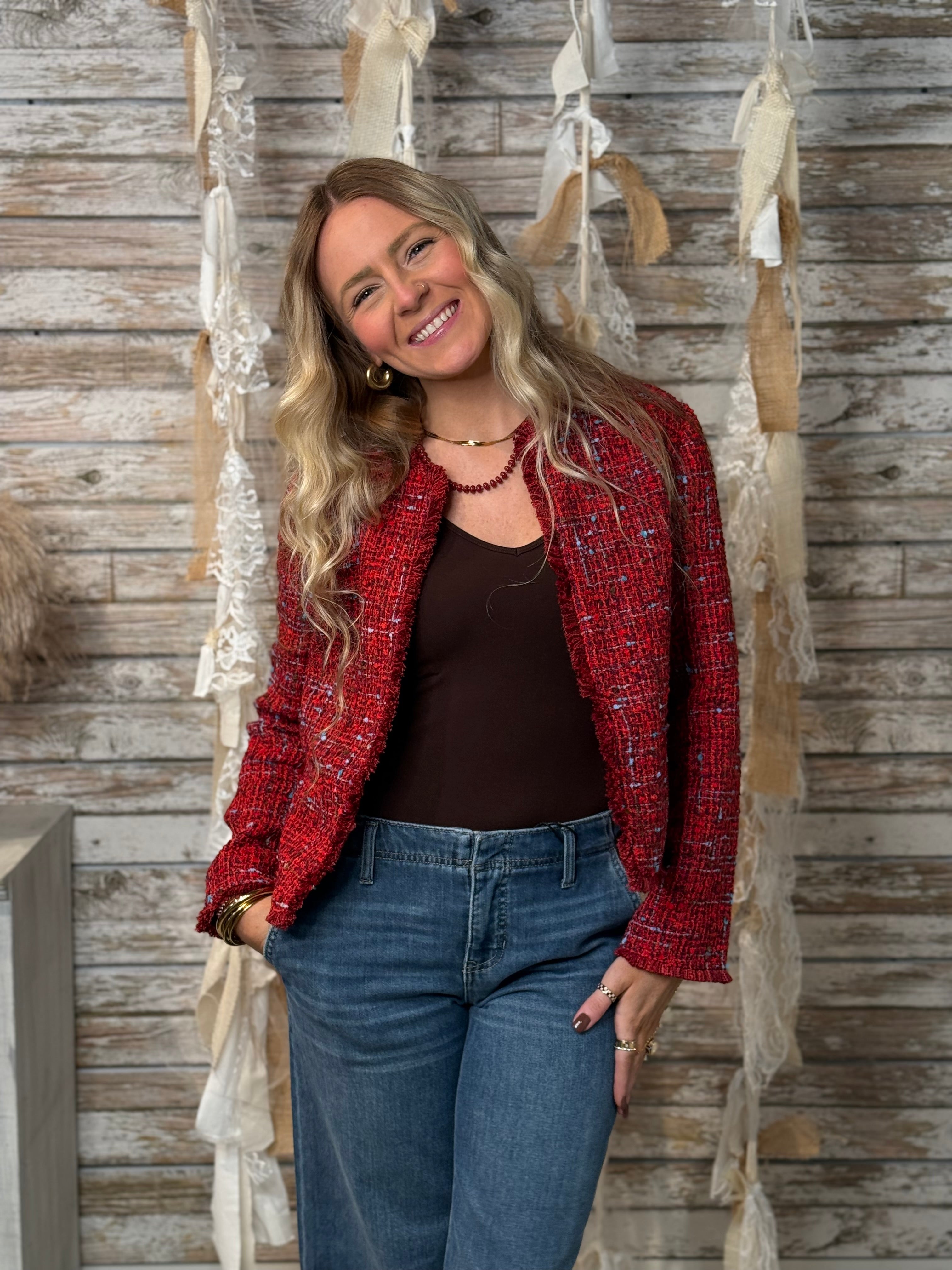 Bring instant sophistication to your look with this striking red tweed jacket. Featuring rich texture with subtle hints of blue and black woven throughout, its timeless silhouette makes it easy to dress up or down. Layer over denim for a chic casual vibe or pair with tailored trousers for a polished finish.