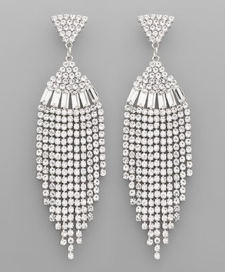 Step into the spotlight with the Crystal Curtain Chandelier Earrings — a stunning cascade of brilliance designed to steal the show. Rows of shimmering rhinestones flow in elegant tiers, creating a glamorous drape that moves with every turn. The triangular top adds a modern edge to this timeless statement piece, making them the perfect finishing touch for holiday parties, black-tie events, or any night you’re ready to sparkle.