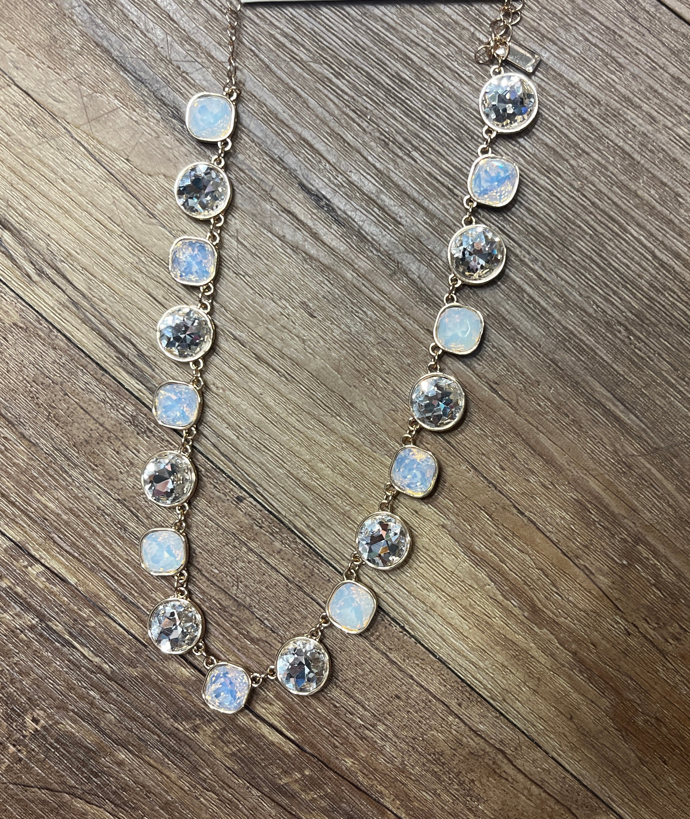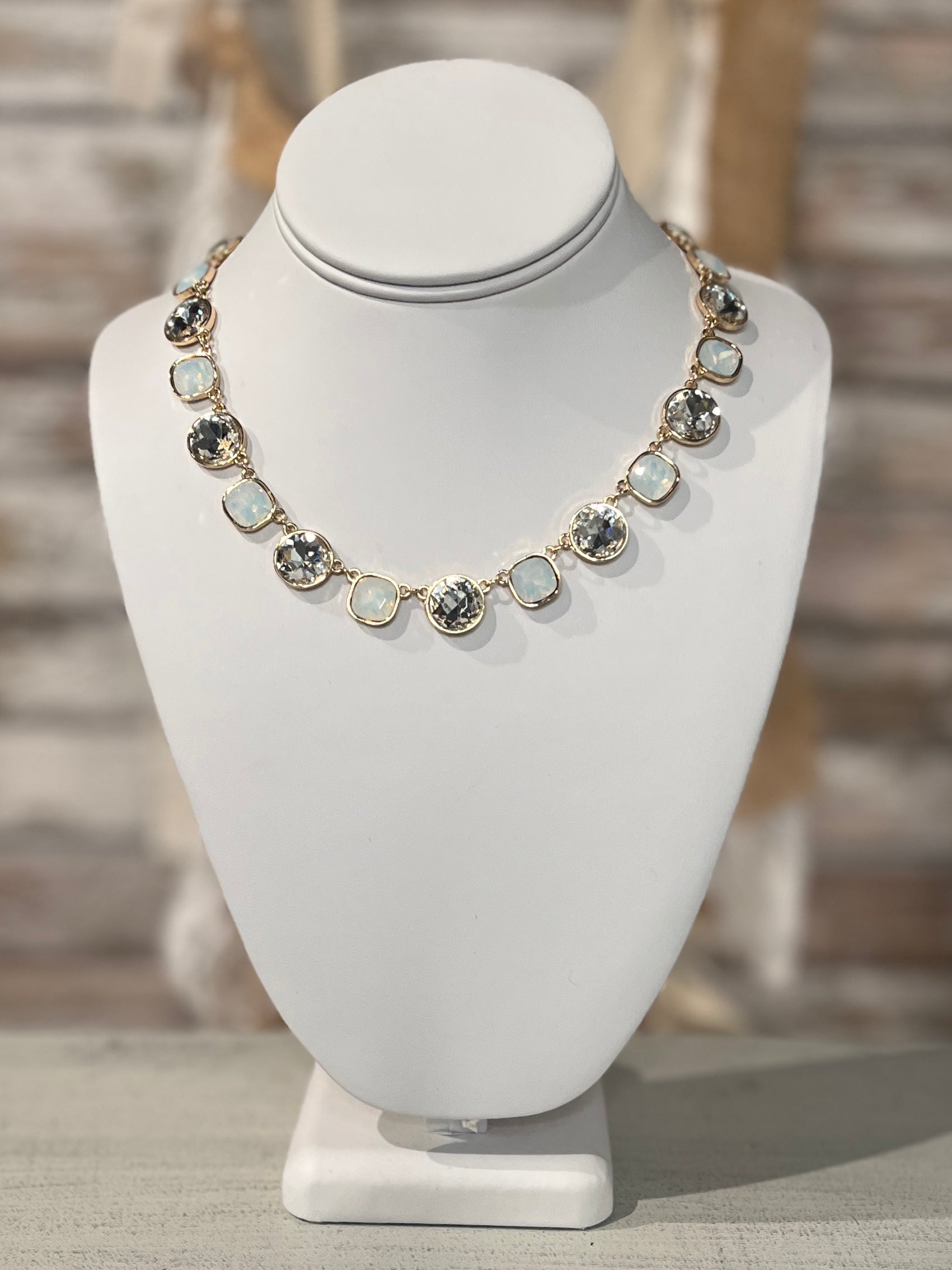 Graceful and luminous—our Crystal Harmony Link Necklace pairs sparkling round and soft square rhinestones in a fluid, linked design. Set in a gleaming gold-tone frame, this versatile piece adds just the right amount of sophistication and shimmer. Perfect for dressing up your everyday style or adding a touch of glam to special occasions!