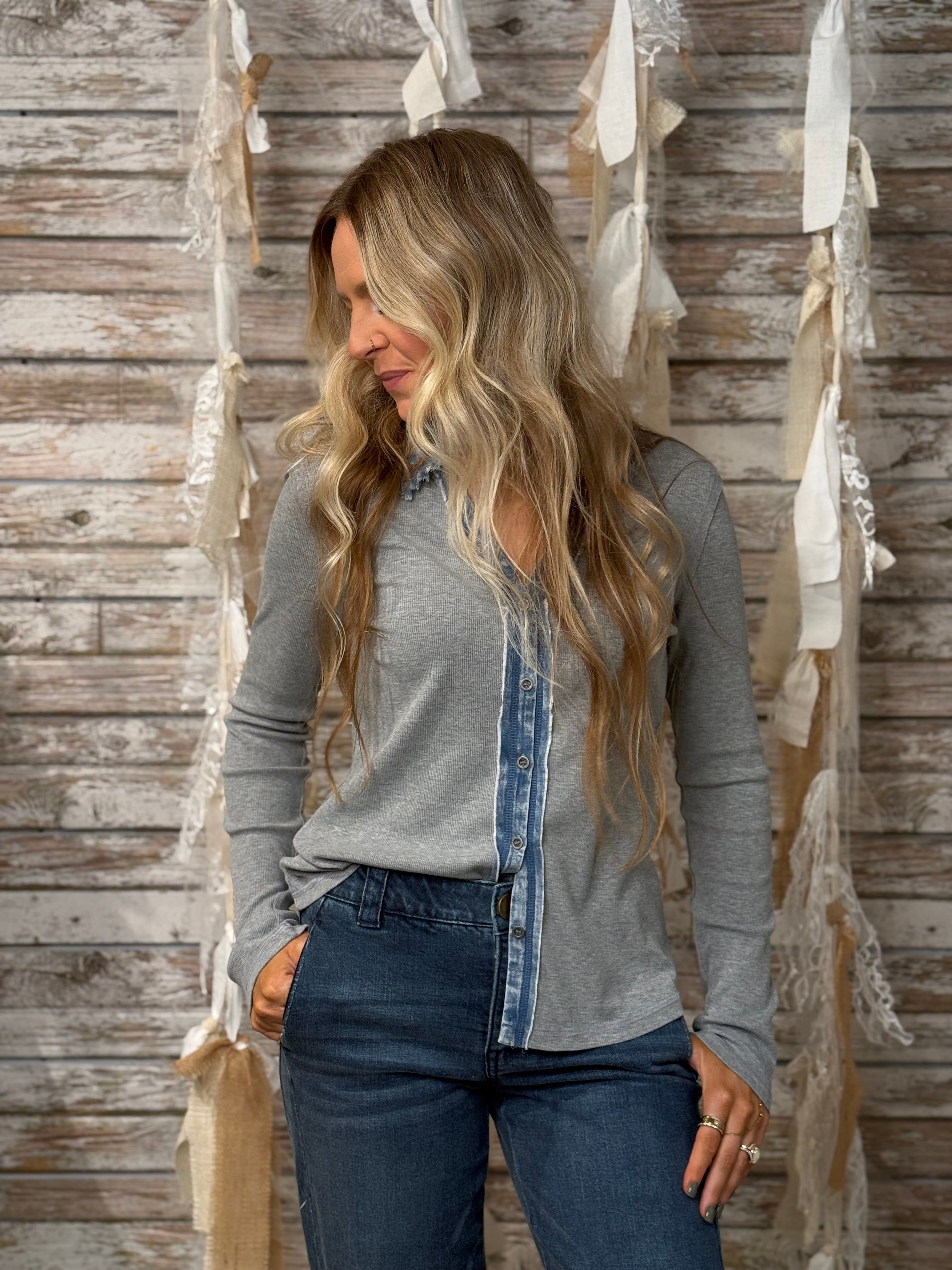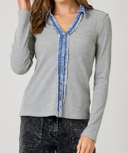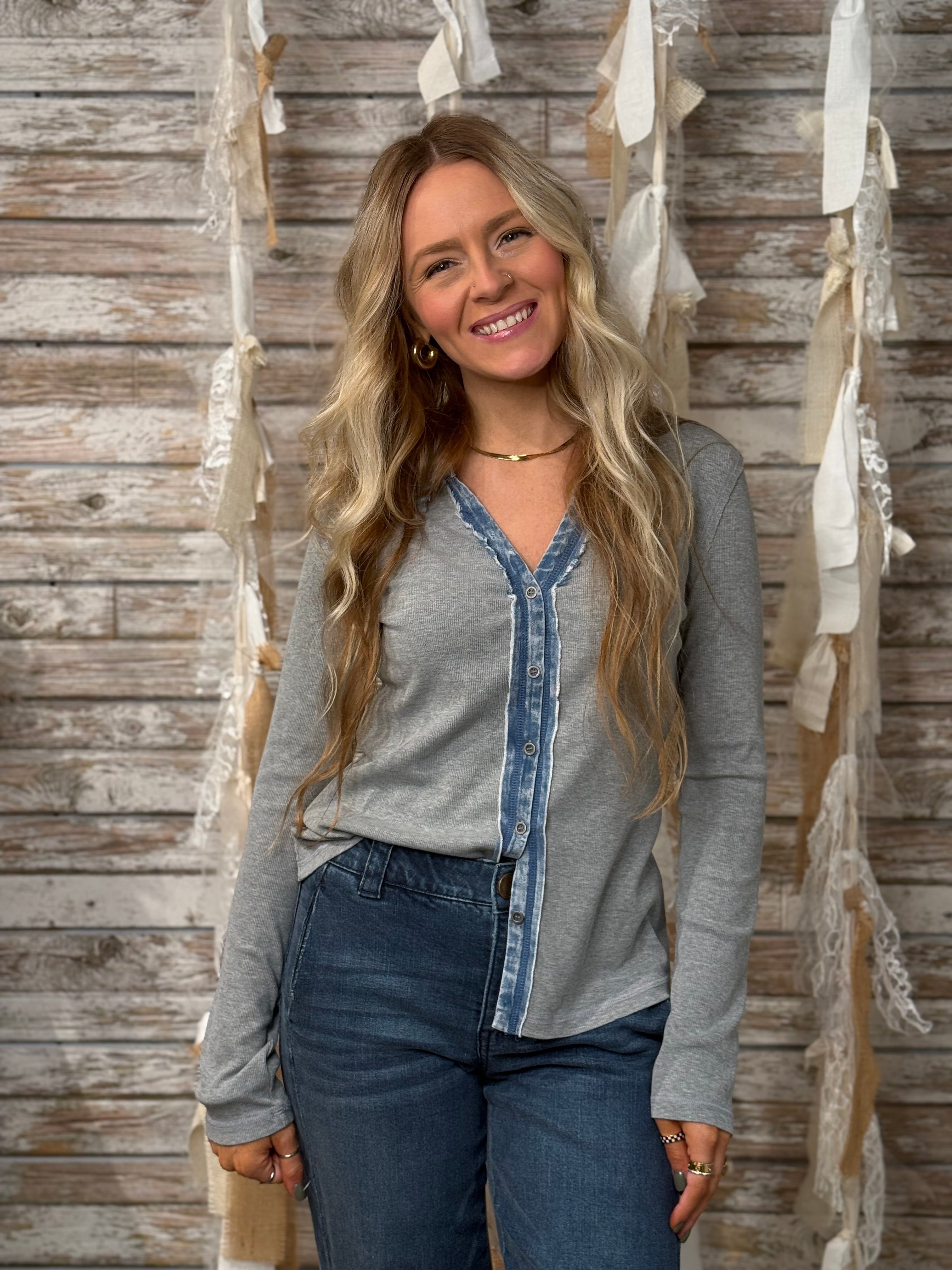 Cozy meets cool in the Denim Daze Thermal. This washed ribbed button-down features soft thermal texture and contrast denim trim with raw edges for that lived-in, layered look. From lazy days to casual nights out, it’s the effortlessly edgy top your closet’s been craving.