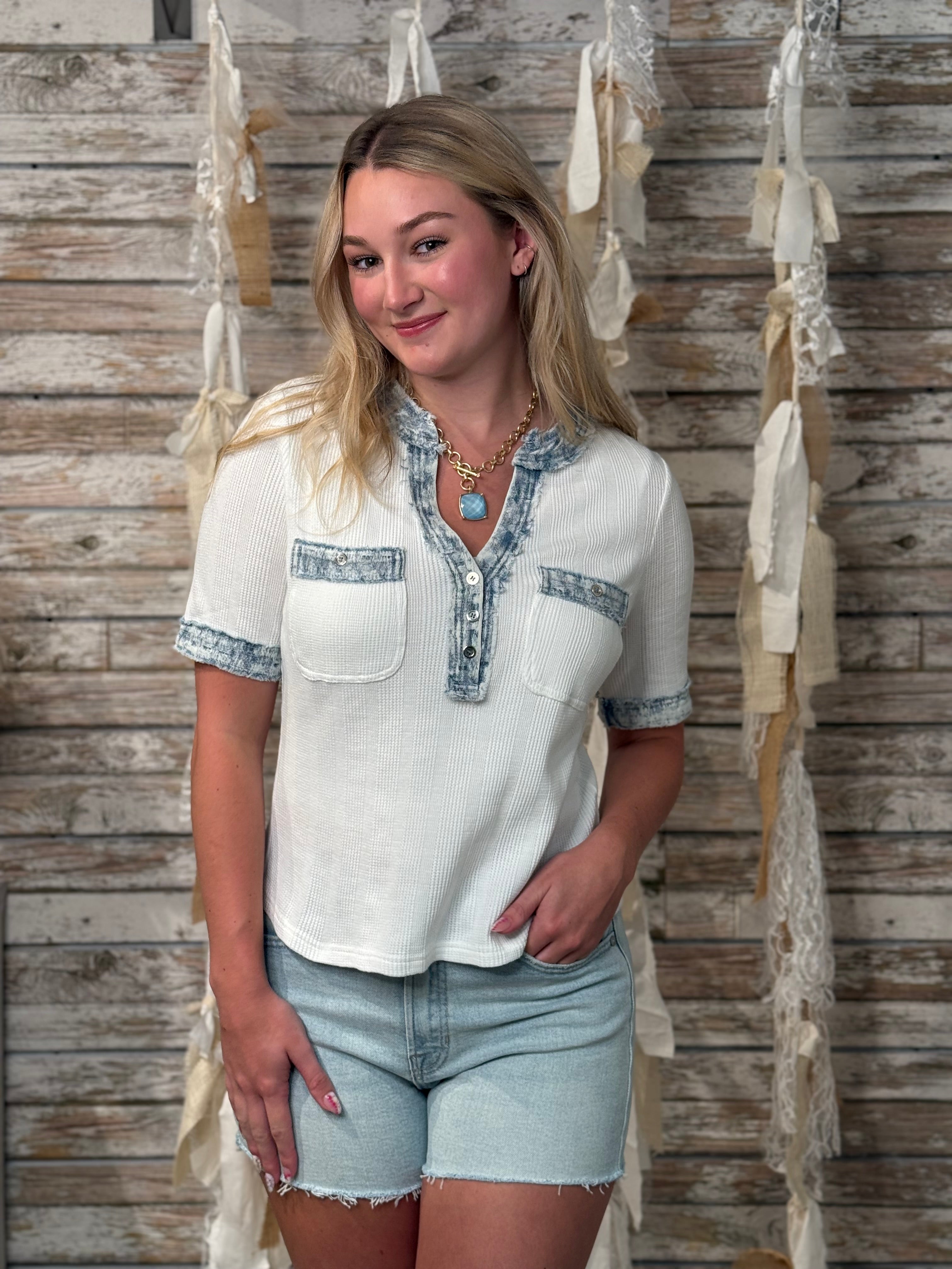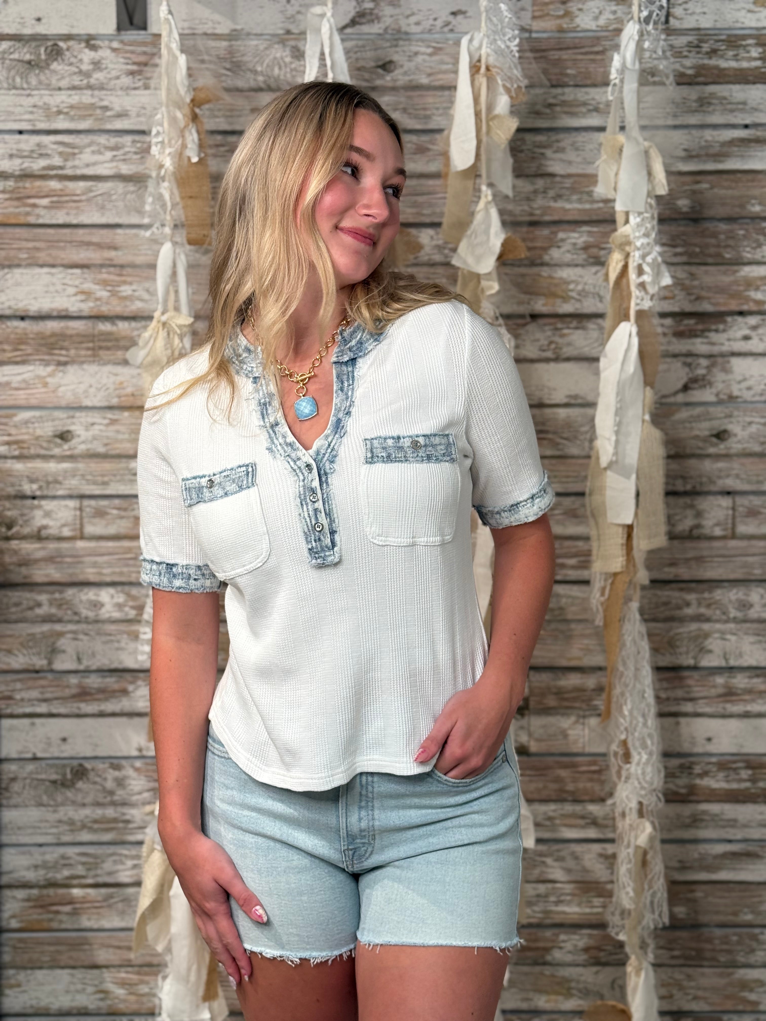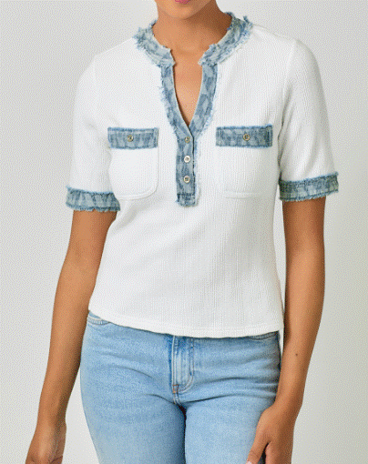 Turn up the charm with the Edge Appeal Denim Tee — where casual meets effortlessly cool. Featuring a sliced V-neck with chic button accents, this short-sleeve beauty flaunts frayed denim trim and bust pockets for a hint of rugged style. Crafted with a comfy cotton-spandex blend and contrast detailing, it's the perfect go-to for that lived-in look with a touch of edge.