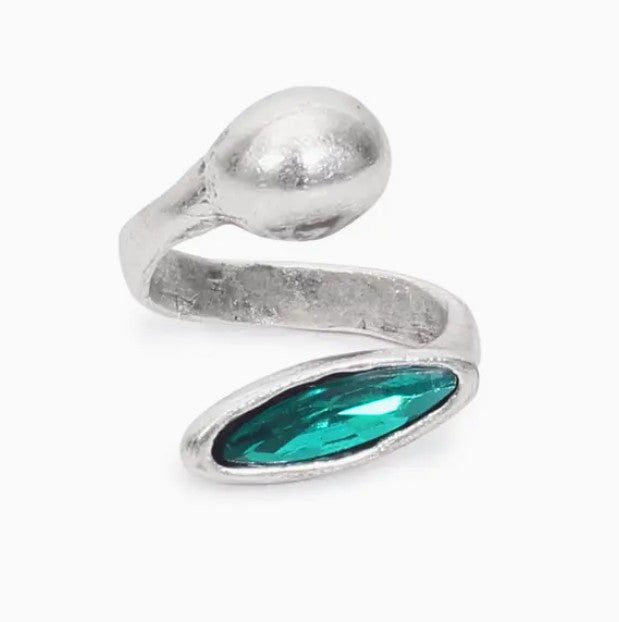 Striking and sculptural, the Emerald Pulse Wrap Ring wraps your finger in sleek silver-tone metal, ending with a bold metallic orb and a vivid marquise-cut emerald green crystal. With its modern silhouette and captivating contrast, this ring is a true power piece for any jewelry collection.