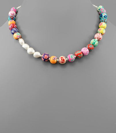 Brighten up any look with the playful charm of the Fiesta Bloom Necklace. Featuring a vibrant mix of floral clay beads and lustrous faux pearls, this colorful strand adds a fun, handcrafted feel with a modern twist. It’s a bold, cheerful accessory perfect for sunshine days and statement style.