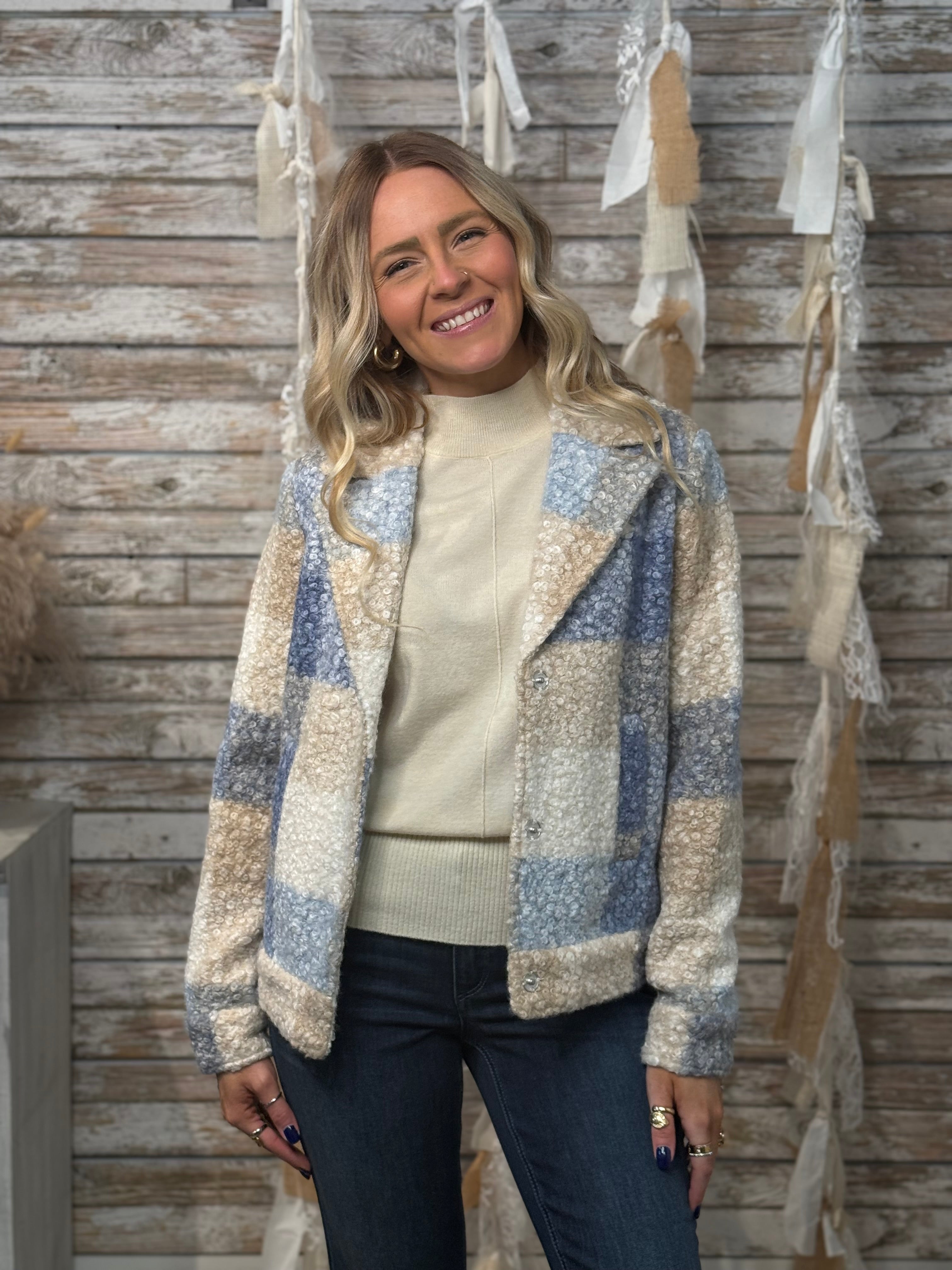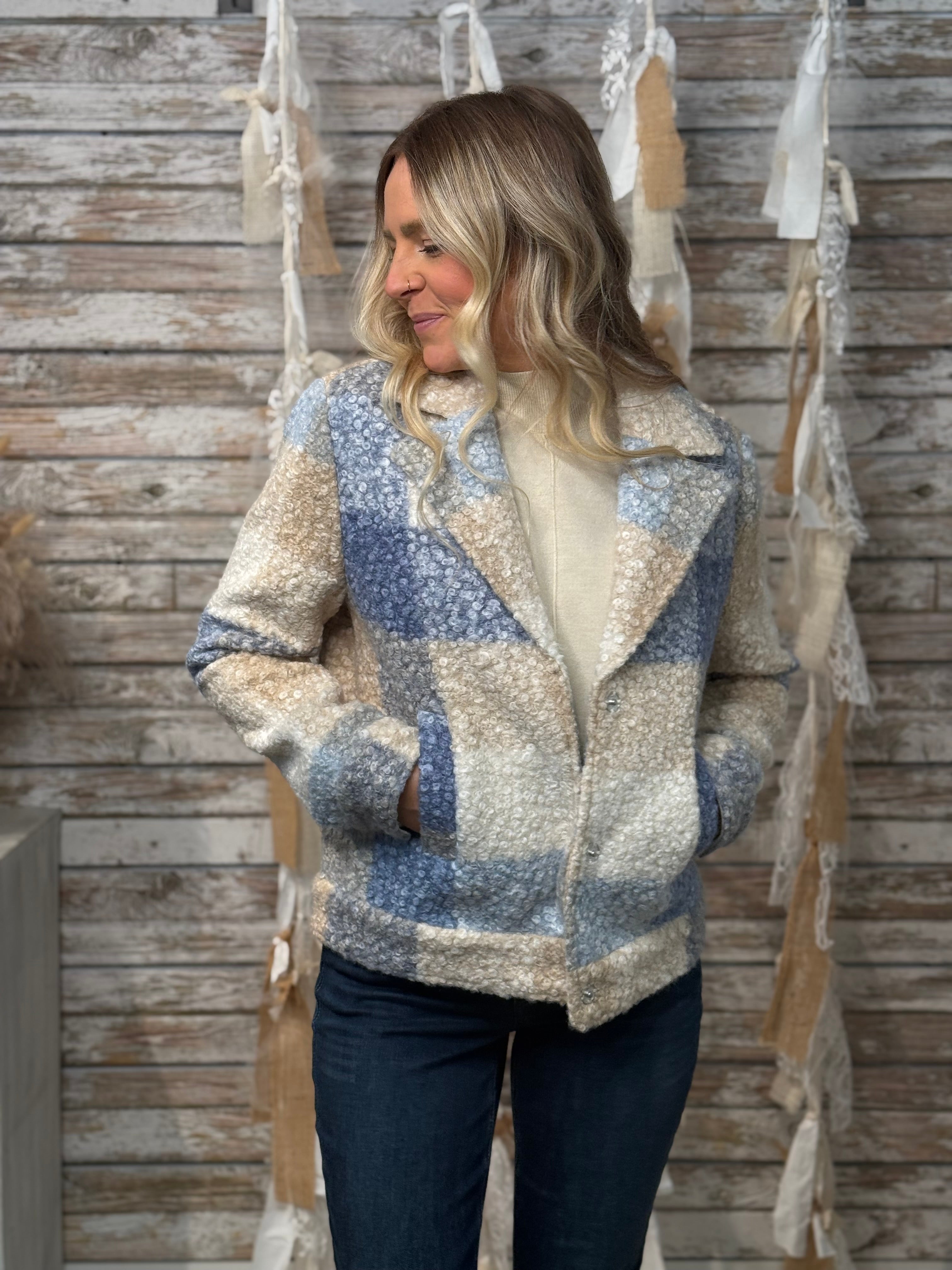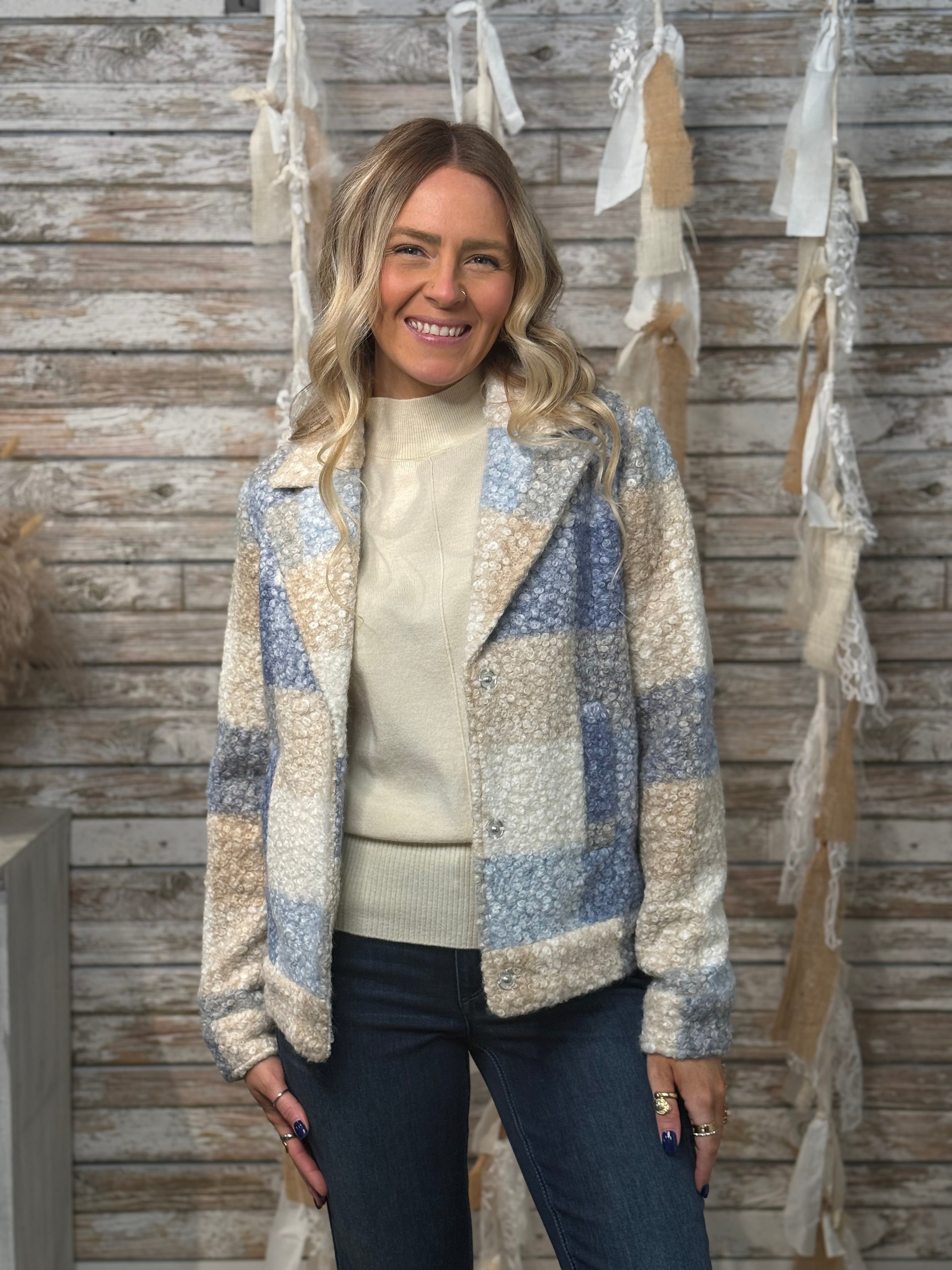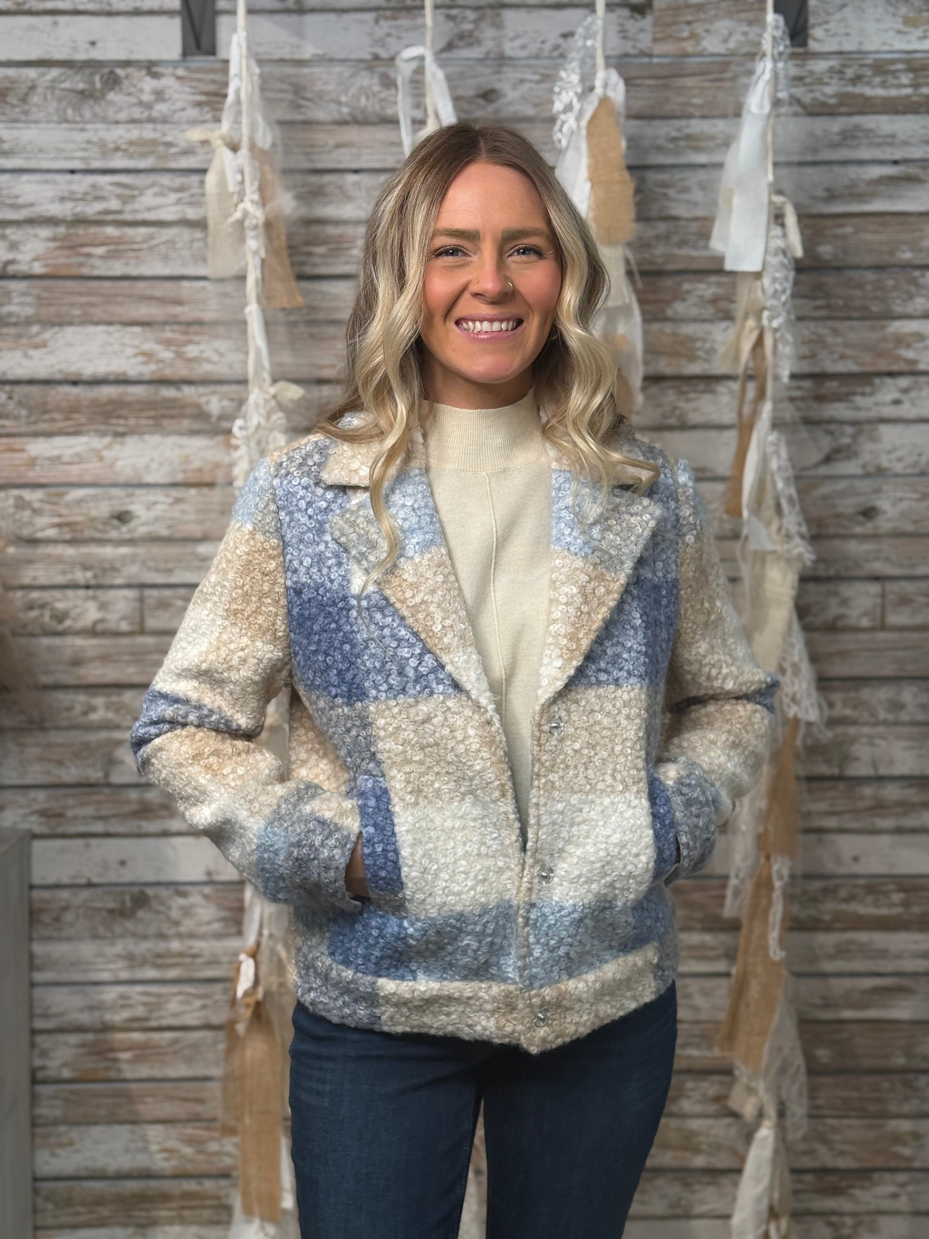 Stay cozy and chic in the Frosted Meadow Jacket. Featuring a soft, textured plaid in shades of blue, cream, and beige, this tailored zip-front style adds a modern twist to classic outerwear. With its structured collar and cropped length, it’s the perfect balance of polished and playful. Layer it over a turtleneck and denim for everyday elegance or style it with trousers for a more refined look.
