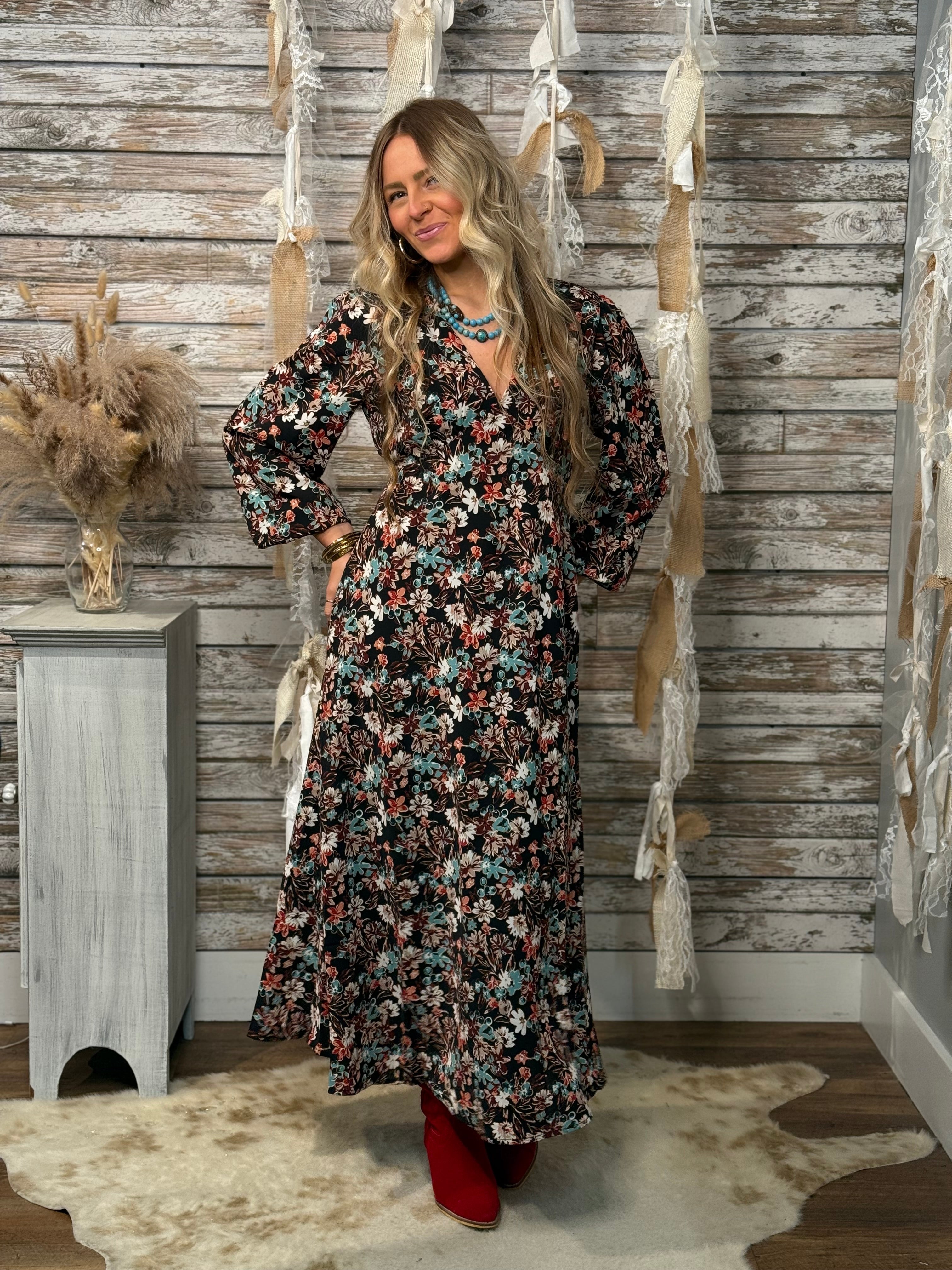 Romantic and effortlessly timeless, The Meadow Muse Midi Dress blooms with charm in a rich floral print that transitions seamlessly through the seasons. Featuring a soft V-neckline, flowy long sleeves with gentle gathering, and a relaxed A-line silhouette, this dress flatters every shape while offering all-day comfort. Pair it with suede boots for fall or heeled sandals for spring soirées — it’s a forever favorite that moves beautifully wherever you go.