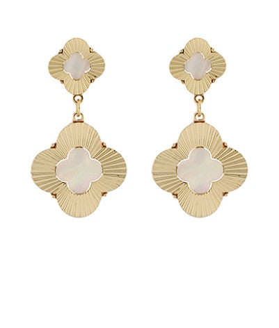 Elegance meets whimsy in these quatrefoil drop earrings, where radiant gold frames a luminous mother-of-pearl center. With their soft shimmer and artful symmetry, they feel both timeless and fresh — like lucky charms dressed for a gala. Perfect for adding polish to your everyday or a graceful glow to evening looks.
