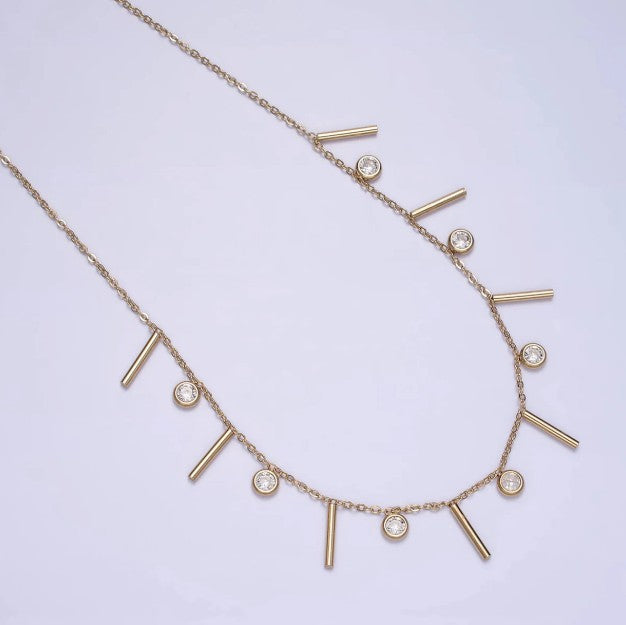 Elevate your everyday with the Glimmer Drop Necklace. This 18-inch stainless steel layering chain features alternating sleek gold bars and bezel-set clear CZ charms for a perfectly playful yet polished vibe. Lightweight, luminous, and effortlessly modern—just the right sparkle for any stack.