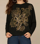 Add a touch of artistry to your everyday look with the Golden Bloom Foil Knit Top. Featuring an intricate metallic floral design that shimmers against a rich black backdrop, this soft knit blends comfort with sophistication. The relaxed batwing sleeves and surplus round neckline give it a flattering, easy fit that’s perfect for both lounging and going out.