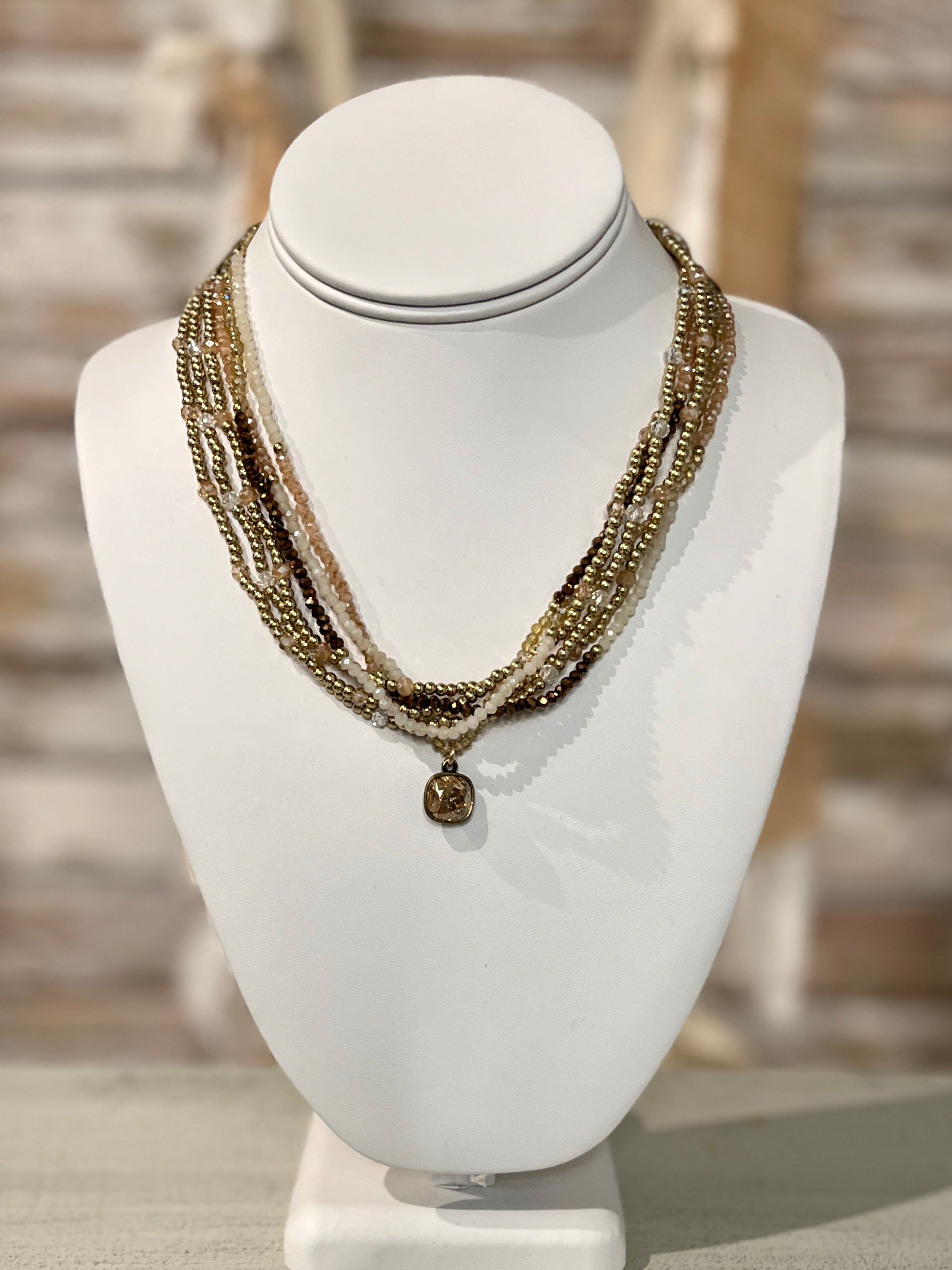 Radiate warmth and shimmer with the Golden Glow Layered Bead Necklace—featuring strands of glistening gold-tone and glass beads, accented with sparkling Austrian crystals and a dainty charm. Light-catching and effortlessly elegant, this versatile piece transitions seamlessly from day to night, adding a soft glow to any outfit.