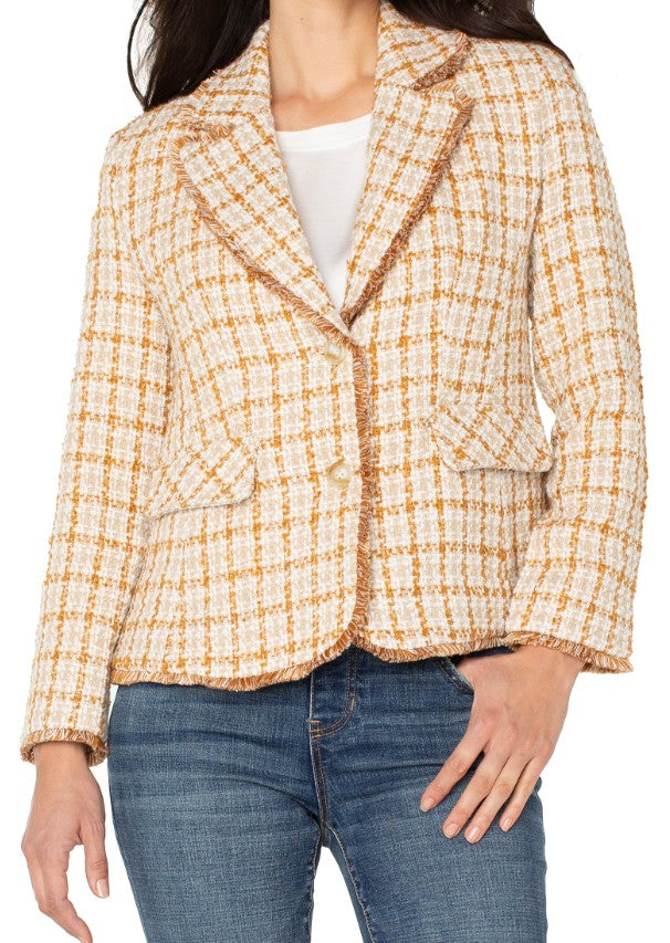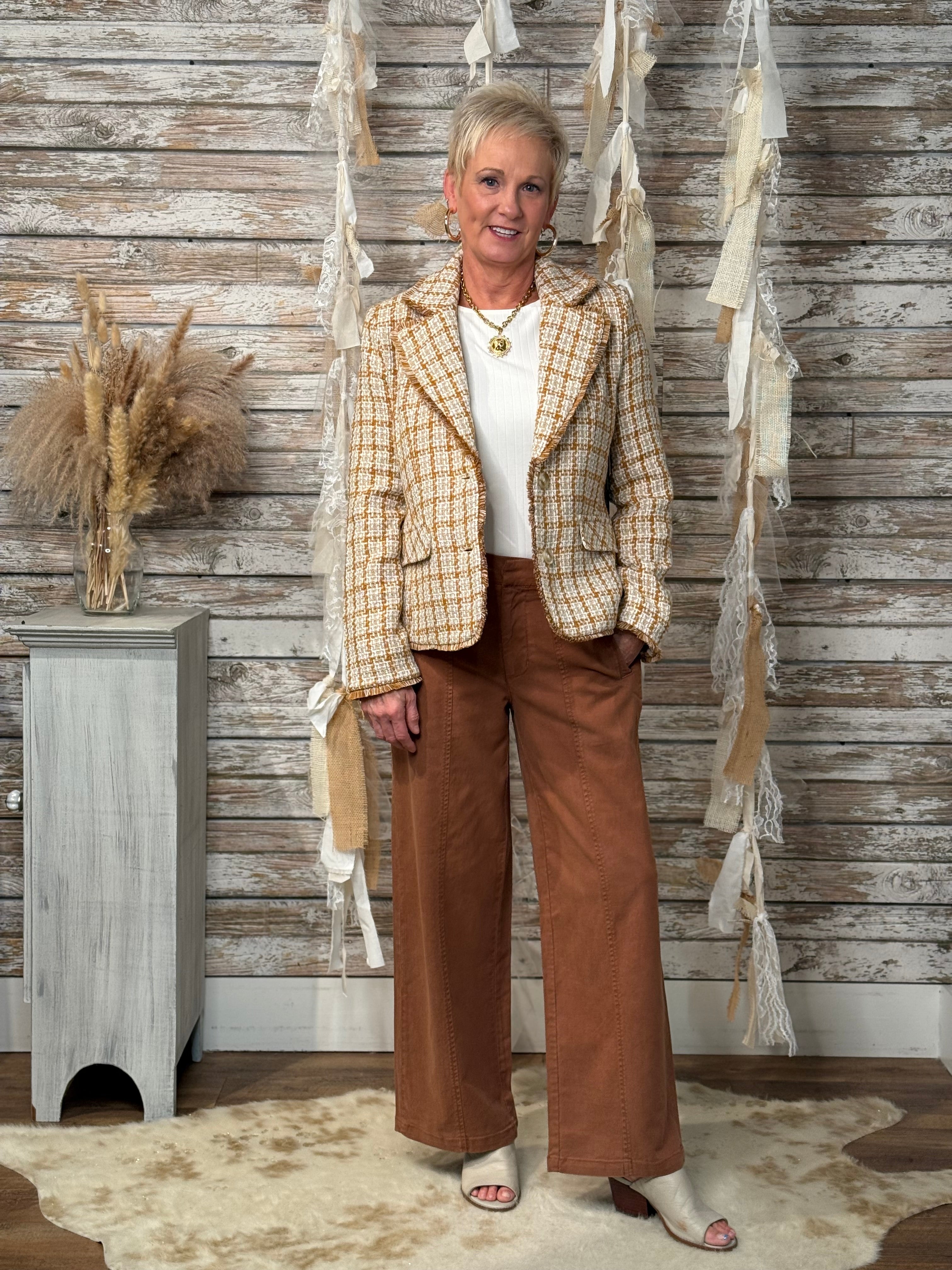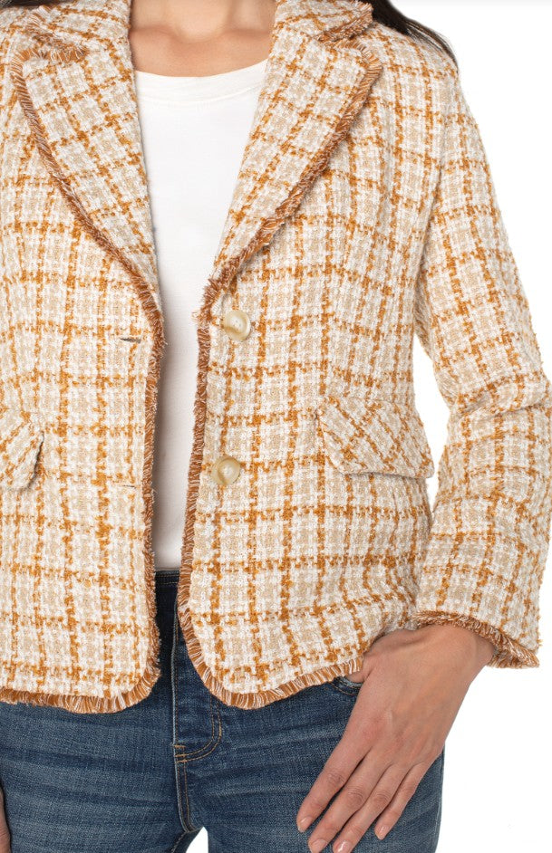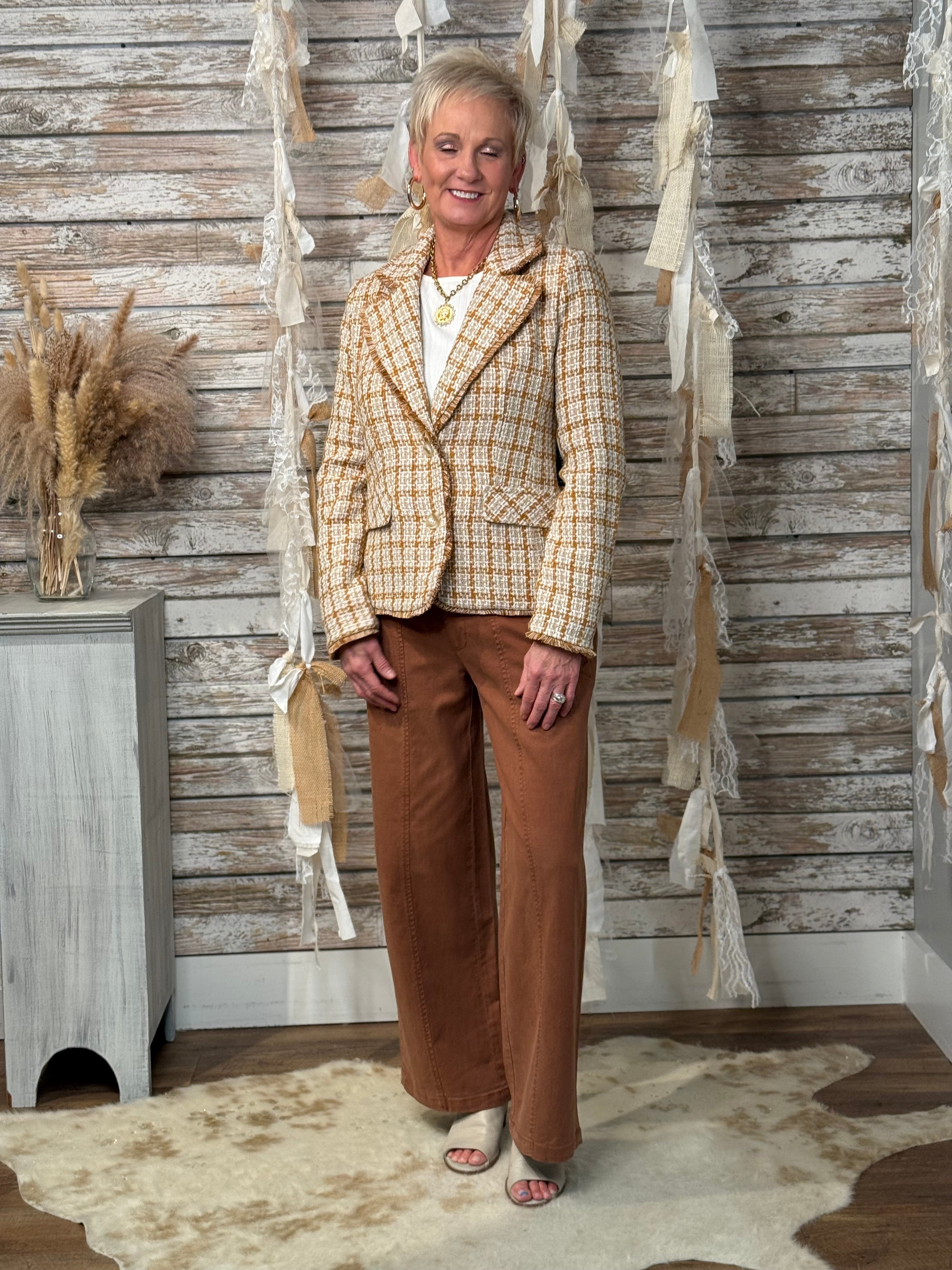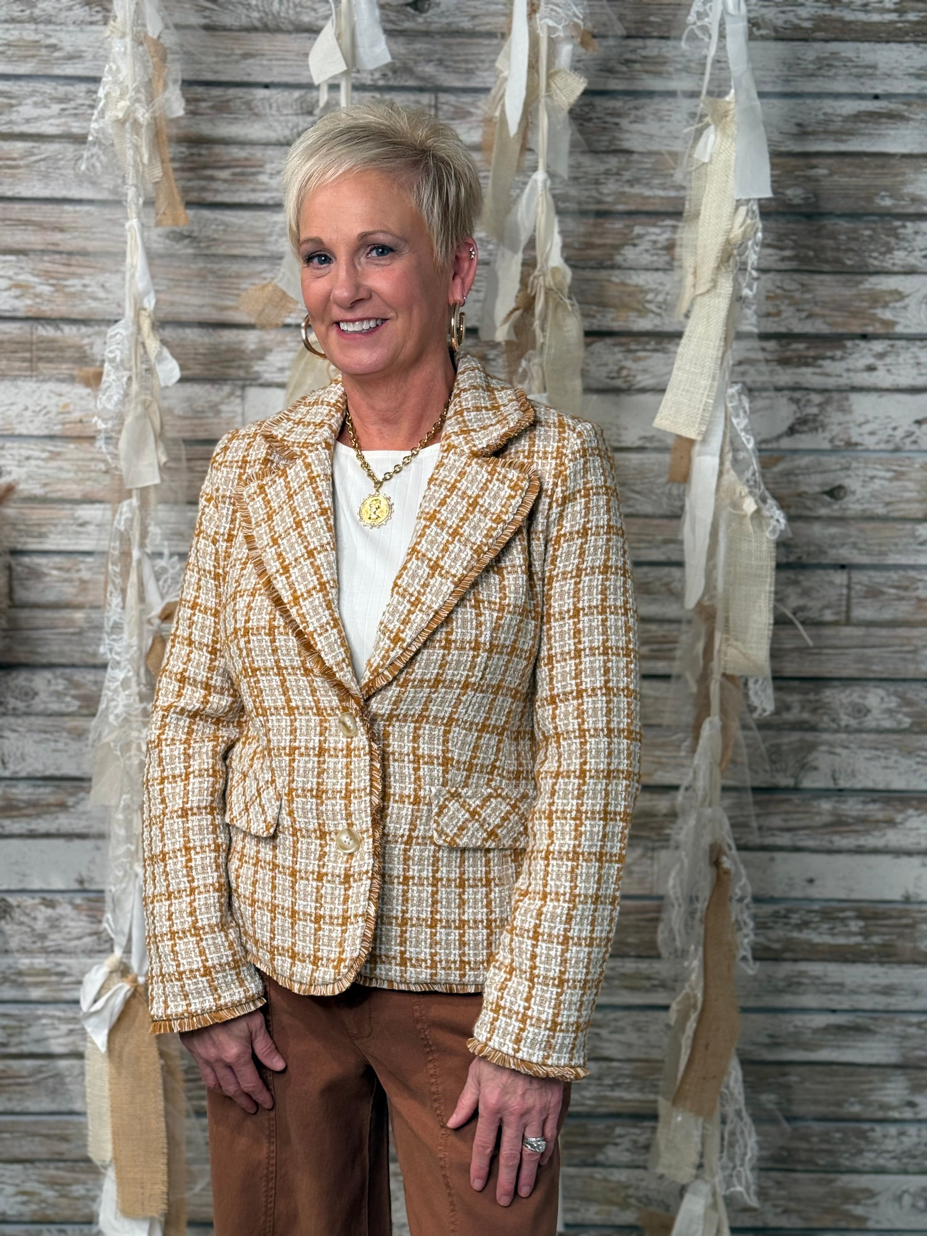 Wrap yourself in timeless elegance with a modern twist. The Golden Hour Tweed Blazer brings polished charm to any outfit, featuring a soft plaid tweed in honey and cream tones with delicate fringe trim for added texture. With its tailored fit, classic lapels, and functional flap pockets, it’s perfect for pairing with jeans for daytime sophistication or dressing up for an evening out.