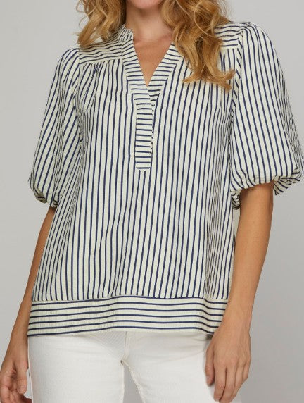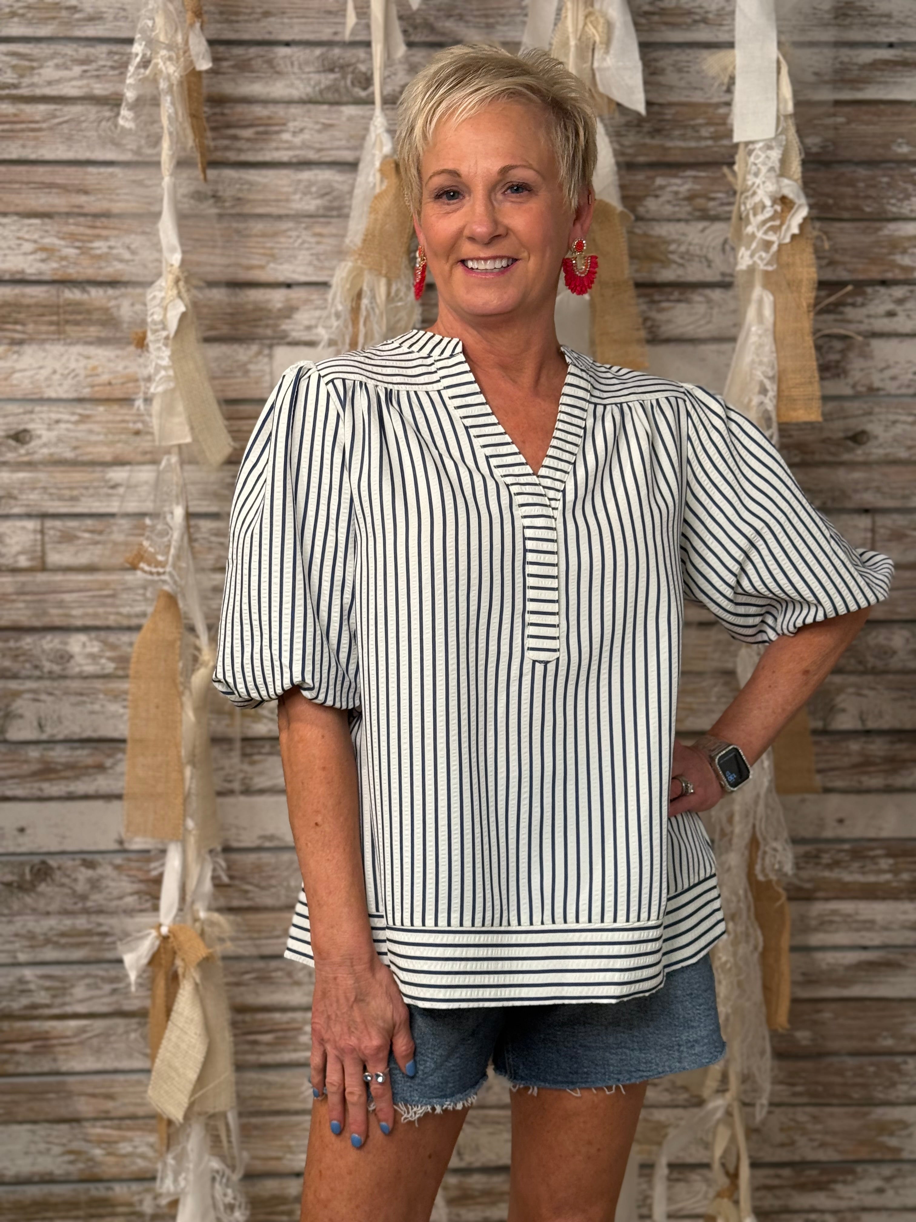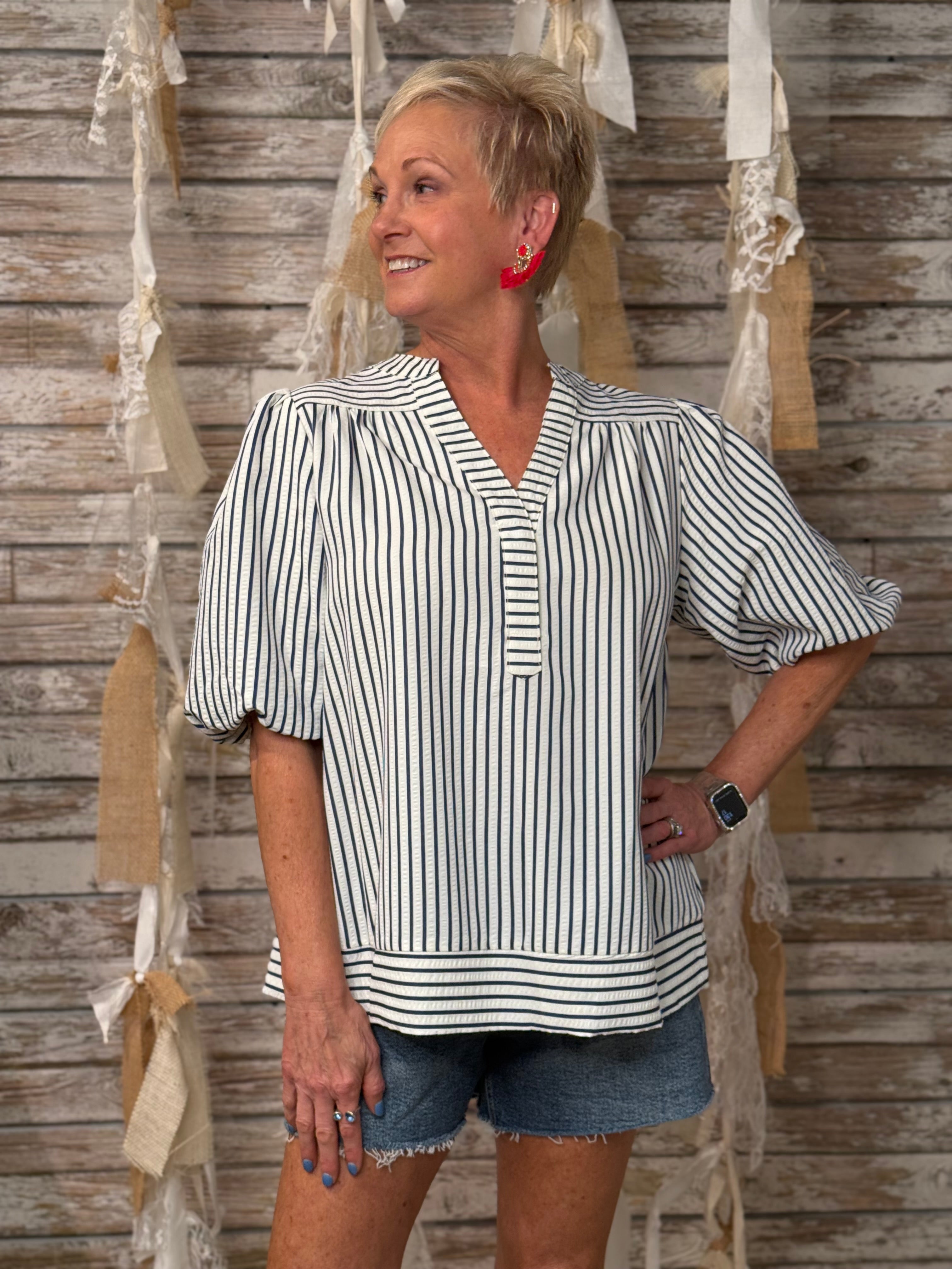 Classic with a coastal twist, the Harbor Stripe Top features crisp vertical navy stripes and charming bubble sleeves for a refined yet relaxed vibe. The split neckline and contrast border hem add tailored touches to this airy woven piece—perfect for pairing with white denim or linen on sunny days by the shore. 100% polyester