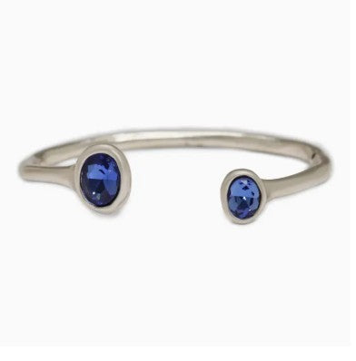 Minimalist with a hint of mystique, the Indigo Orbit Cuff features an open-ended design with two bezel-set deep blue crystals. Crafted from polished silver-tone brass, this handcrafted bracelet adds a sleek, celestial touch to your stack—or makes a subtle solo statement.