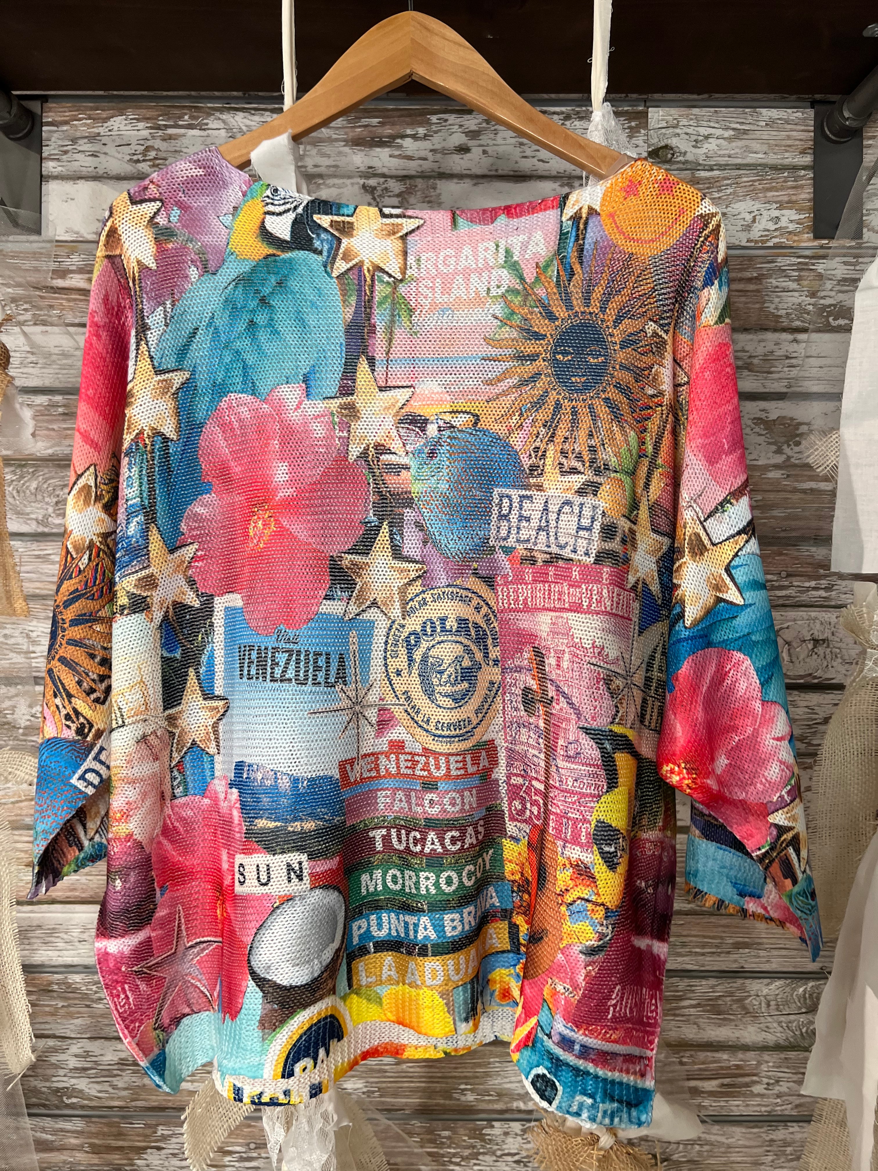 Take a tropical escape without leaving your closet in our Island Postcard Sweater. Bursting with vibrant colors, parrots, sunbursts, and beachy prints, this lightweight knit feels like a wearable vacation souvenir. Perfect for layering over swimwear or pairing with jeans, it’s your go-to piece for bringing sunny, carefree vibes wherever you go.