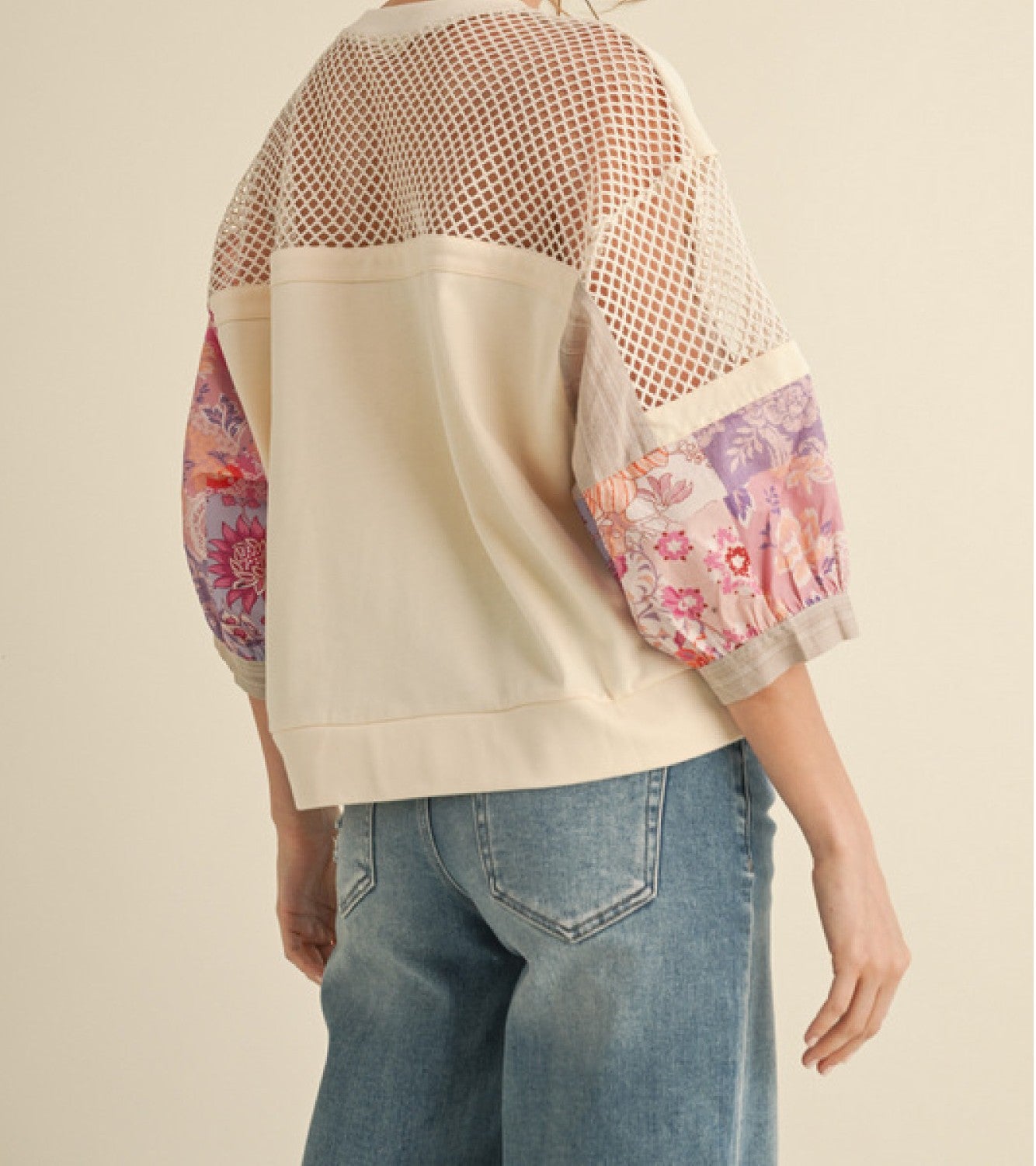 Cozy meets crafty charm. This unique top features a blend of soft, comfy fabric with delicate crochet lace and patchwork details, creating a one-of-a-kind, vintage-inspired look.