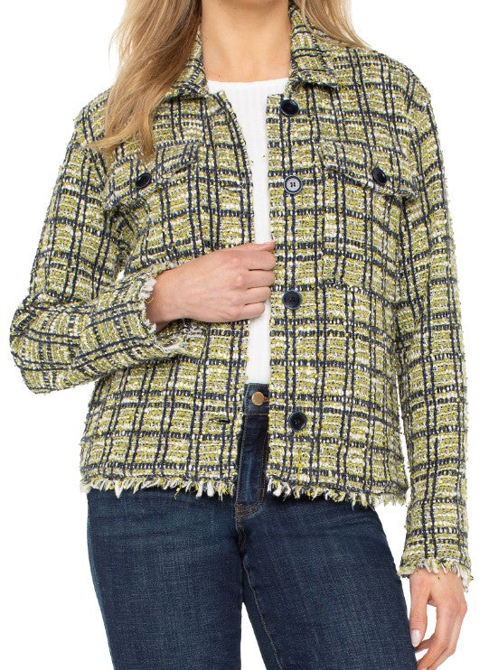 Add a pop of polish to your wardrobe with our Lemon Zest Tweed Jacket — where classic sophistication meets modern charm. This textured plaid piece blends cheerful yellow tones with navy and cream for a fresh, statement-making look. Designed with button-front closure, chest pockets, and soft frayed edges for a touch of playful edge.