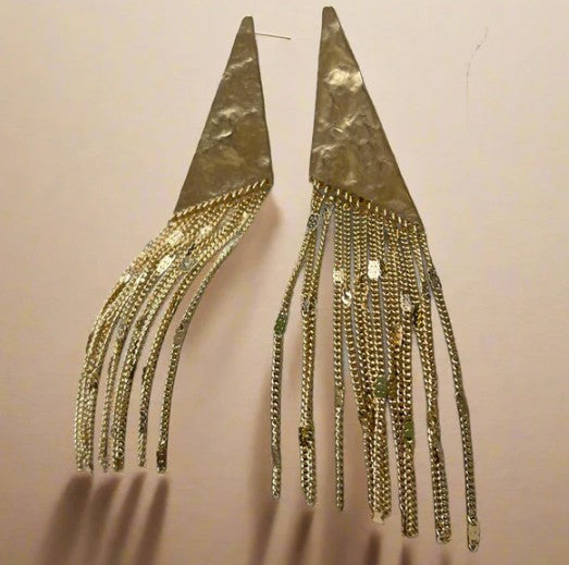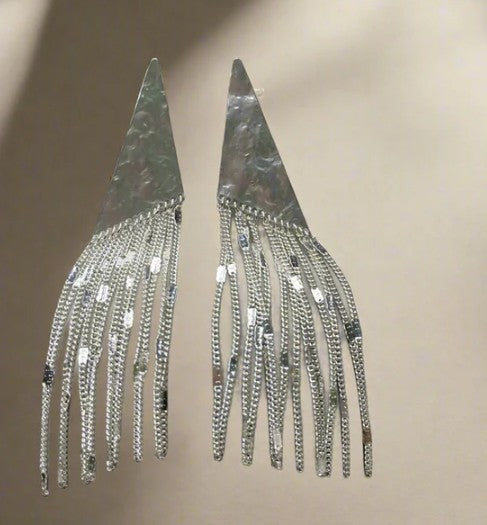 Make waves with the Liquid Fringe Statement Earrings—featuring hammered metal triangle tops and cascading chain tassels that move with you. Available in gleaming gold or silver, these bold beauties add instant drama and modern edge to any look. Lightweight yet striking, they’re your go-to pair for nights out, special occasions, and anytime you want to shine.